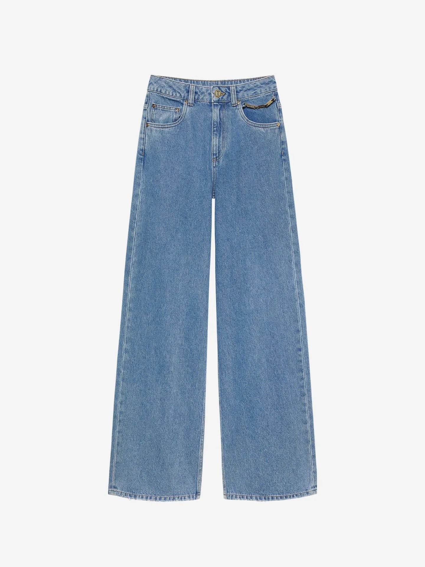 Calça jeans de cintura alta com detalhe de corrente e bolsos. Possui fechamento com zíper e botão e pernas retas.