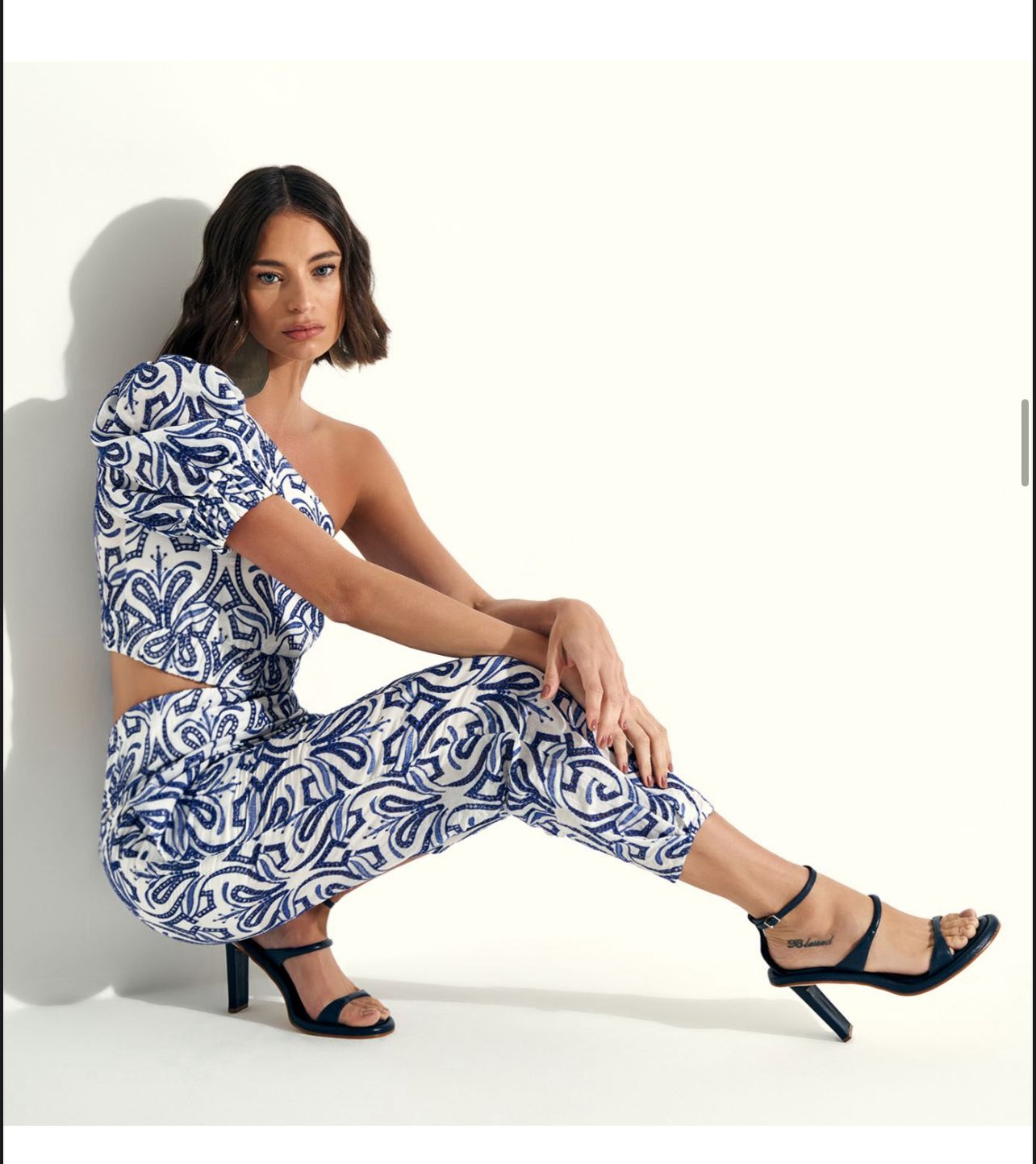 Design: Cintura alta, modelagem ampla, estampa em laise,