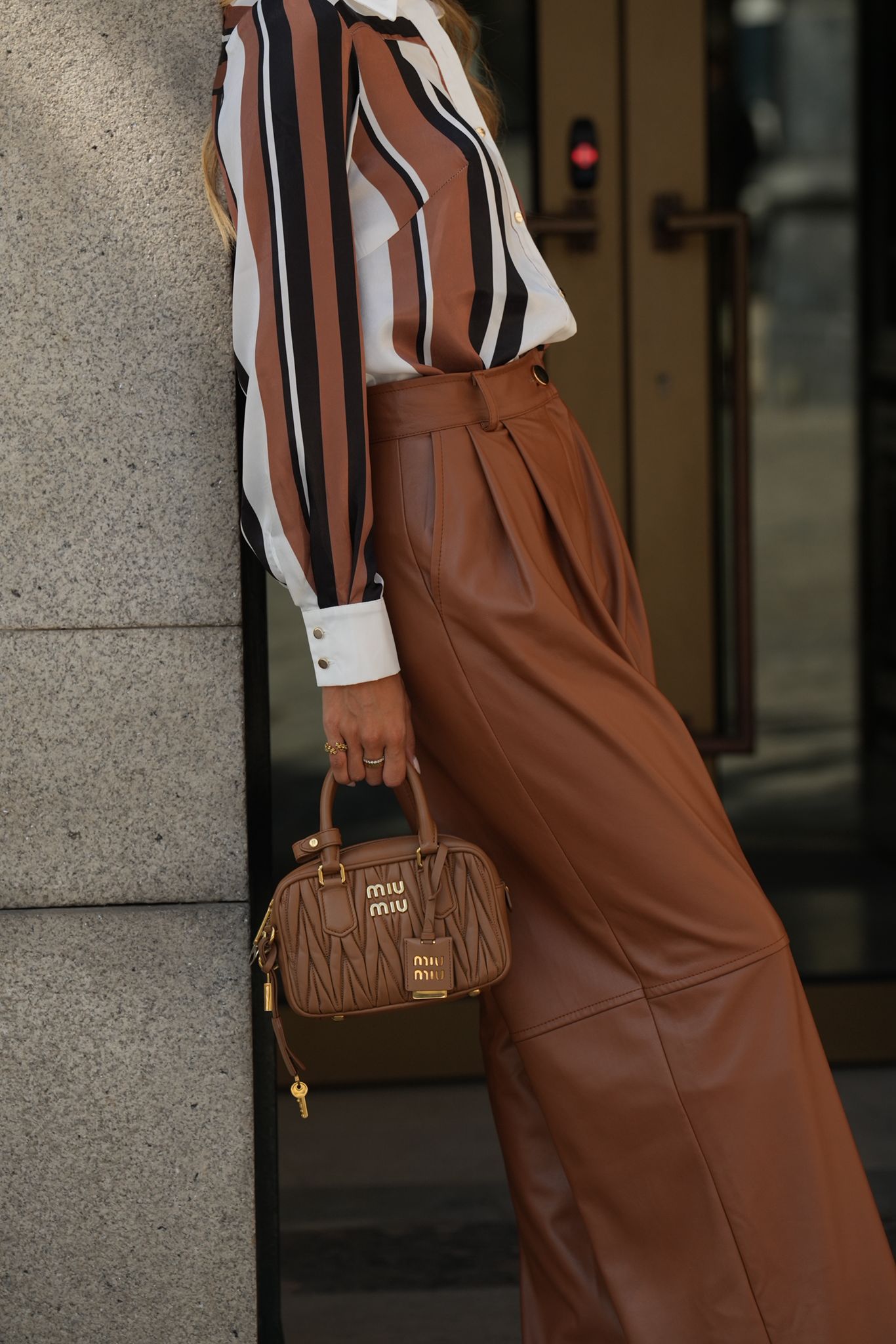 Calças de corte largo em eco pele macia, com acabamento mate e textura flexível. A cintura média e as pregas frontais criam estrutura e volume equilibrado, mantendo conforto e movimento. Fecho frontal com botão e passantes de cinto completam uma construção precisa, pensada para coordenados de linhas limpas ou combinações de contraste.