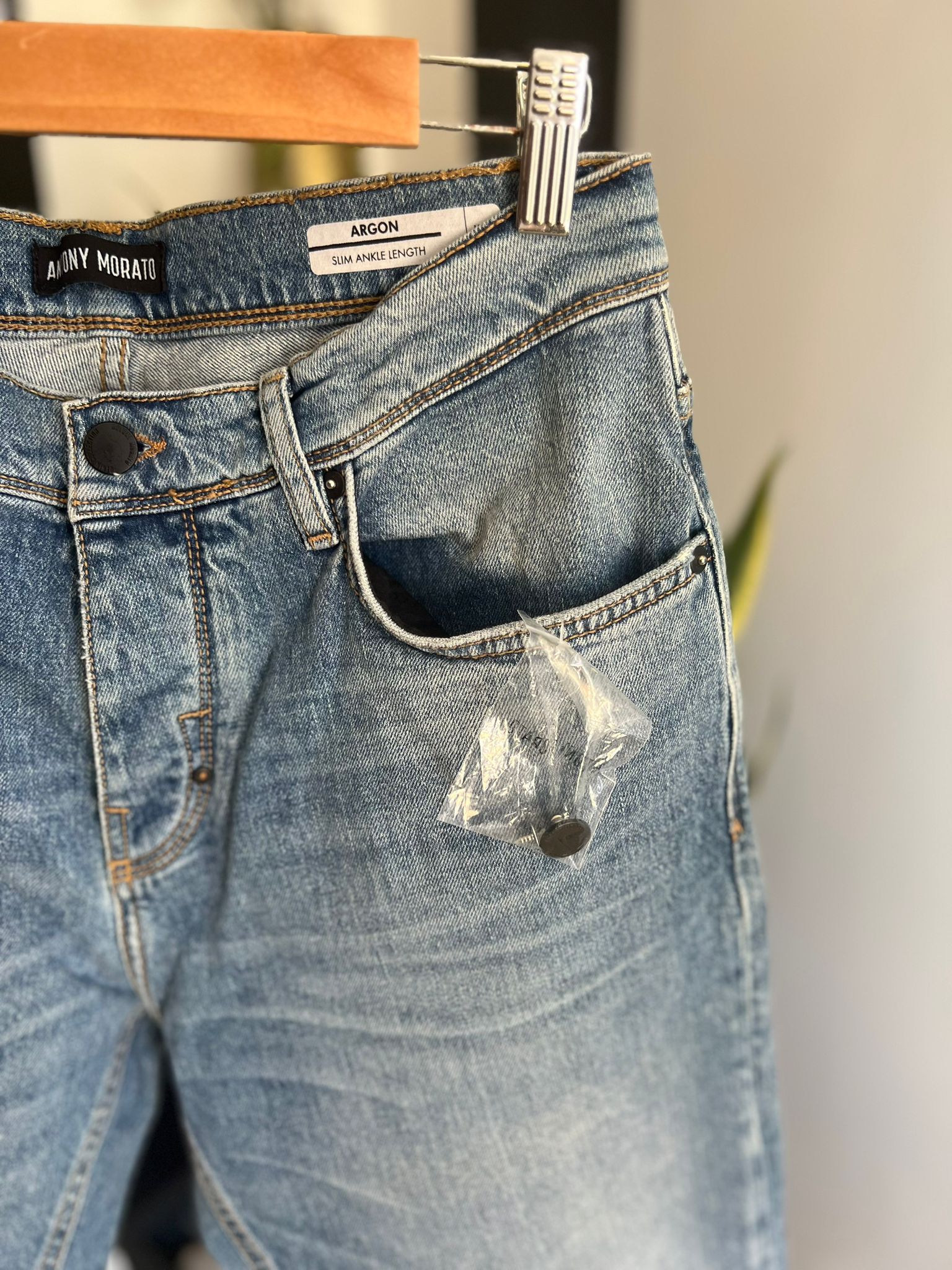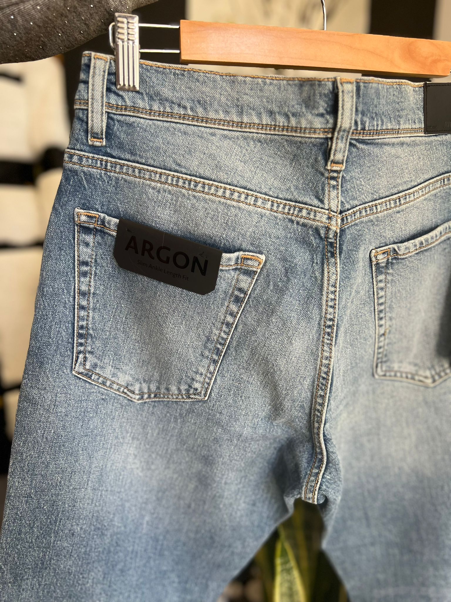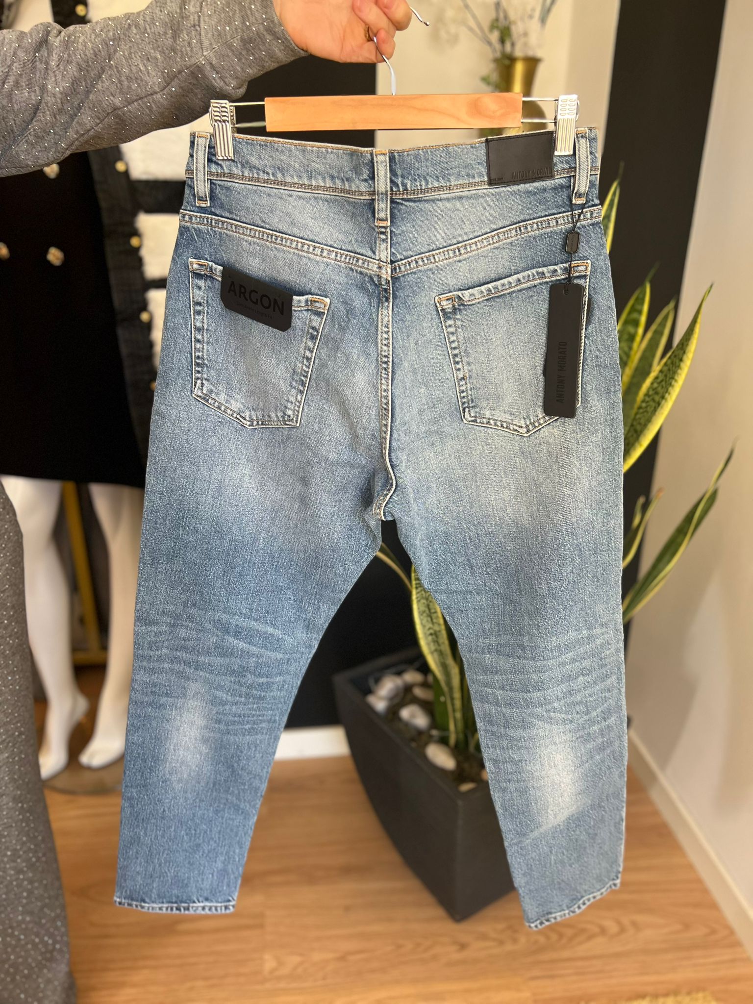 Produzidas em denim de alta qualidade, apresentam lavagem azul média com ligeiro efeito usado, costuras em destaque e detalhes cuidadosamente trabalhados, mantendo a identidade premium da marca. Na parte traseira, contam com etiqueta emborrachada ARGON, reforçando o toque contemporâneo do modelo.