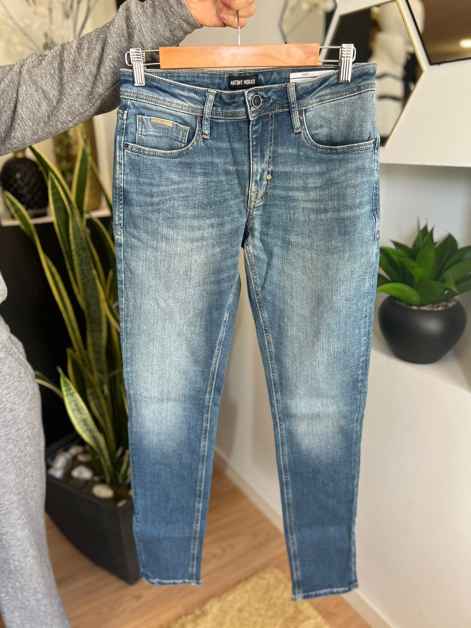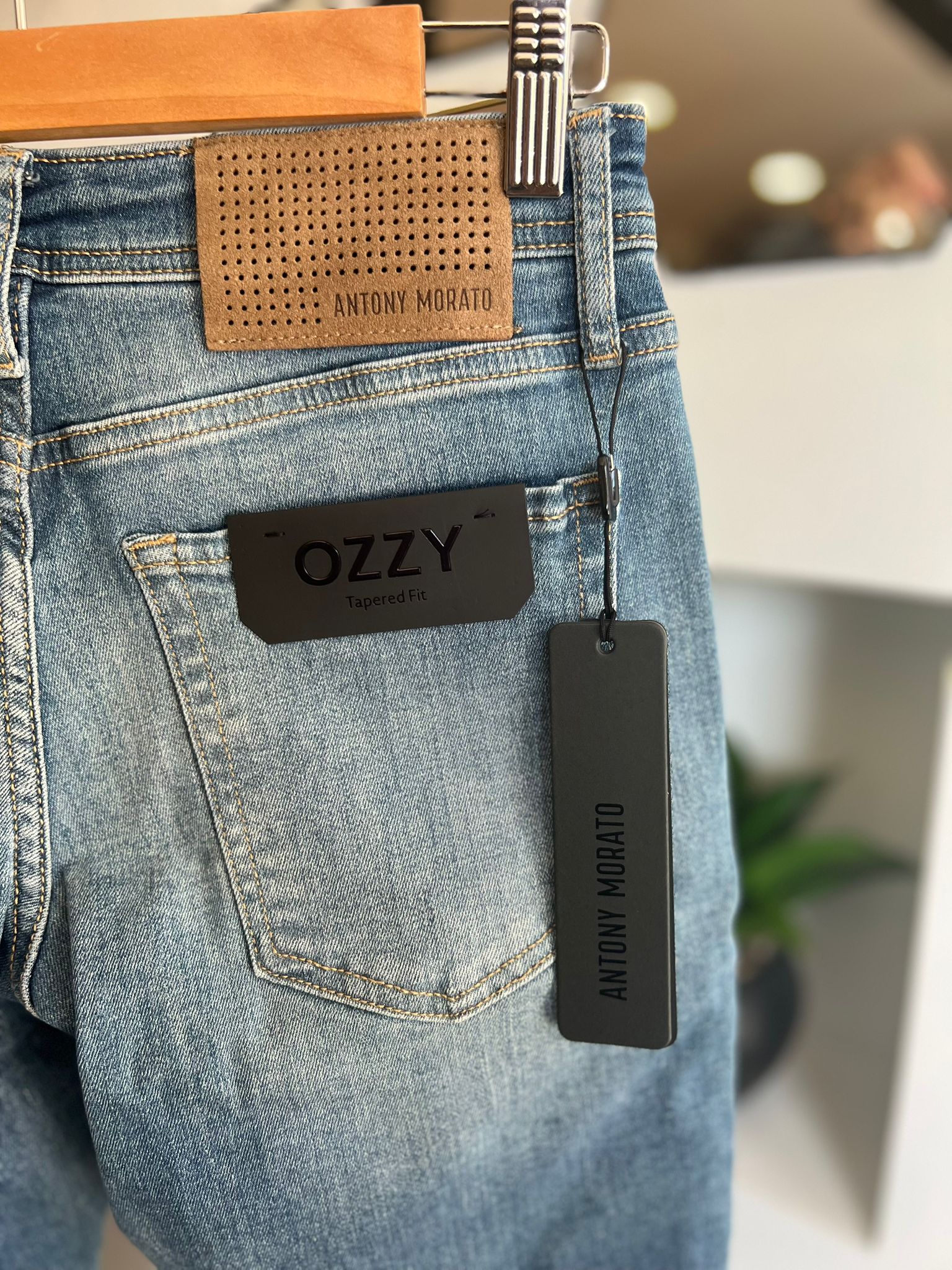 Com uma lavagem azul média e ligeiro efeito desgastado, este modelo apresenta detalhes de assinatura da marca, como costuras reforçadas, etiqueta em pele perfurada na parte traseira e placa metálica ANTONY MORATO no bolso frontal.