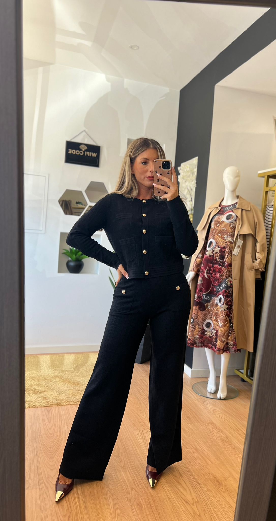 Conforto e sofisticação em uma só peça. Estas calças em malha estruturada apresentam cintura média com elástico para maior conforto, bolsos frontais decorados com botões dourados em relevo e corte reto que alonga a silhueta.