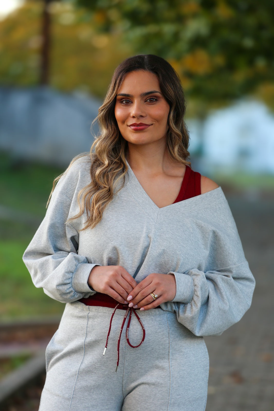 Calças jogger Sahoco em cinzento claro, com cintura elástica em contraste bordeaux e cordão ajustável. Confortáveis e modernas, com costuras vincadas que conferem estrutura ao design. Perfeitas para um look casual chic, que alia sofisticação ao espírito descontraído.