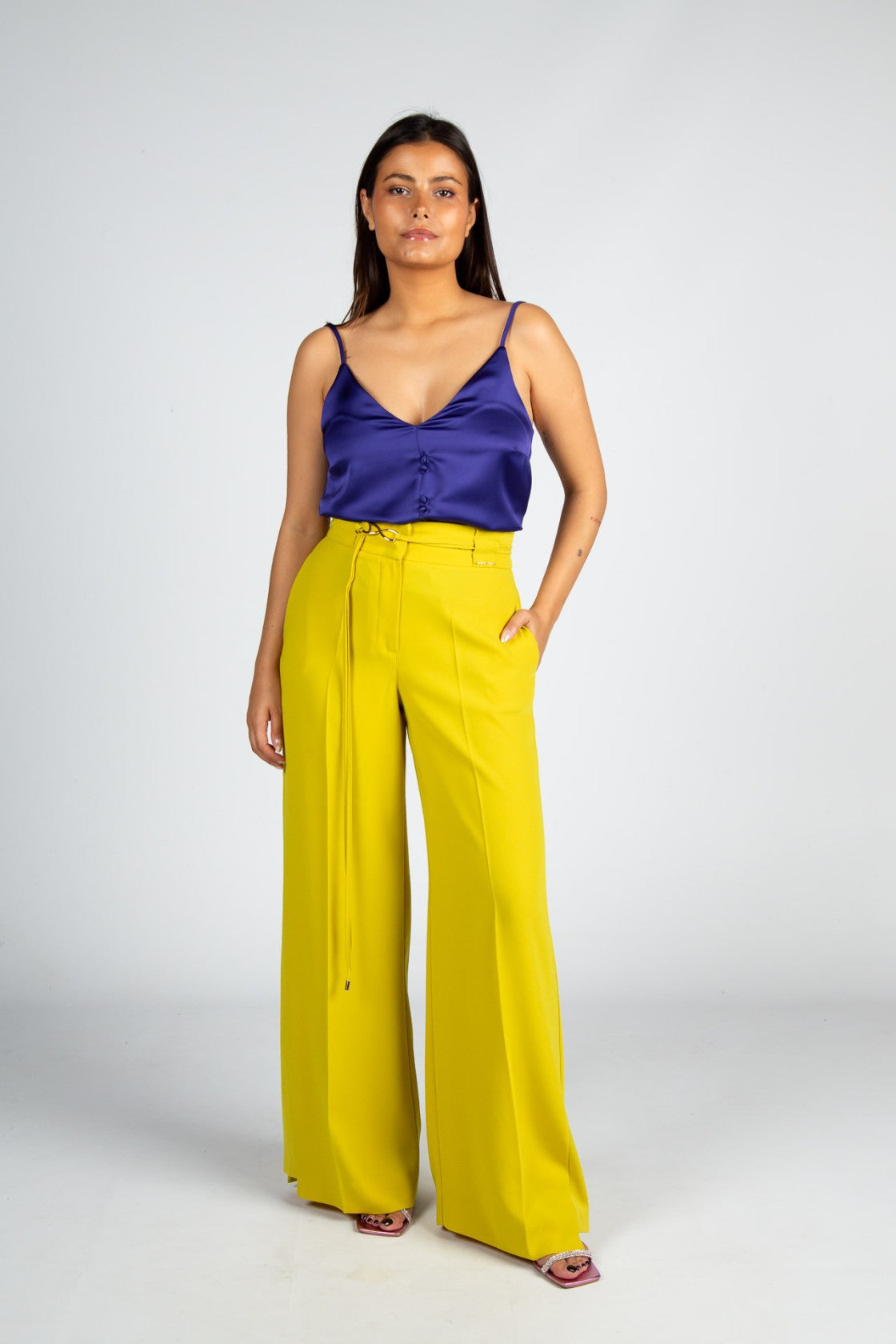 Apaixone-se pelas pantalonas Silvina Campos em amarelo, uma peça indispensável em qualquer roupeiro moderno. Com um design fluido e corte amplo, estas calças combinam elegância e conforto, tornando-se perfeitas para várias ocasiões. Apresentam dois bolsos falsos de vivo atrás, dois bolsos de chapa frontais e apertam com fecho éclair frontal e gancho metálico ocultos.