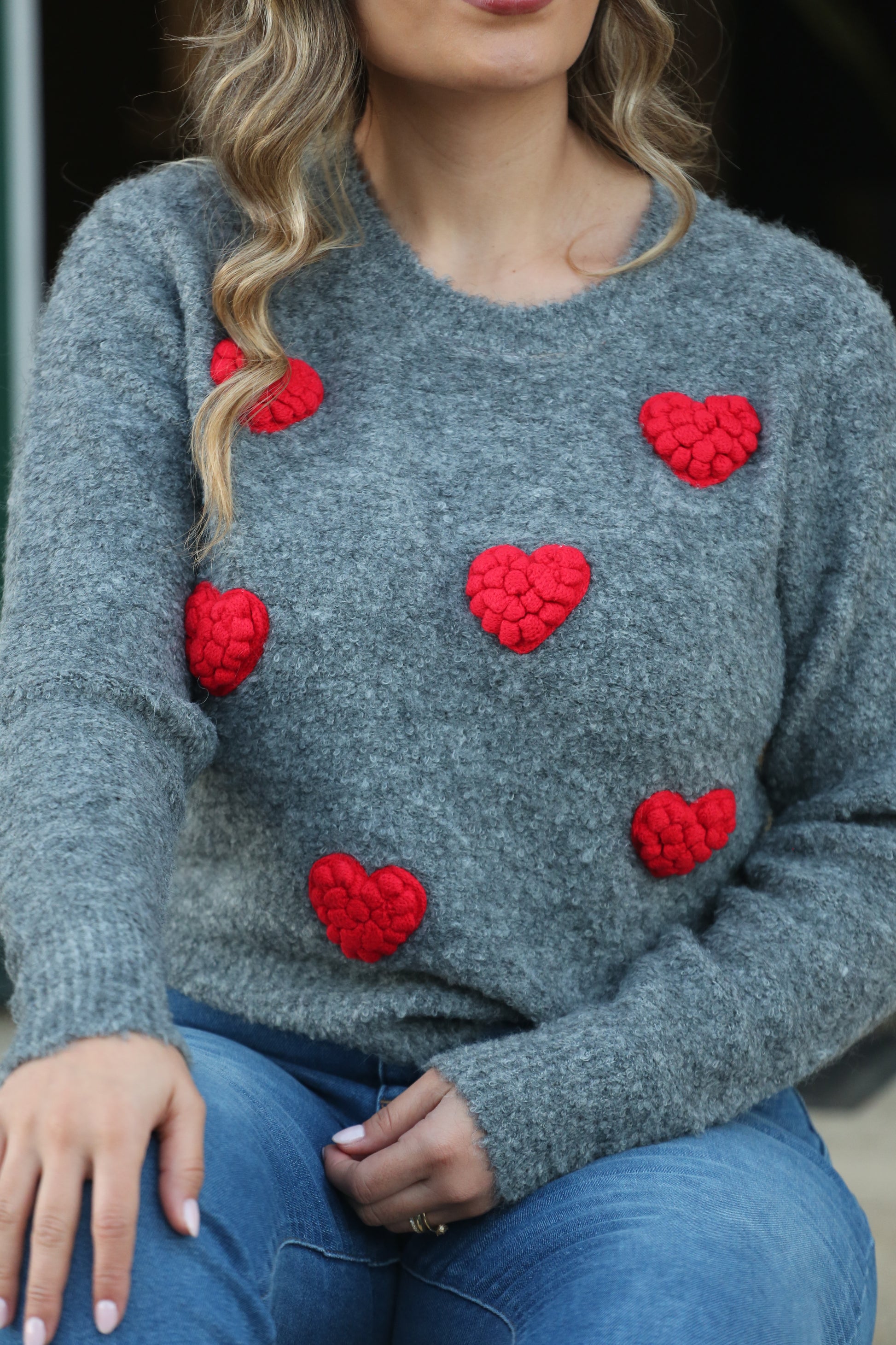 Confortável, macia e cheia de estilo, esta camisola cinzenta destaca-se pelos corações em relevo vermelhos, que trazem um toque divertido e feminino ao look.
