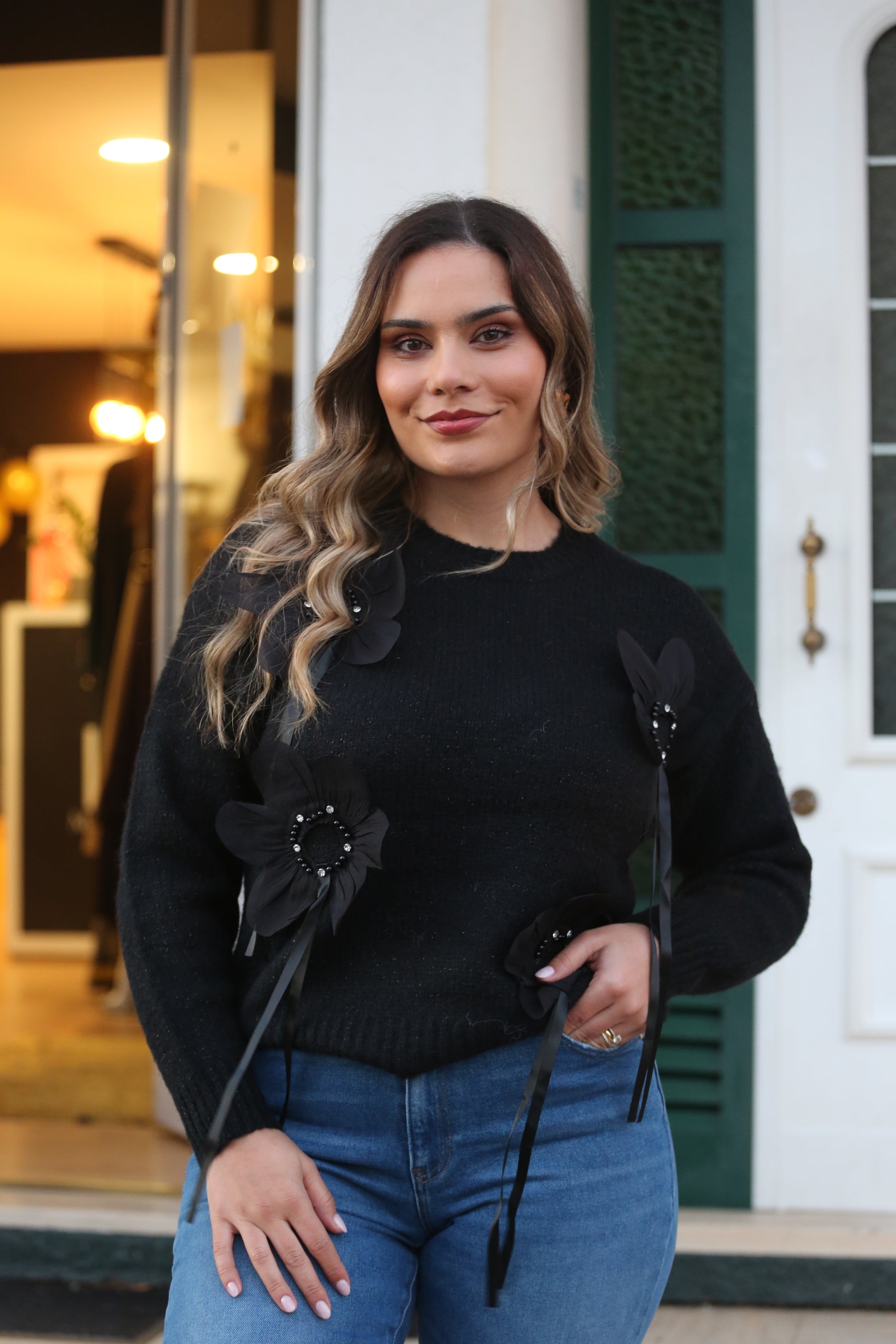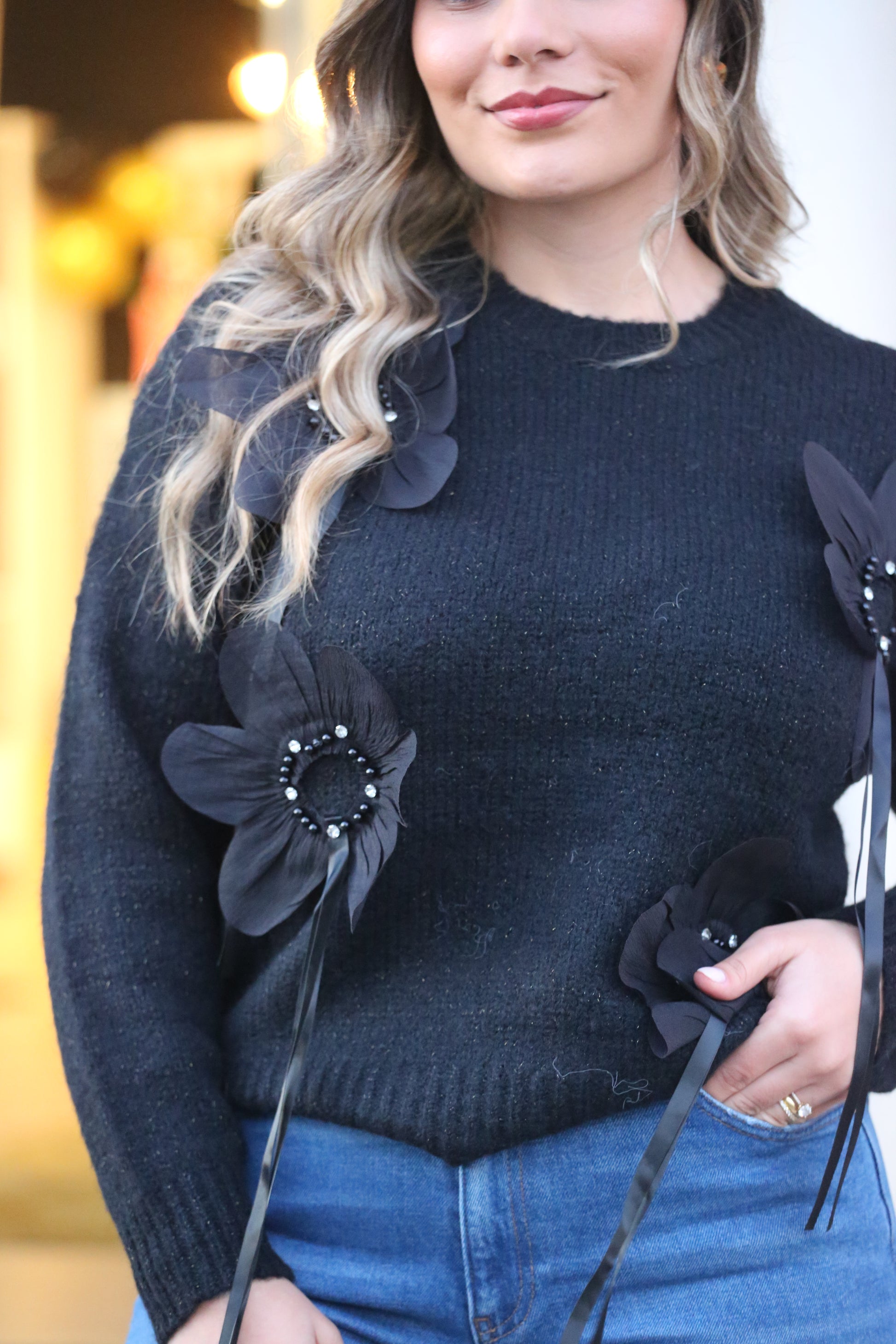 Esta camisola preta destaca-se pelos detalhes florais em tecido e pérolas aplicadas à mão, que transformam uma peça básica numa escolha cheia de estilo e personalidade.