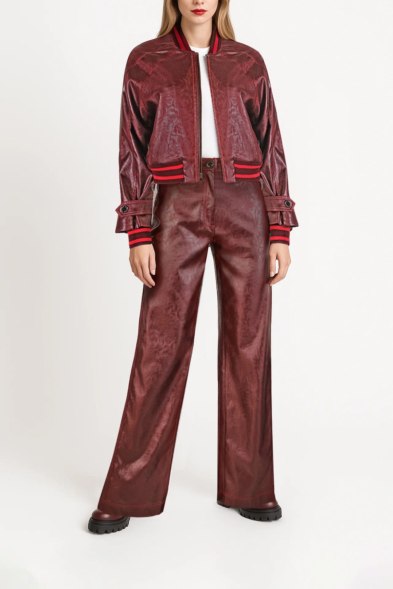Bomber em eco pele de textura suave e acabamento luminoso, reinterpretando o estilo desportivo com uma abordagem sofisticada. Apresenta gola, punhos e cós em malha canelada com riscas contrastantes, além de fecho frontal com fecho de correr metálico. As mangas estruturadas e os punhos ajustáveis com botão acrescentam personalidade. Uma peça statement que combina o conforto urbano com a atitude glam da estação.