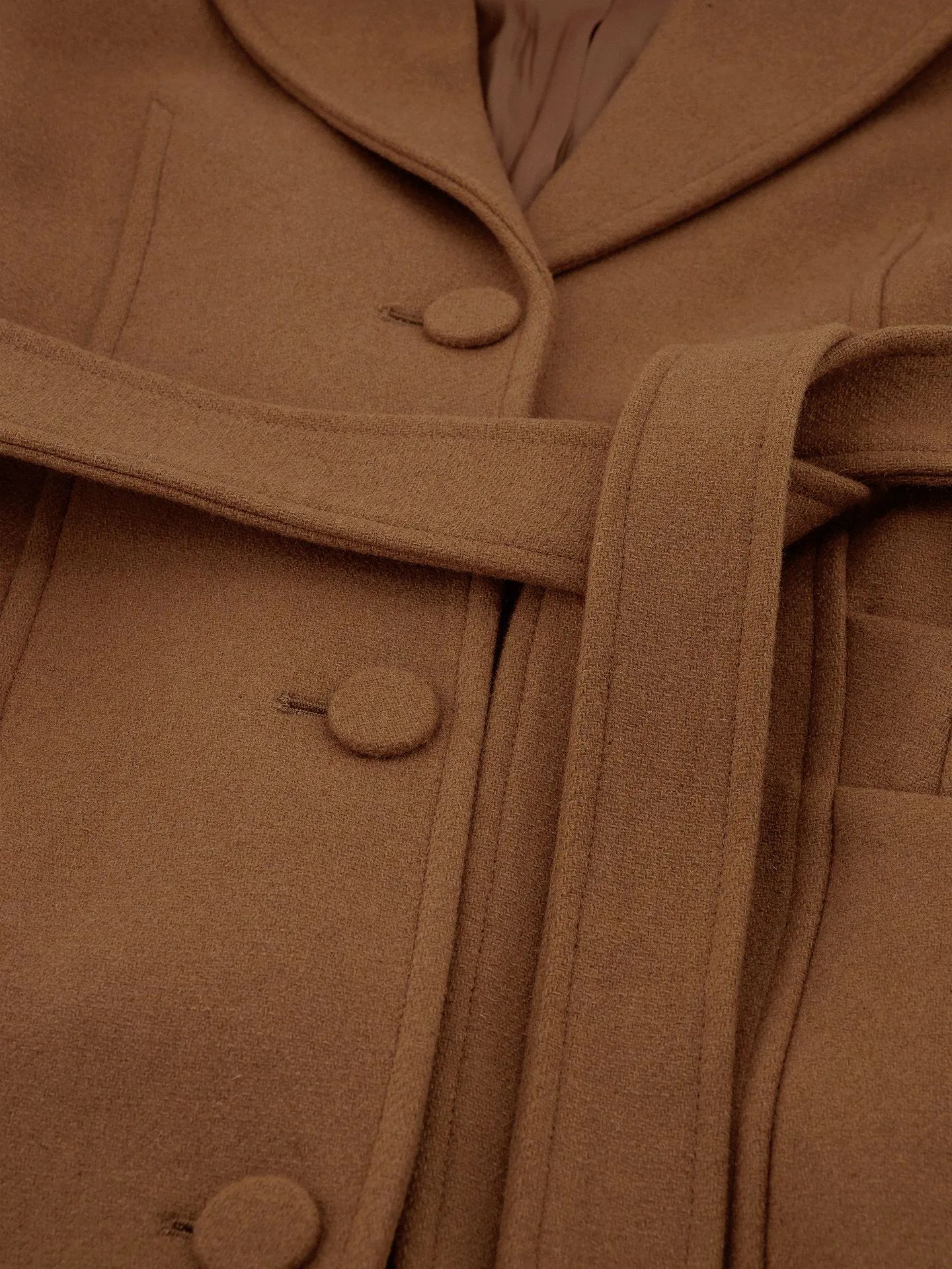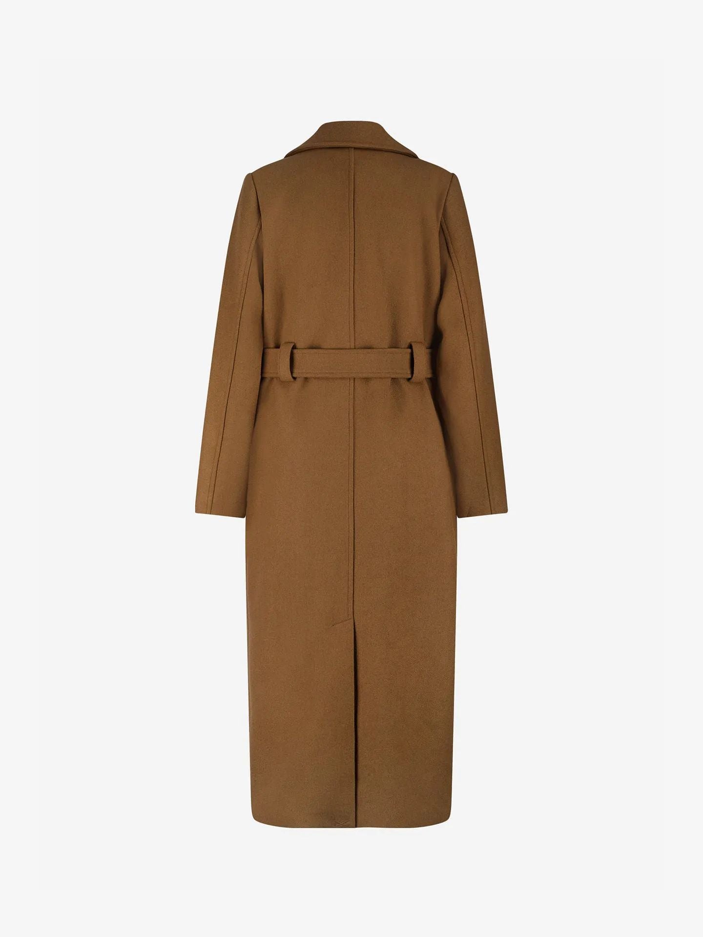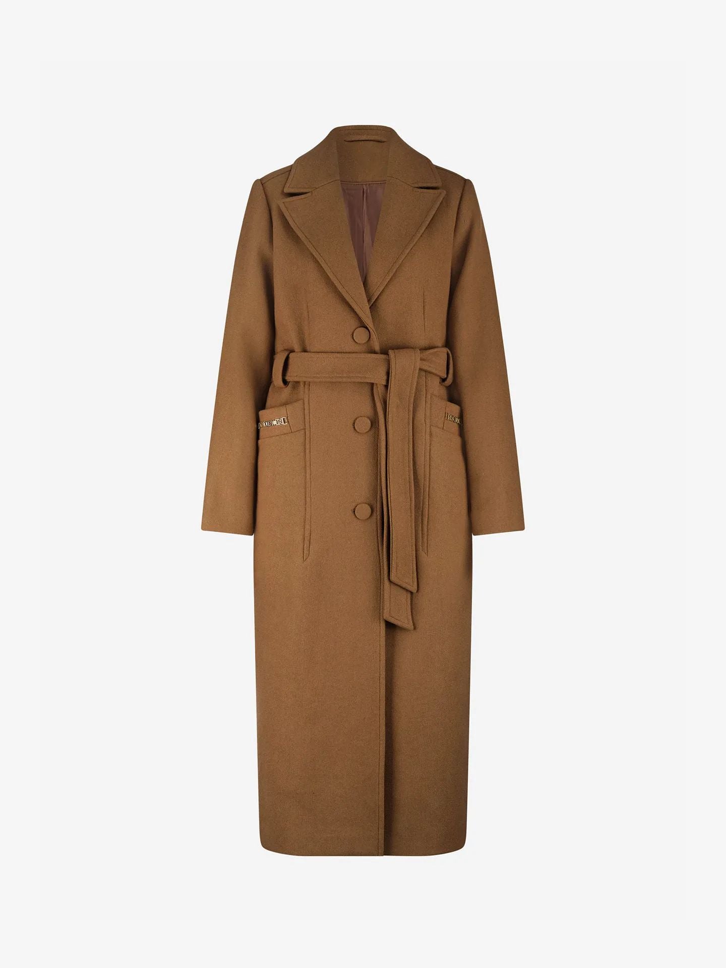 Casaco comprido em mistura de lã com gola, cinto e detalhes em corrente. O casaco possui bolsos, fechamento por botões e modelagem solta.