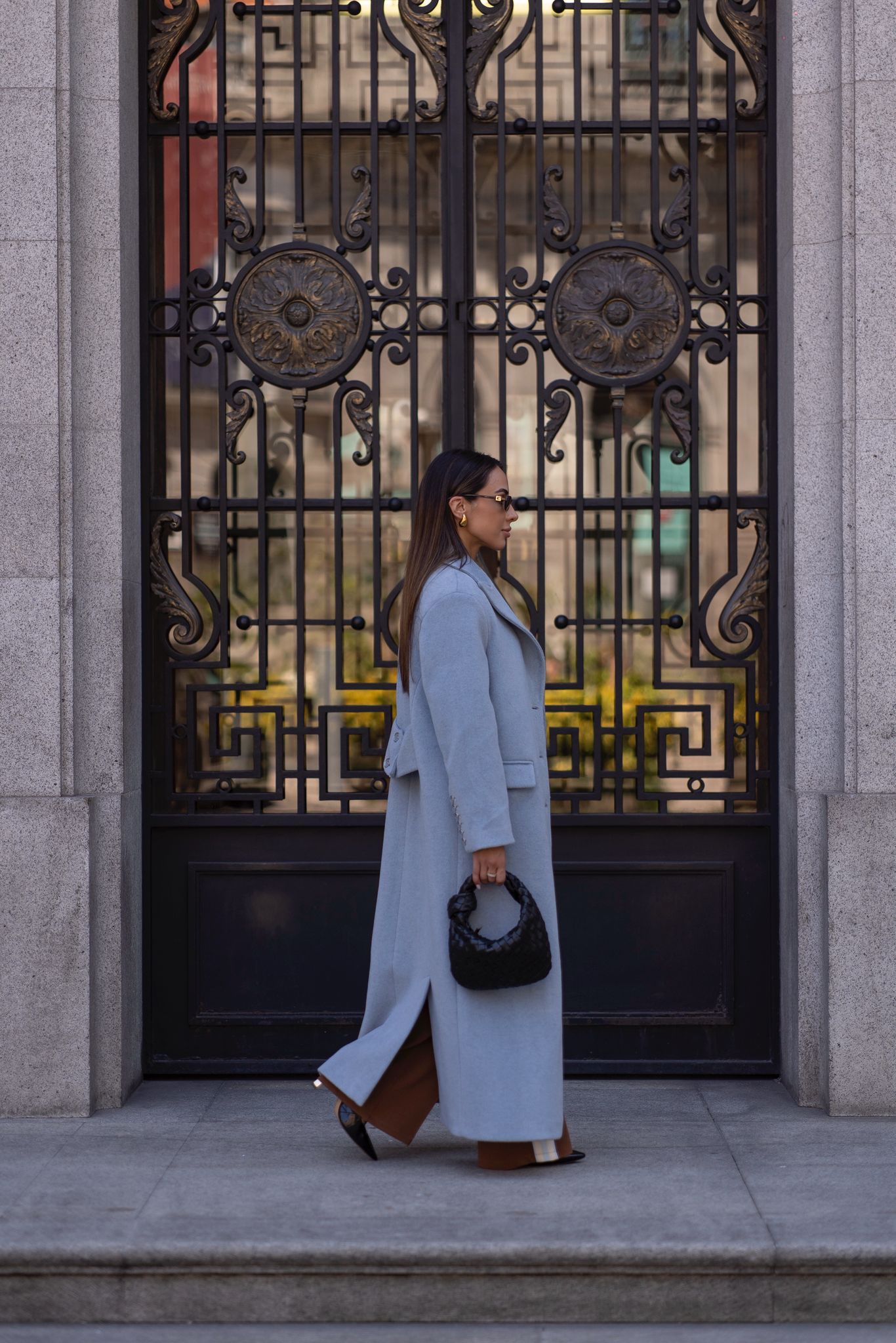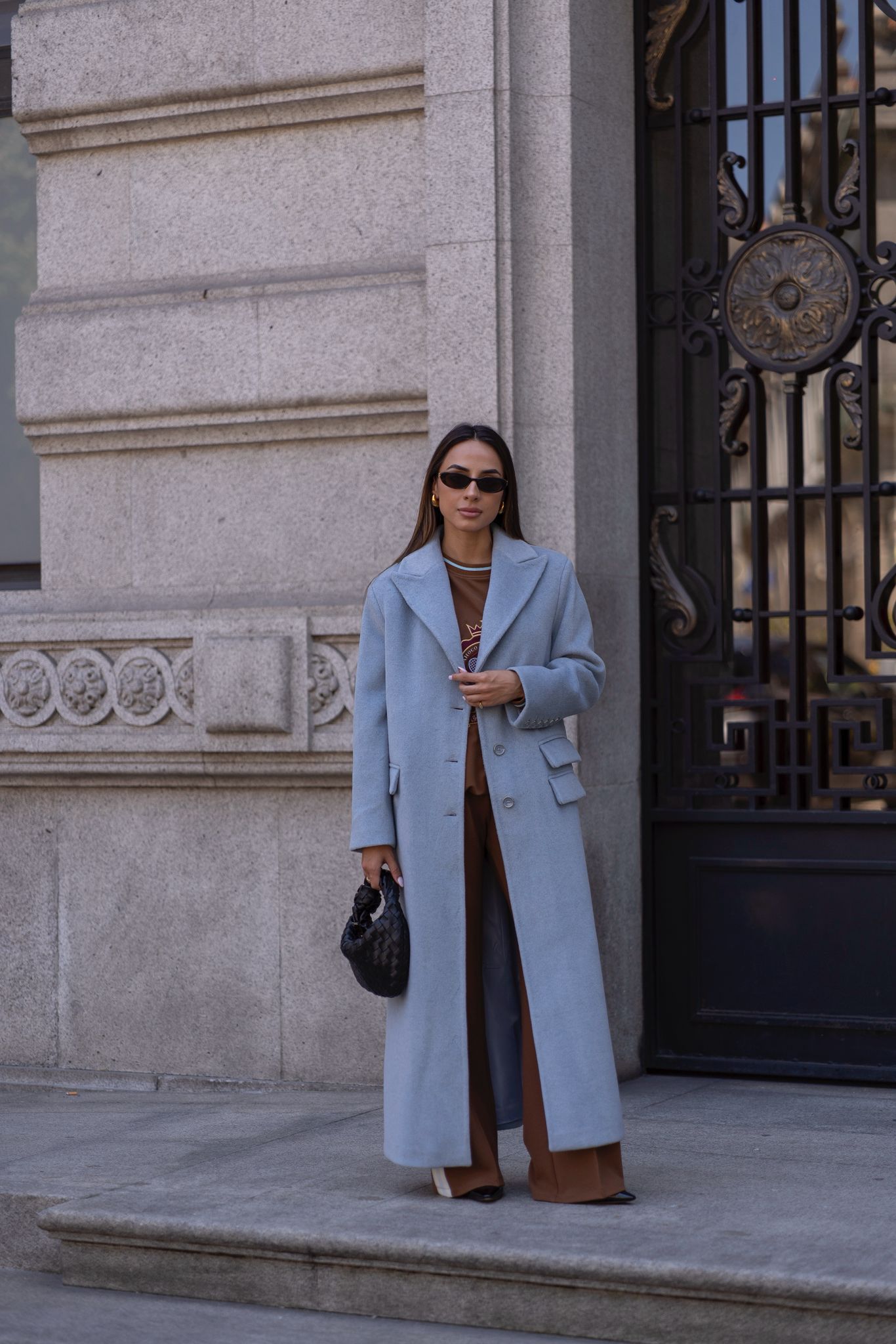 Este sobretudo longo em tom azul serenity é perfeito para compor looks sofisticados nos dias mais frios, trazendo um ar contemporâneo e atemporal.