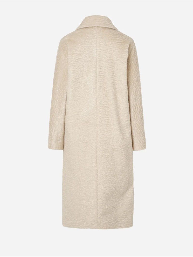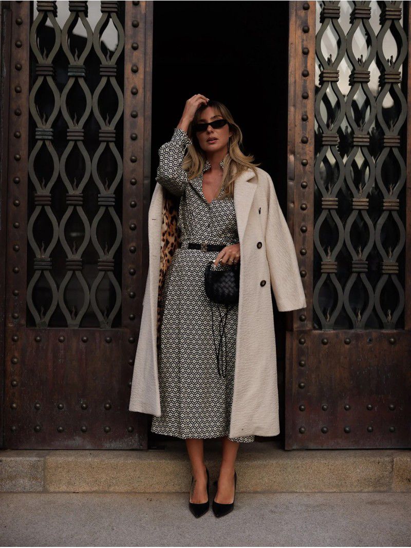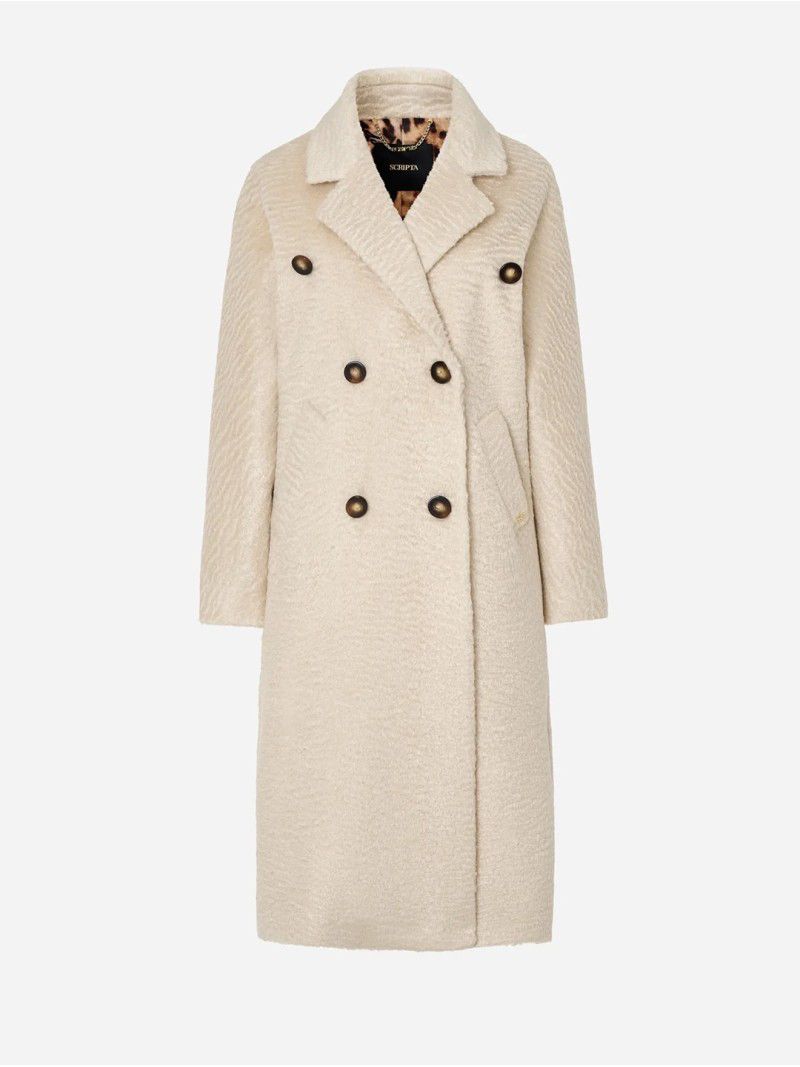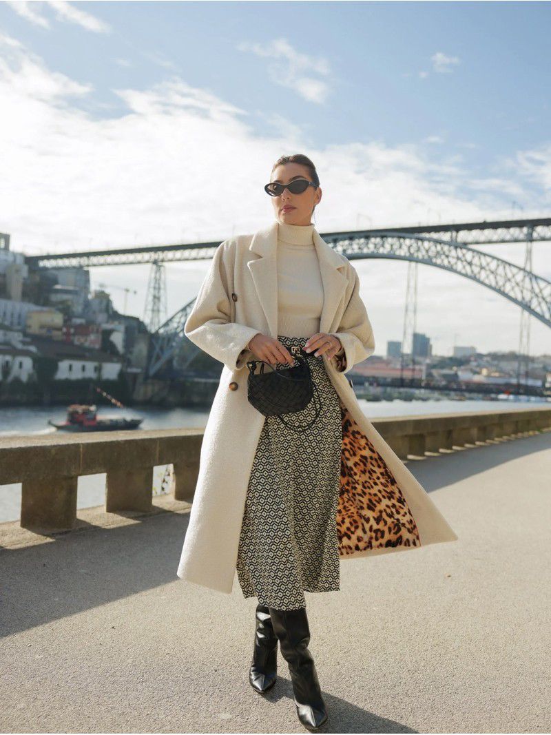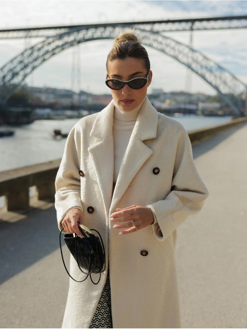 Casaco comprido em tecido fantasia com gola de abas e manga morcego comprida. Possui bolsos quadrados nas laterais. A frente do casaco cruza e aperta com botões em contraste. O fitting da peça é oversize.