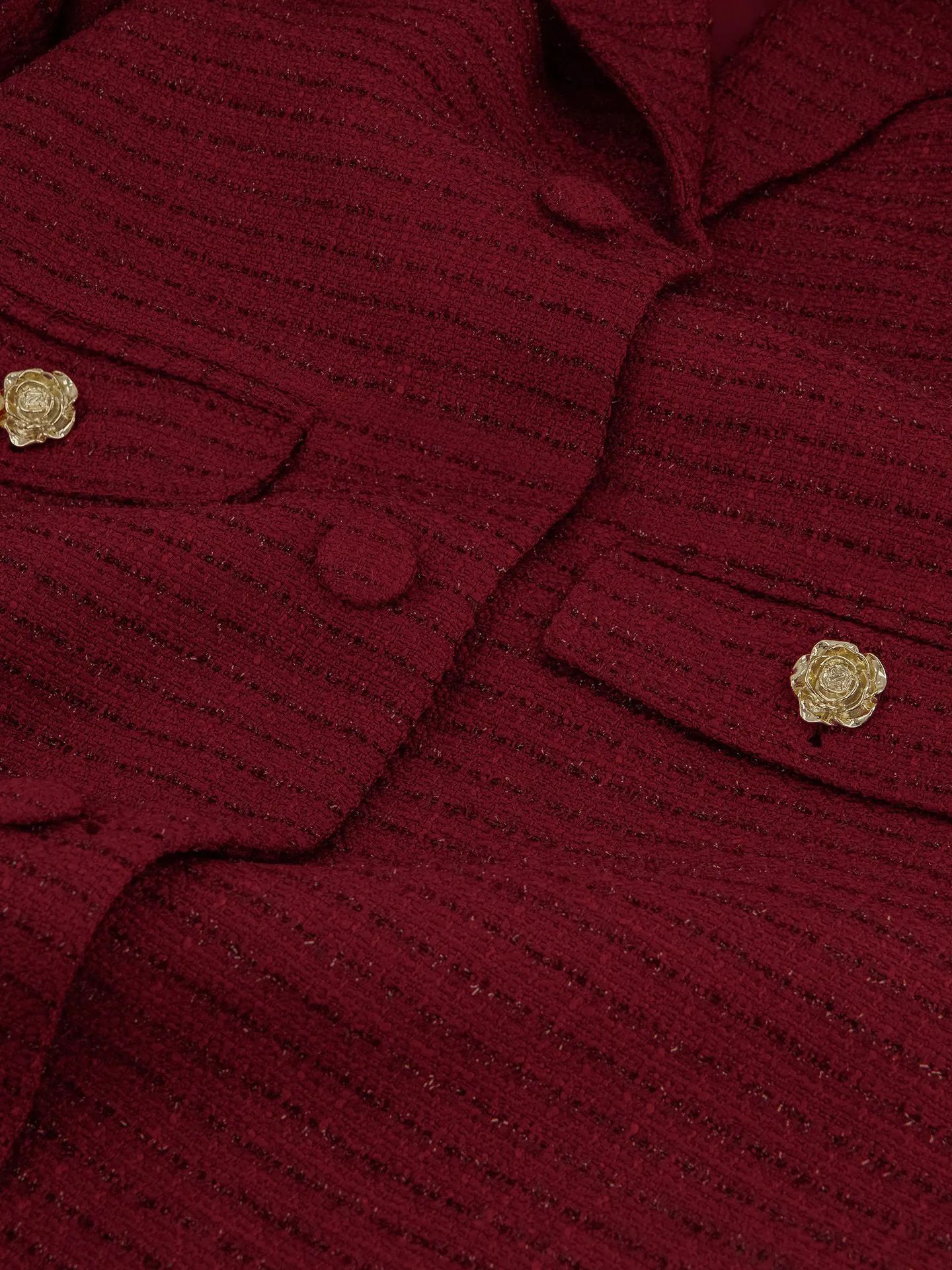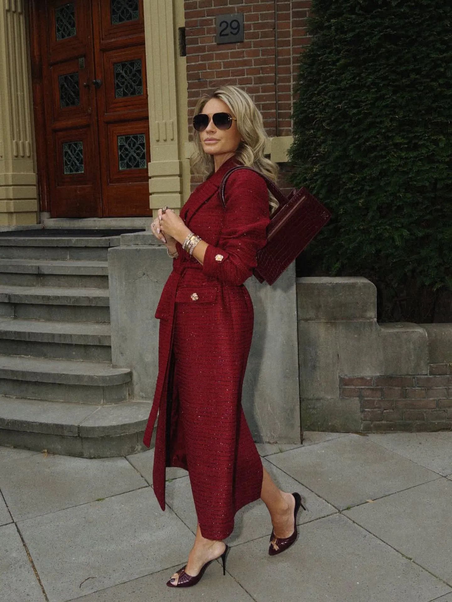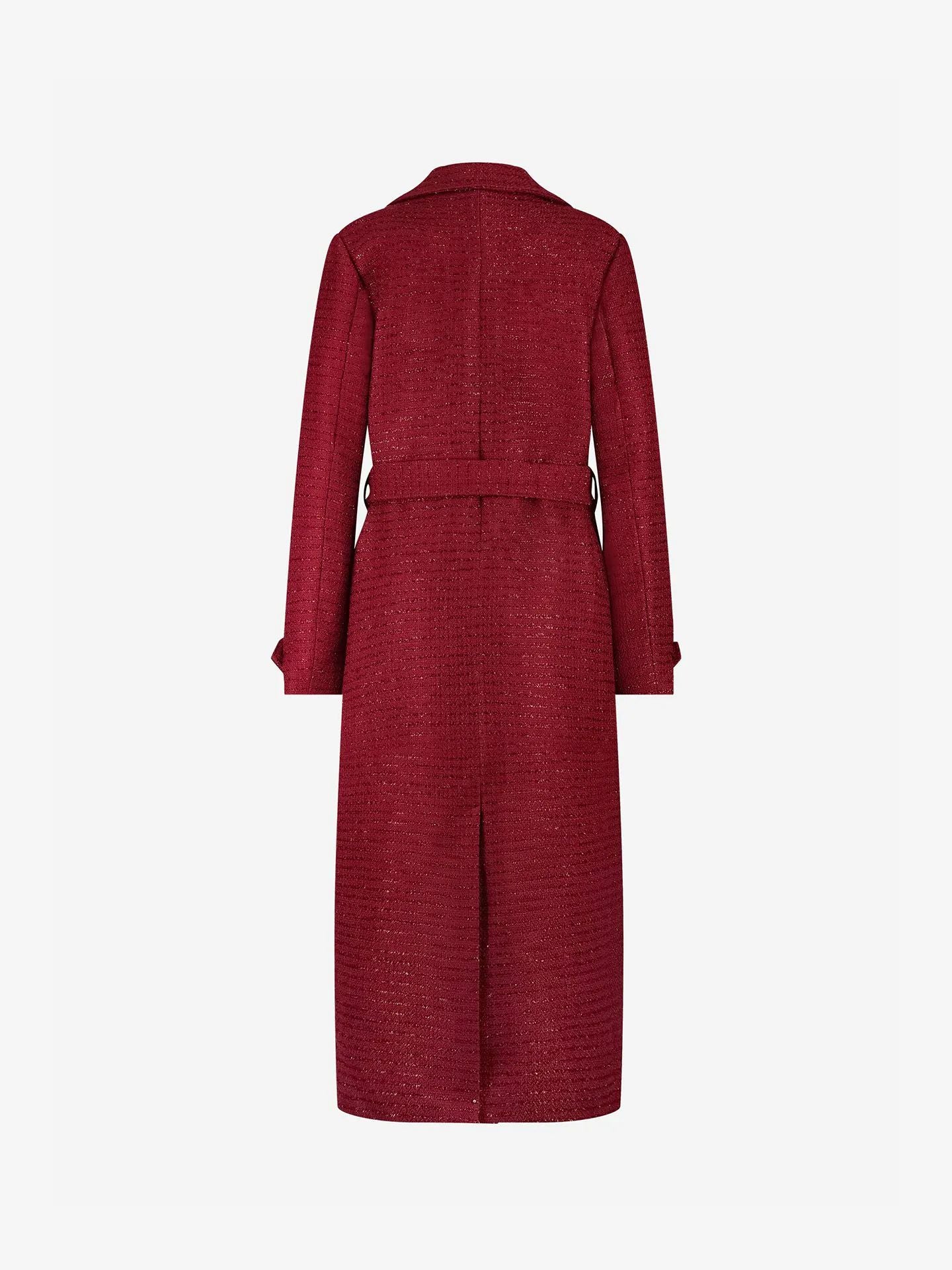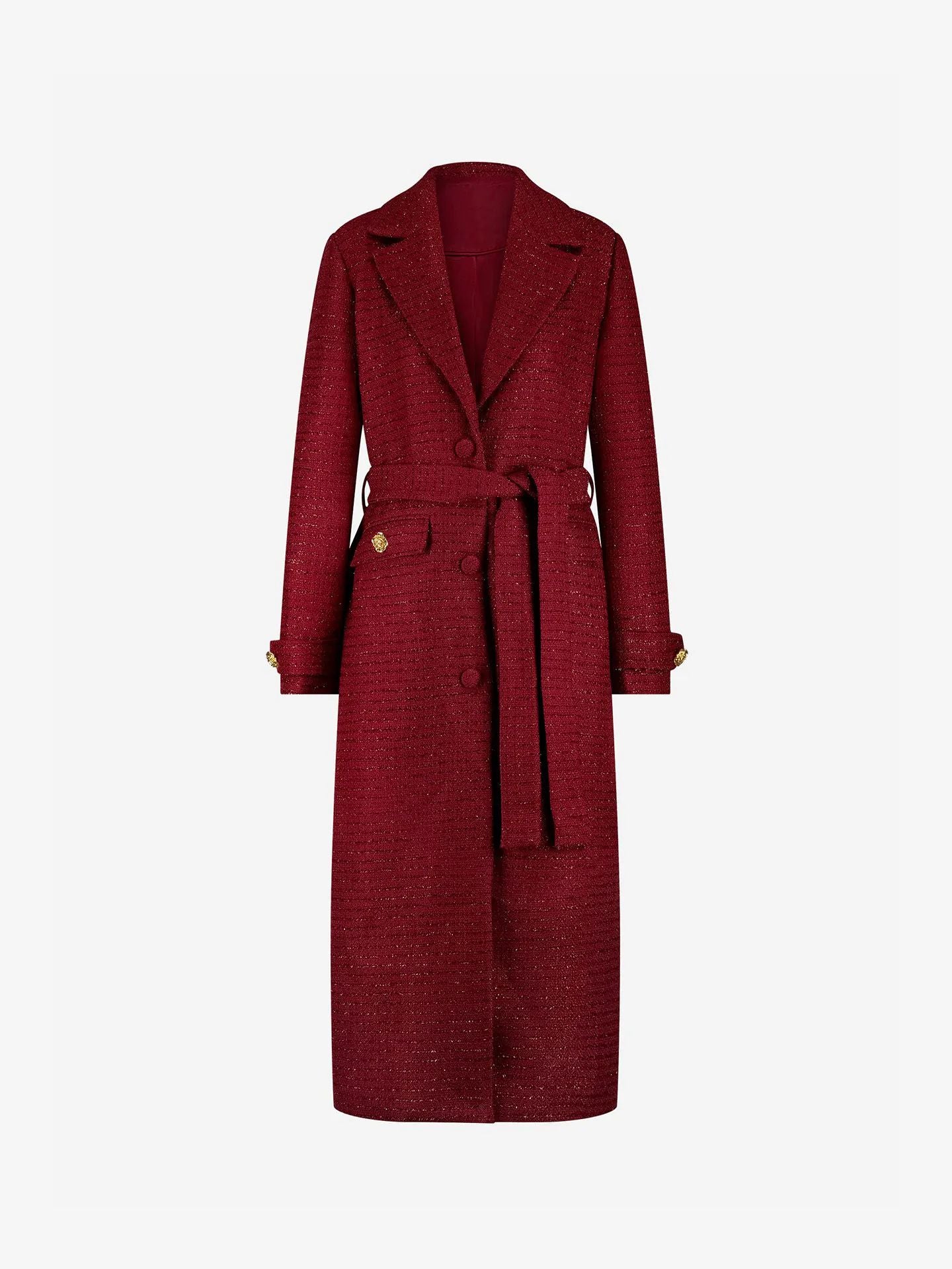 Casaco longo em bouclé com cinto, gola lapela e um sutil fio de glitter. O casaco possui fechamento por botões, bolsos com aba e abotoaduras decorativas nas mangas.