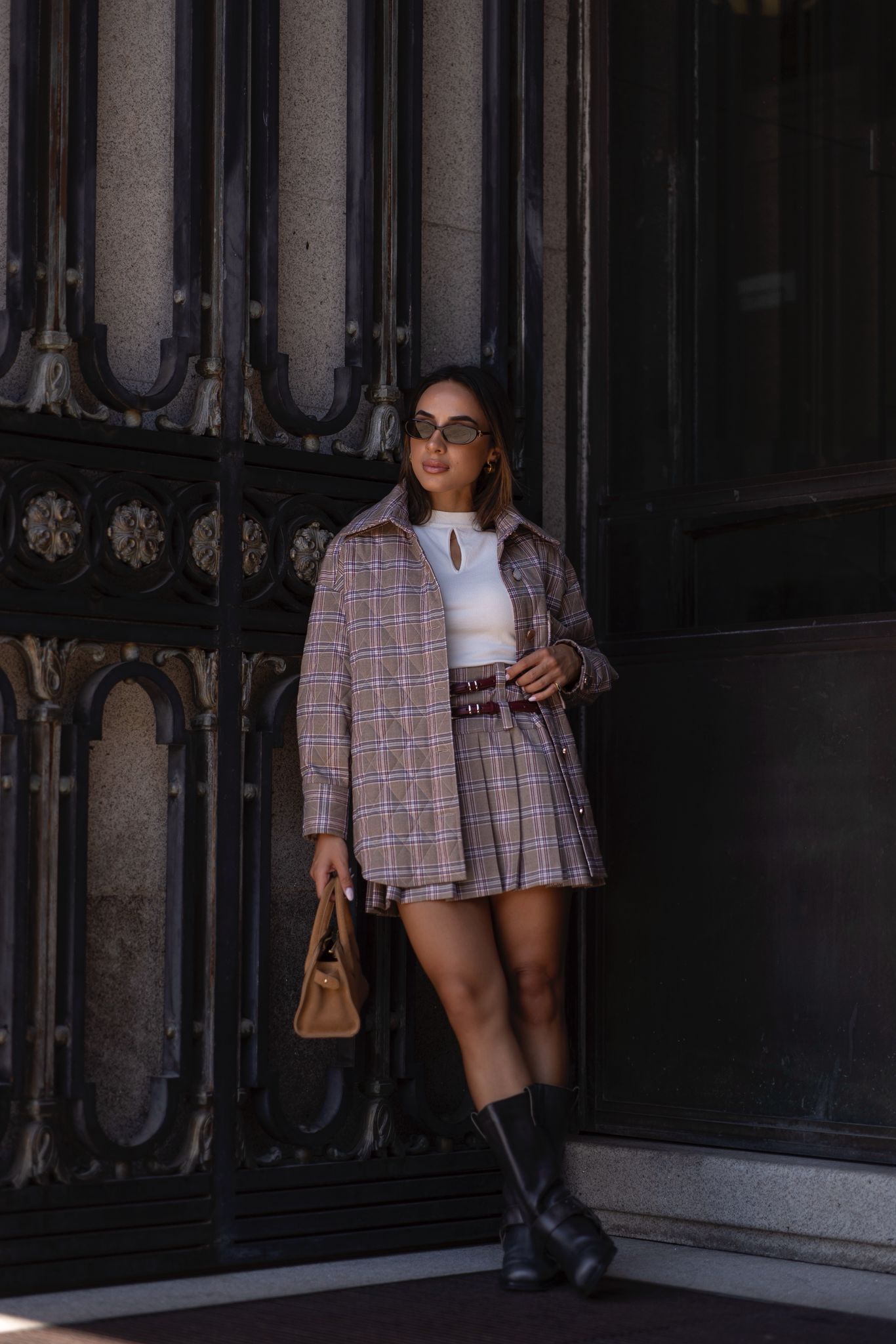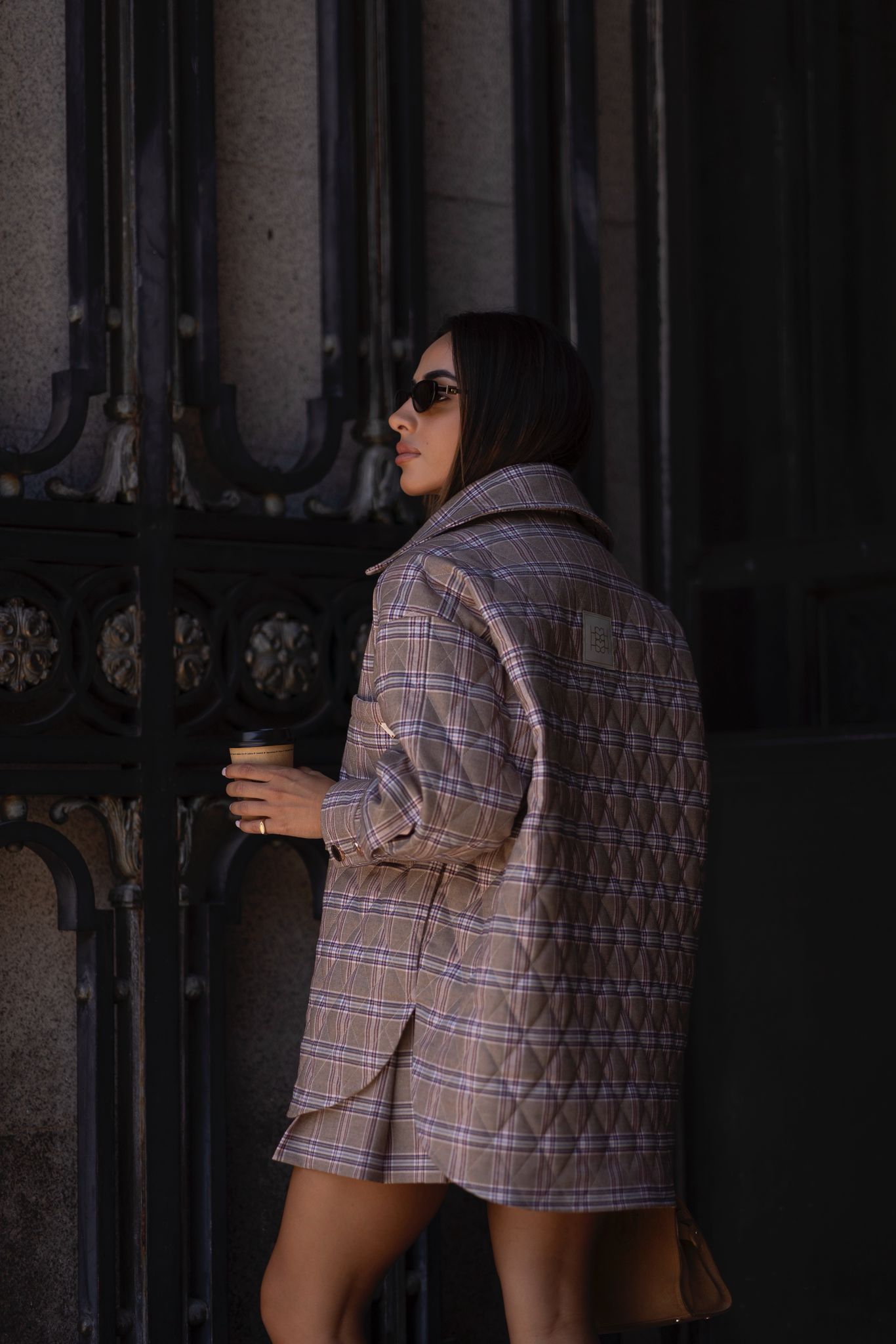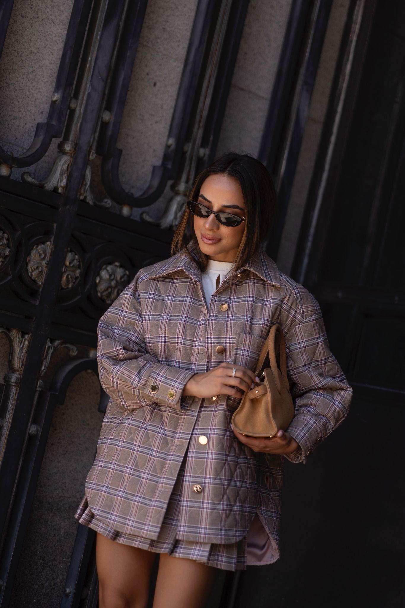Casaco acolchoado em padrão xadrez nos tons de camel e lilás. Com corte oversized e estrutura leve, é a peça ideal para um look casual chic nos dias frios. Possui botões frontais dourados, bolso no peito e acabamento acolchoado que garante conforto e estilo.