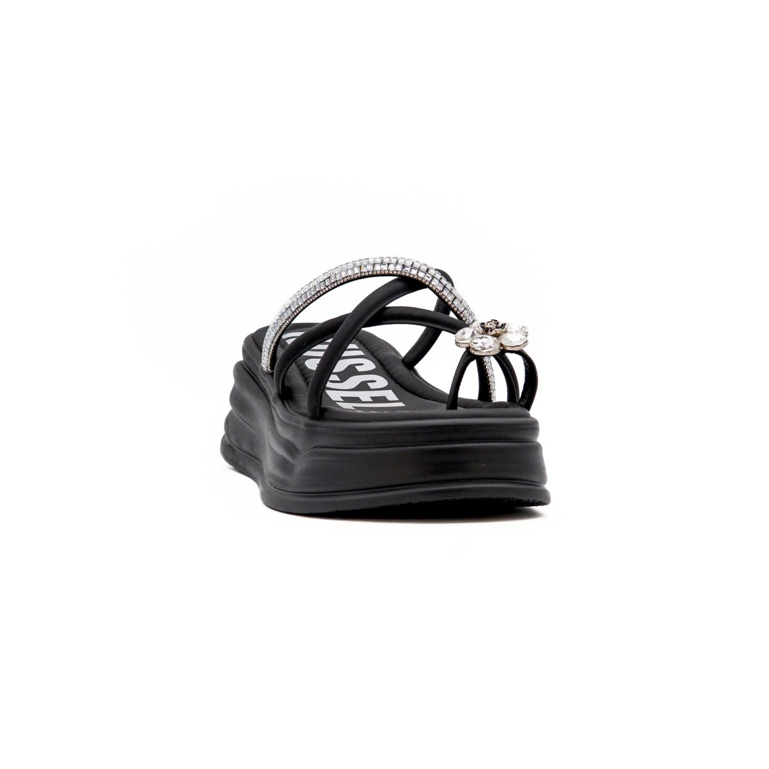O destaque deste modelo está nos detalhes brilhantes que elevam o design, uma tira decorada com aplicações de strass e uma aplicação em forma de flor com pedras brilhantes, criando um toque delicado e sofisticado.