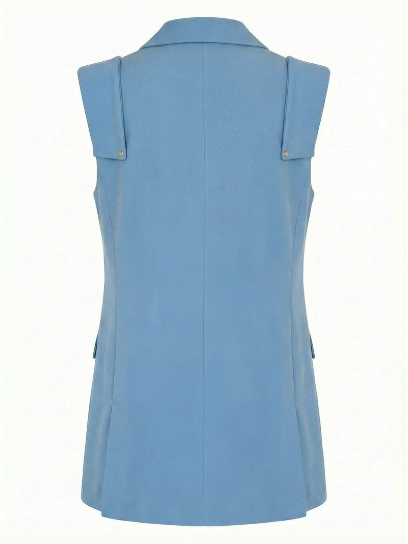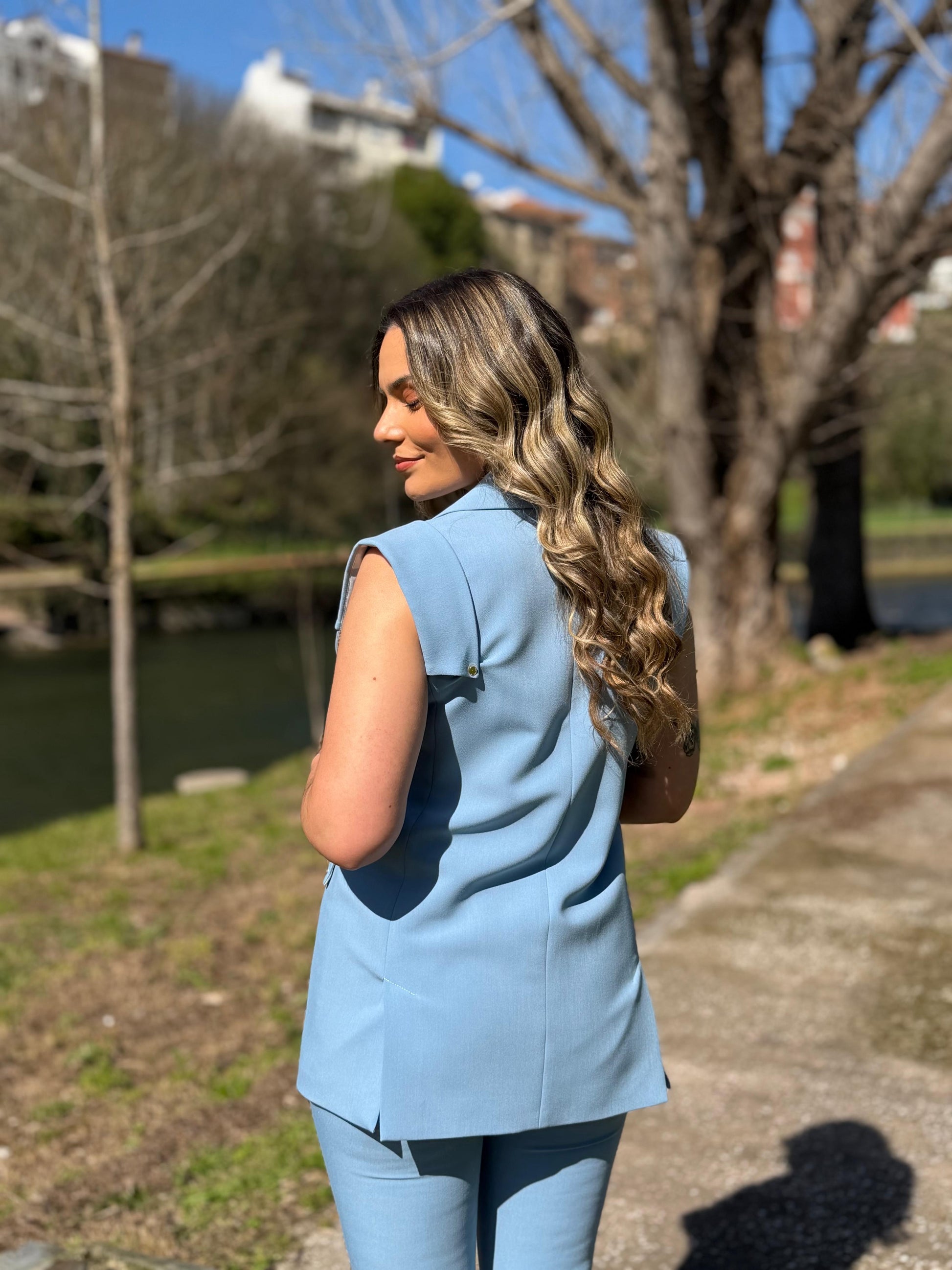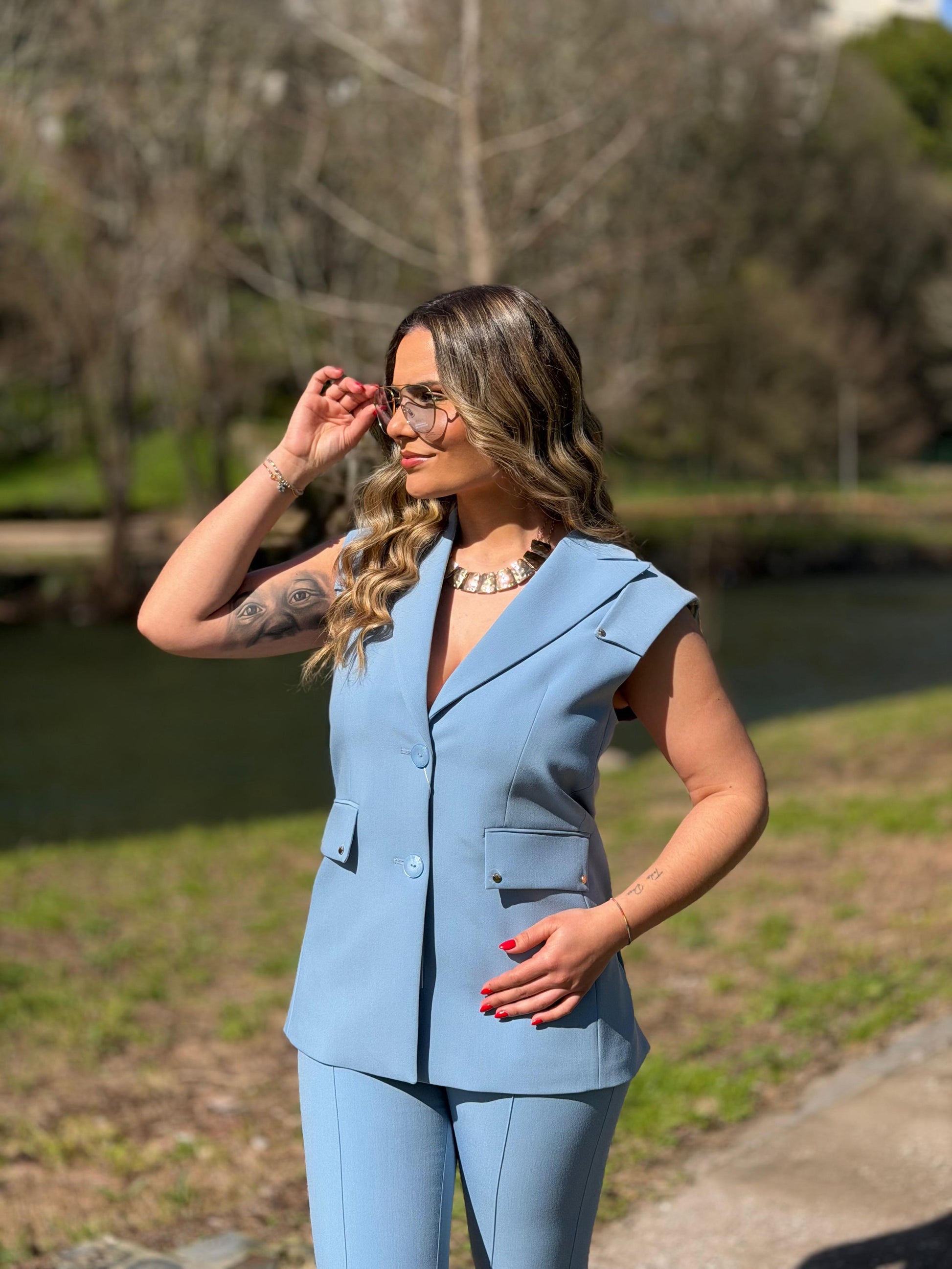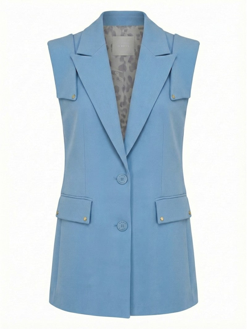 O design sem mangas torna-o versátil e atual, ideal para usar sozinho para um visual mais ousado ou sobre camisas e tops para um look sofisticado e urbano. O fecho com botões e as abas decorativas reforçam o estilo clássico da alfaiataria, reinterpretado de forma contemporânea.