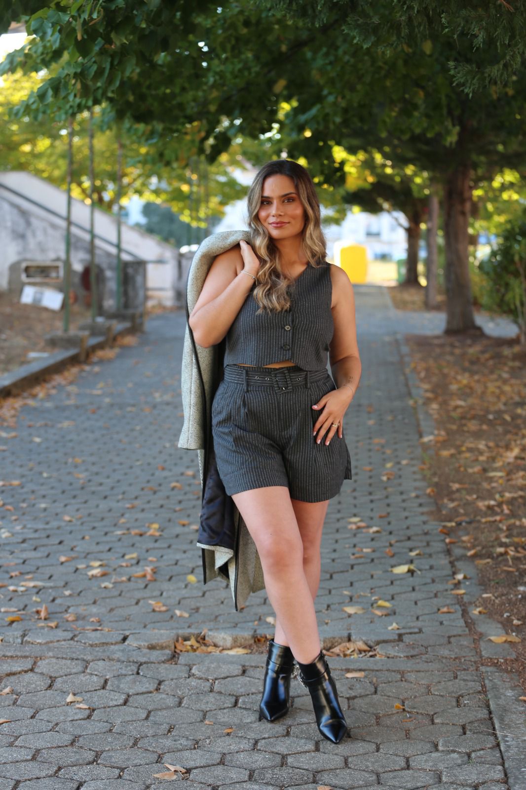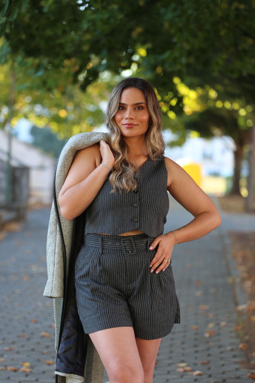 O conjunto é composto por colete cropped com botões frontais e calção de cintura subida com cinto ajustável, ambos em padrão de riscas finas que alongam a silhueta.