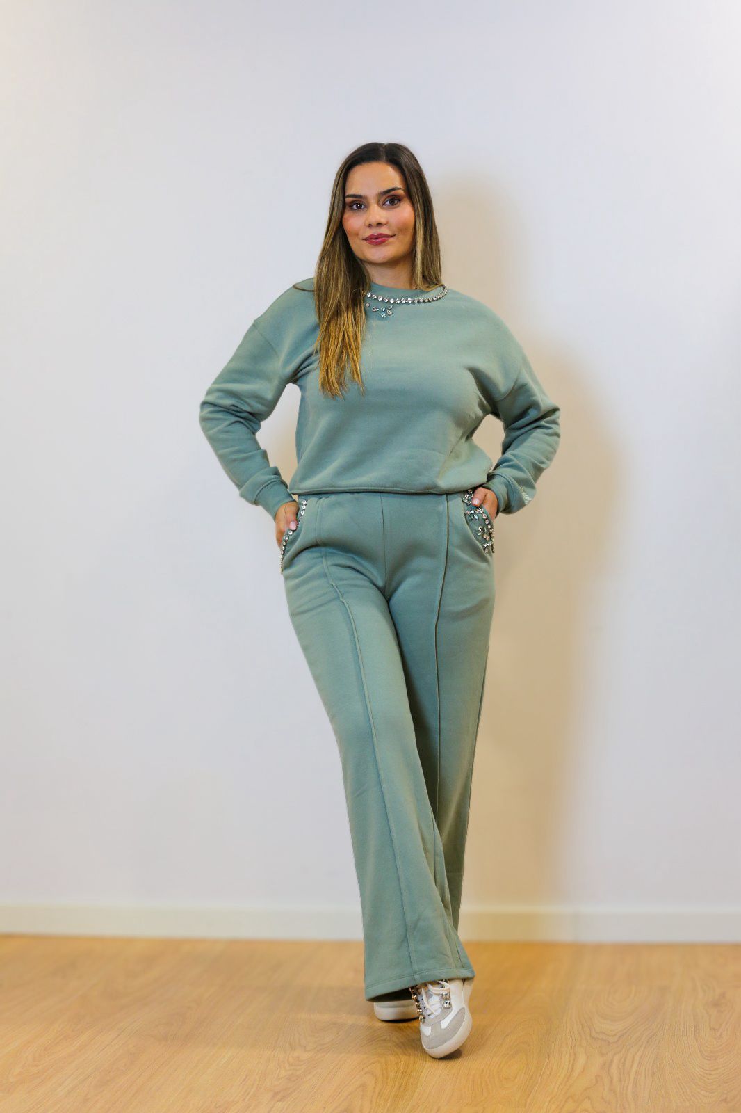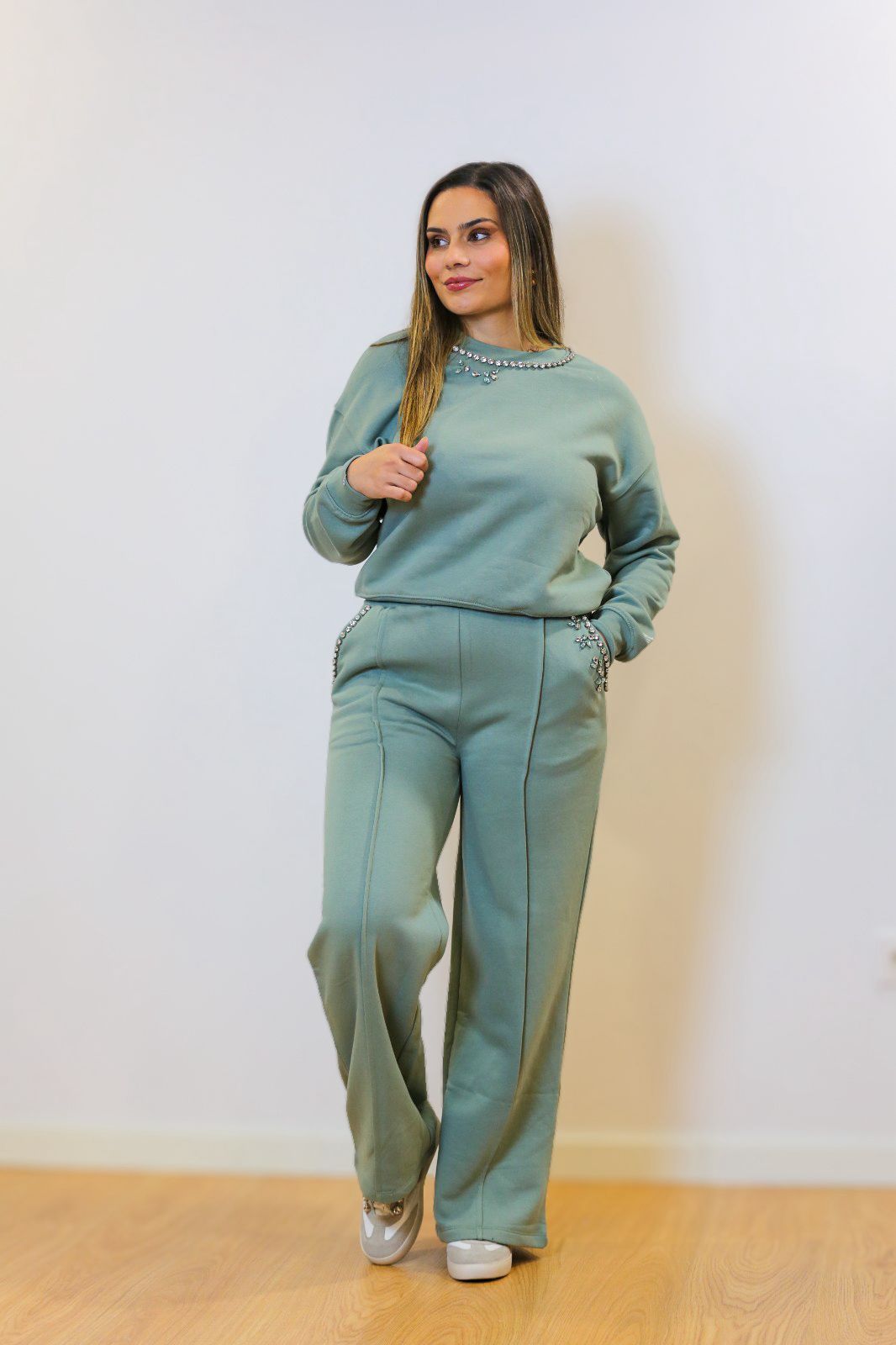 Este conjunto em verde suave combina o conforto do dia a dia com detalhes luxuosos que fazem toda a diferença. A parte de cima apresenta aplicações brilhantes na zona da gola, trazendo um toque elegante e feminino. As calças seguem a mesma linha, com aplicações nas laterais dos bolsos, criando um look harmonioso e sofisticado.