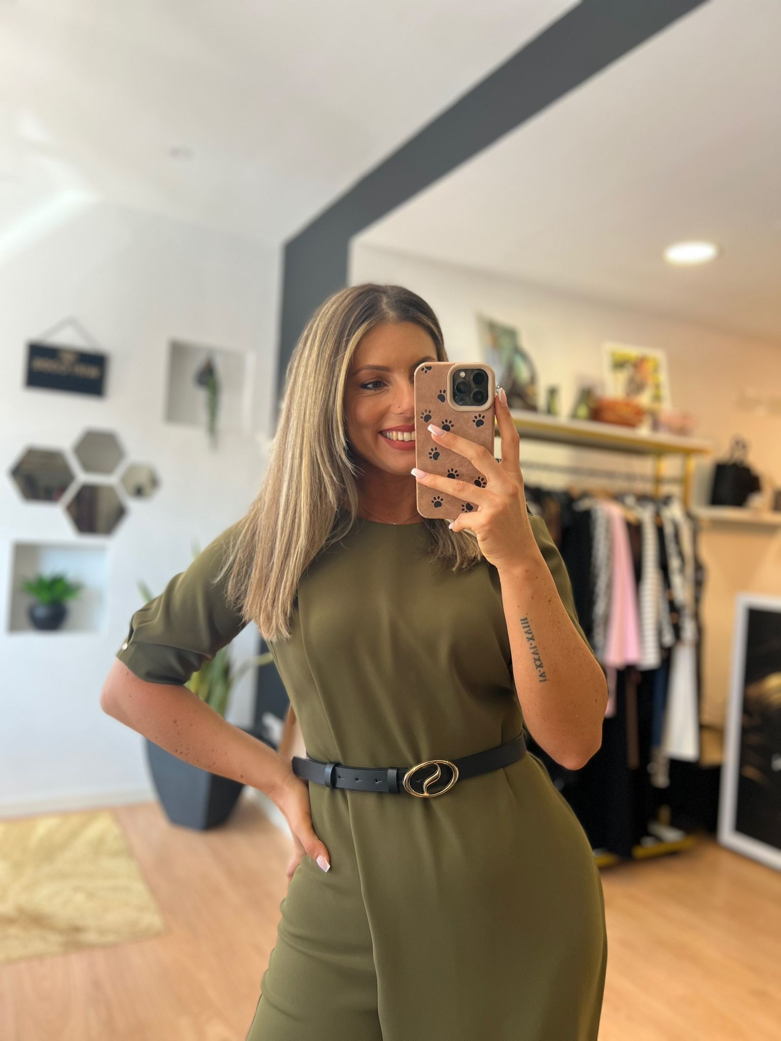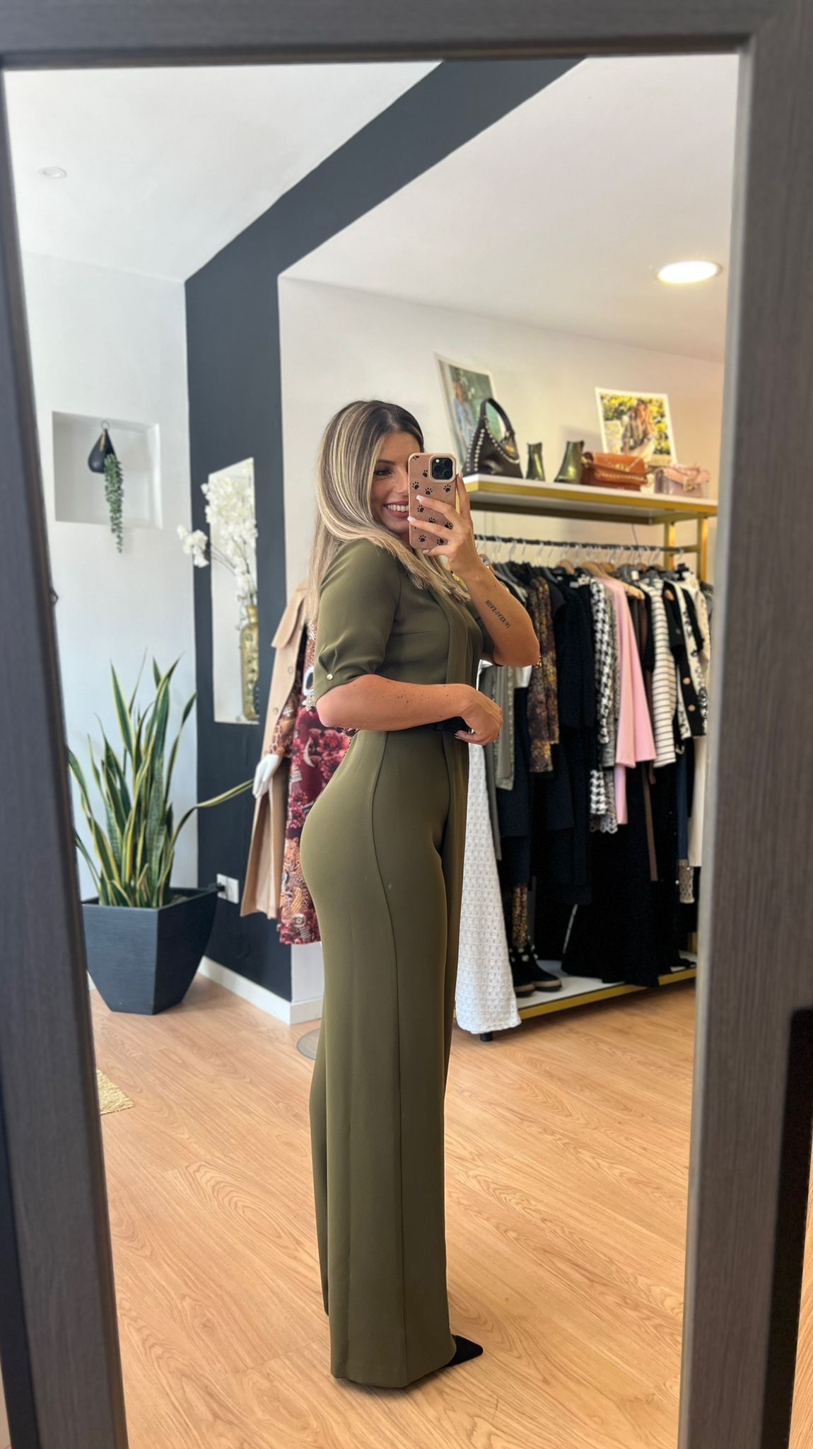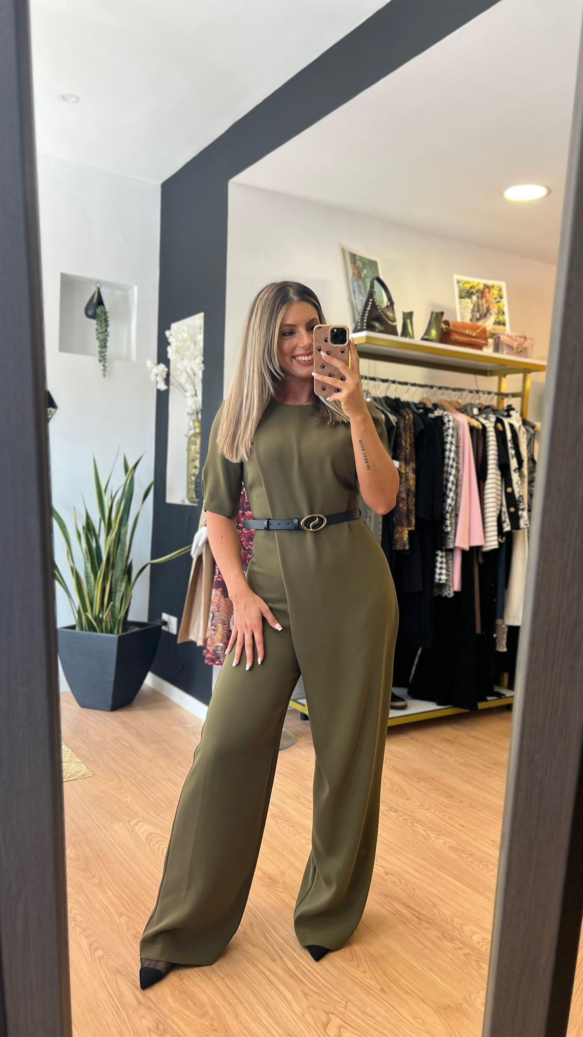 Elegante e versátil, este macacão verde militar é a peça perfeita para criar um look sofisticado sem esforço.