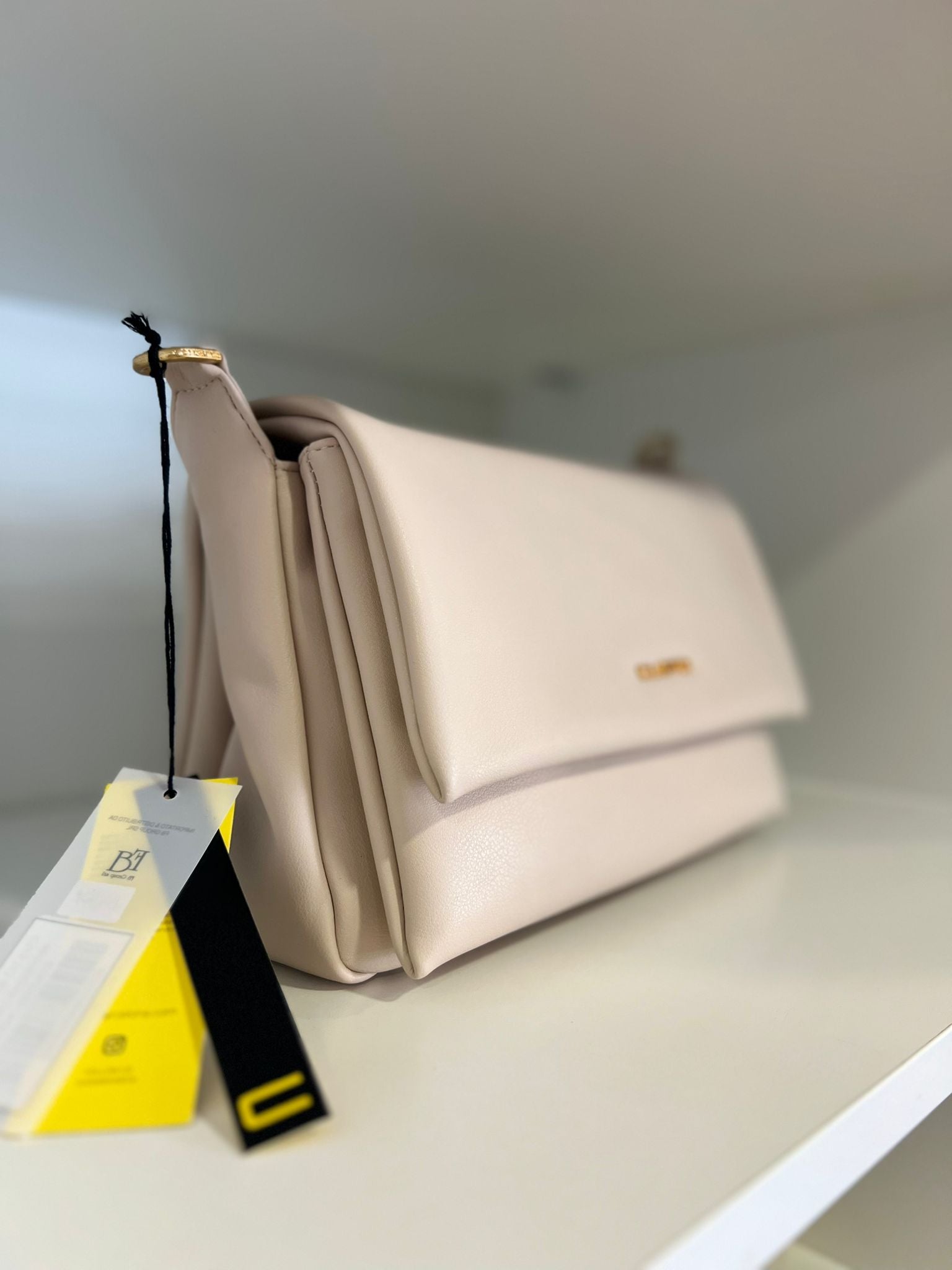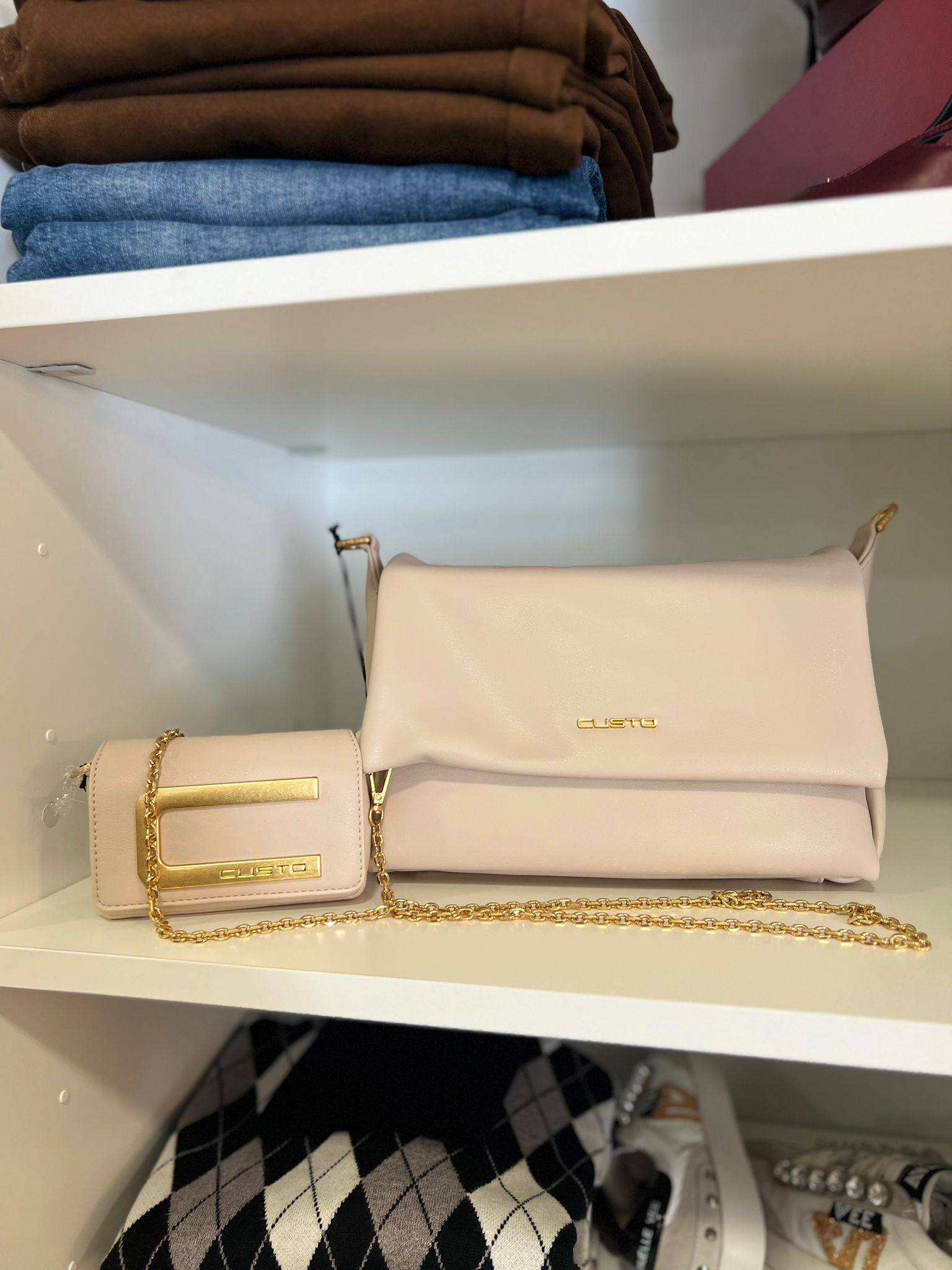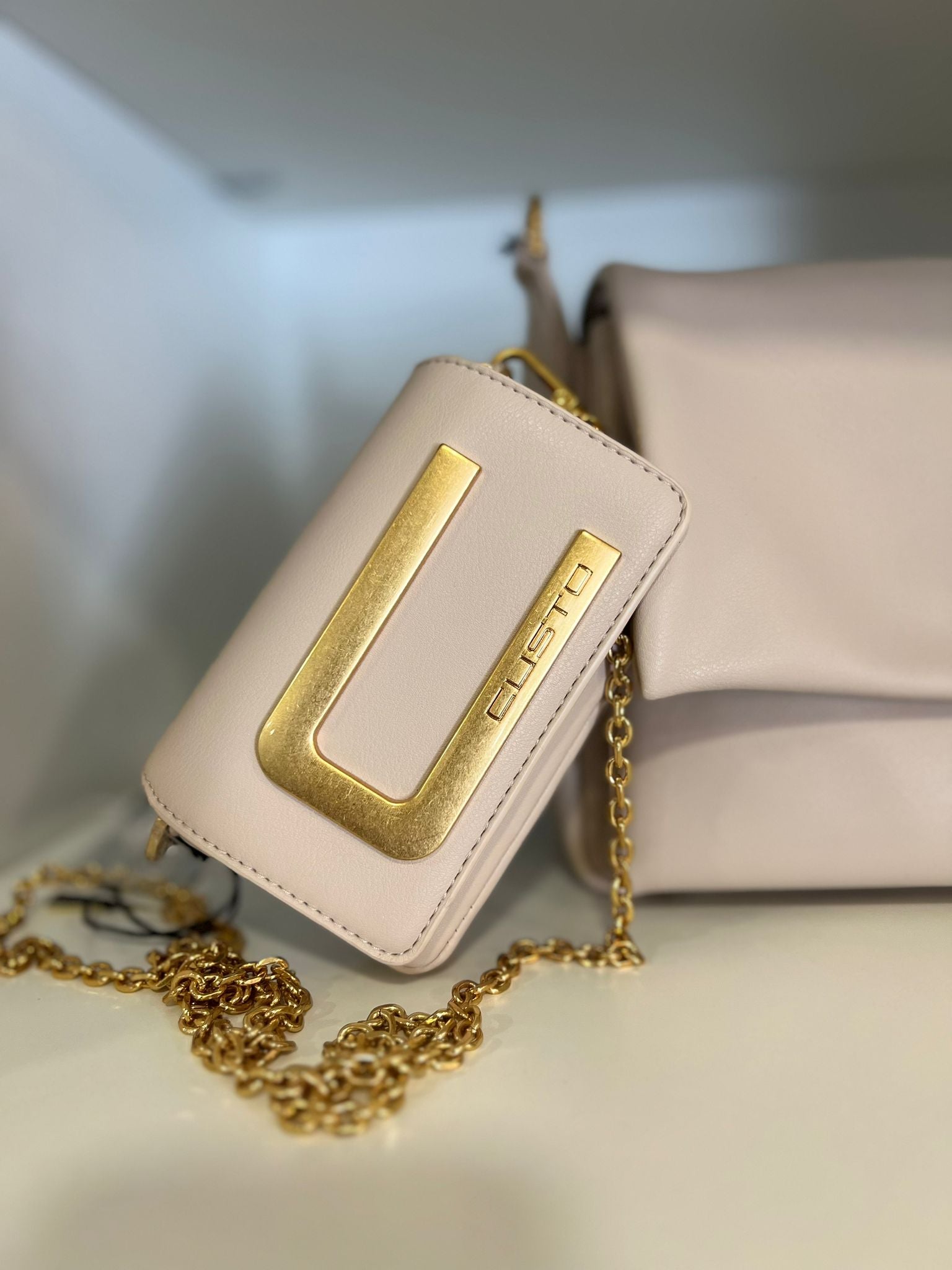 Mala média em tom bege com duas alças: uma curta para usar ao ombro e uma corrente dourada para um toque mais elegante e versátil.