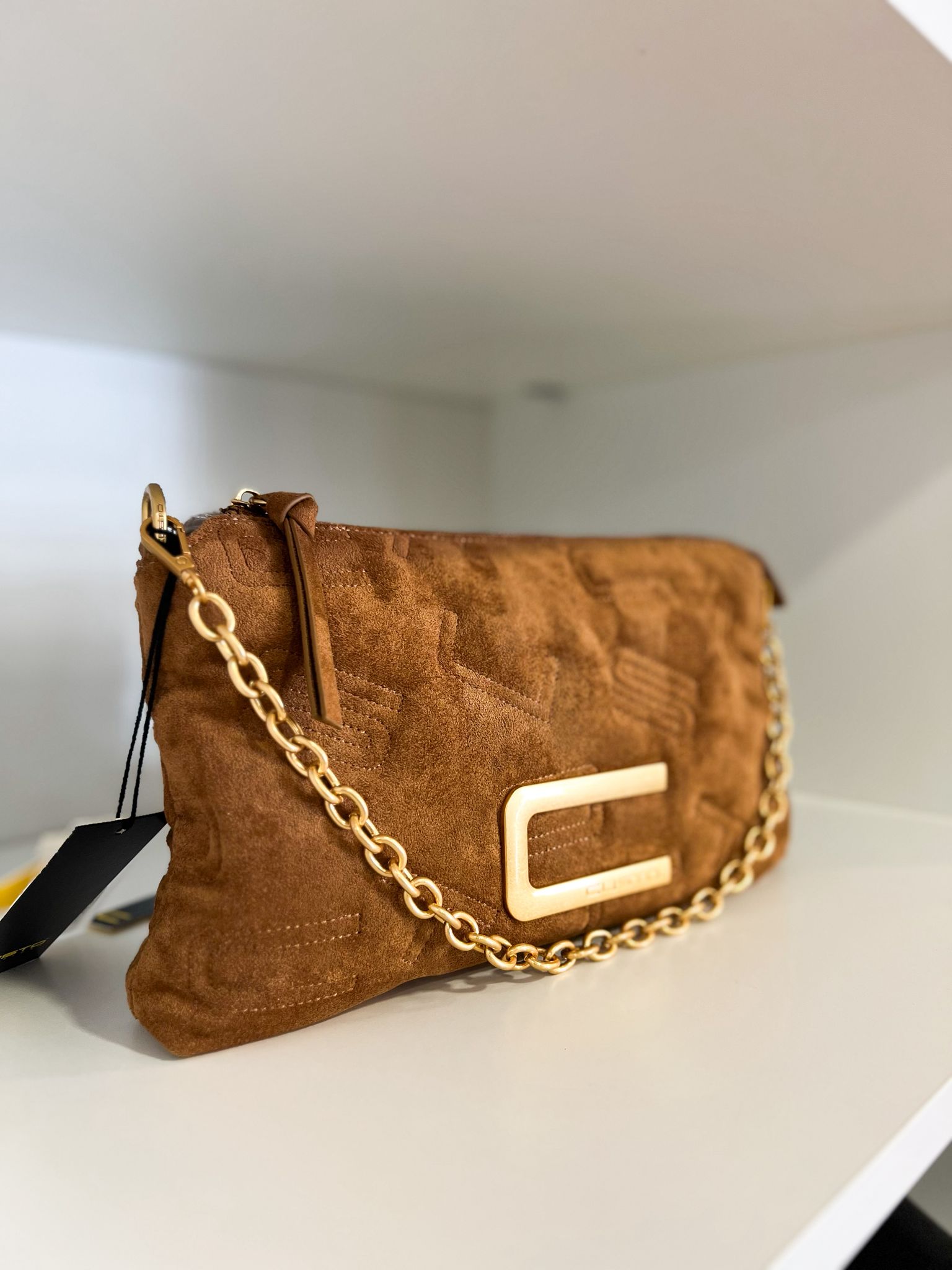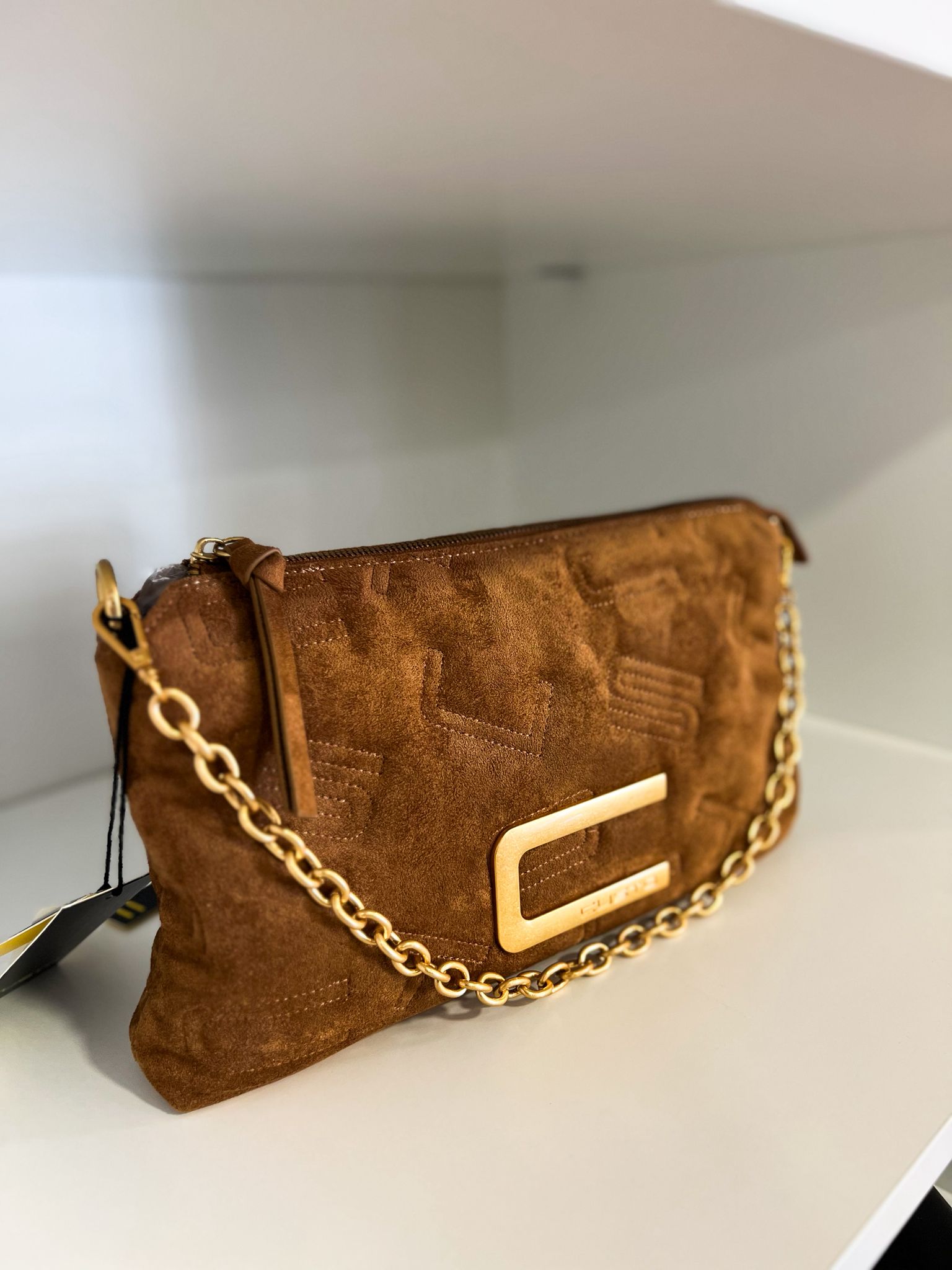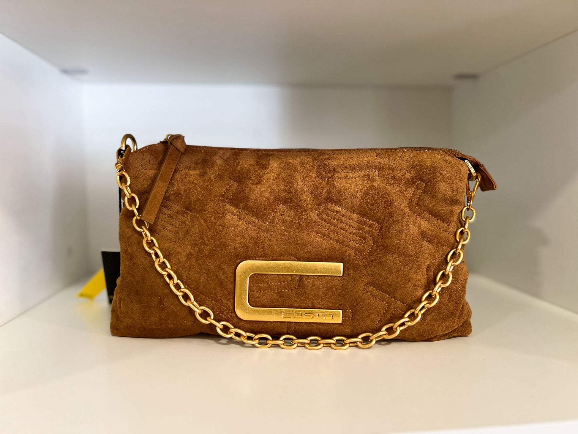 A mala Custo em camurça castanha combina textura suave com o brilho dos detalhes dourados, criando uma peça moderna e intemporal.