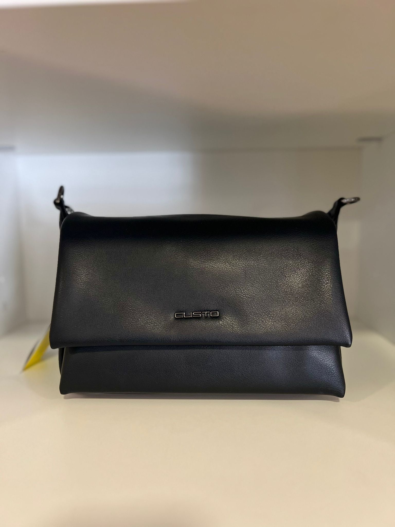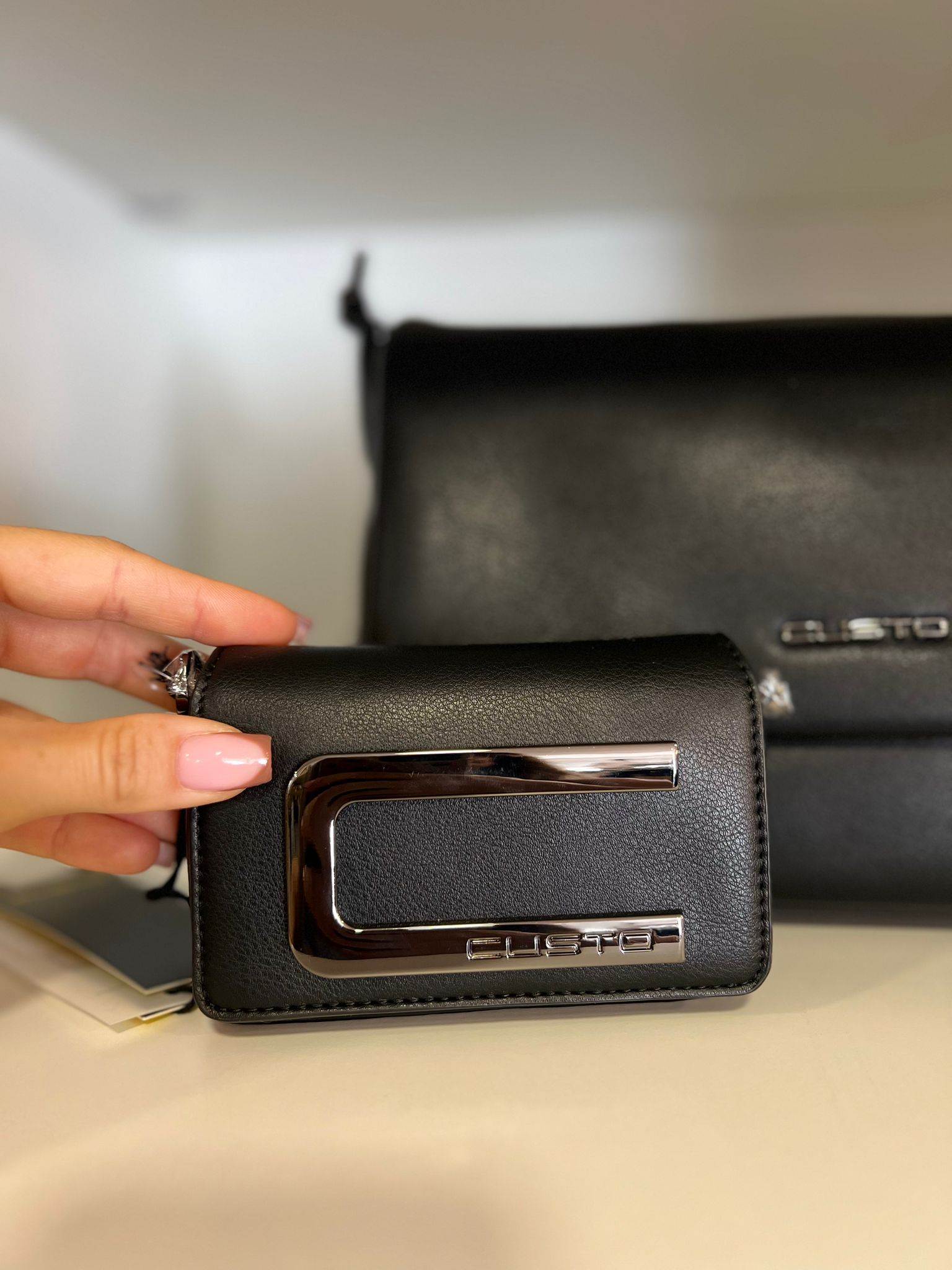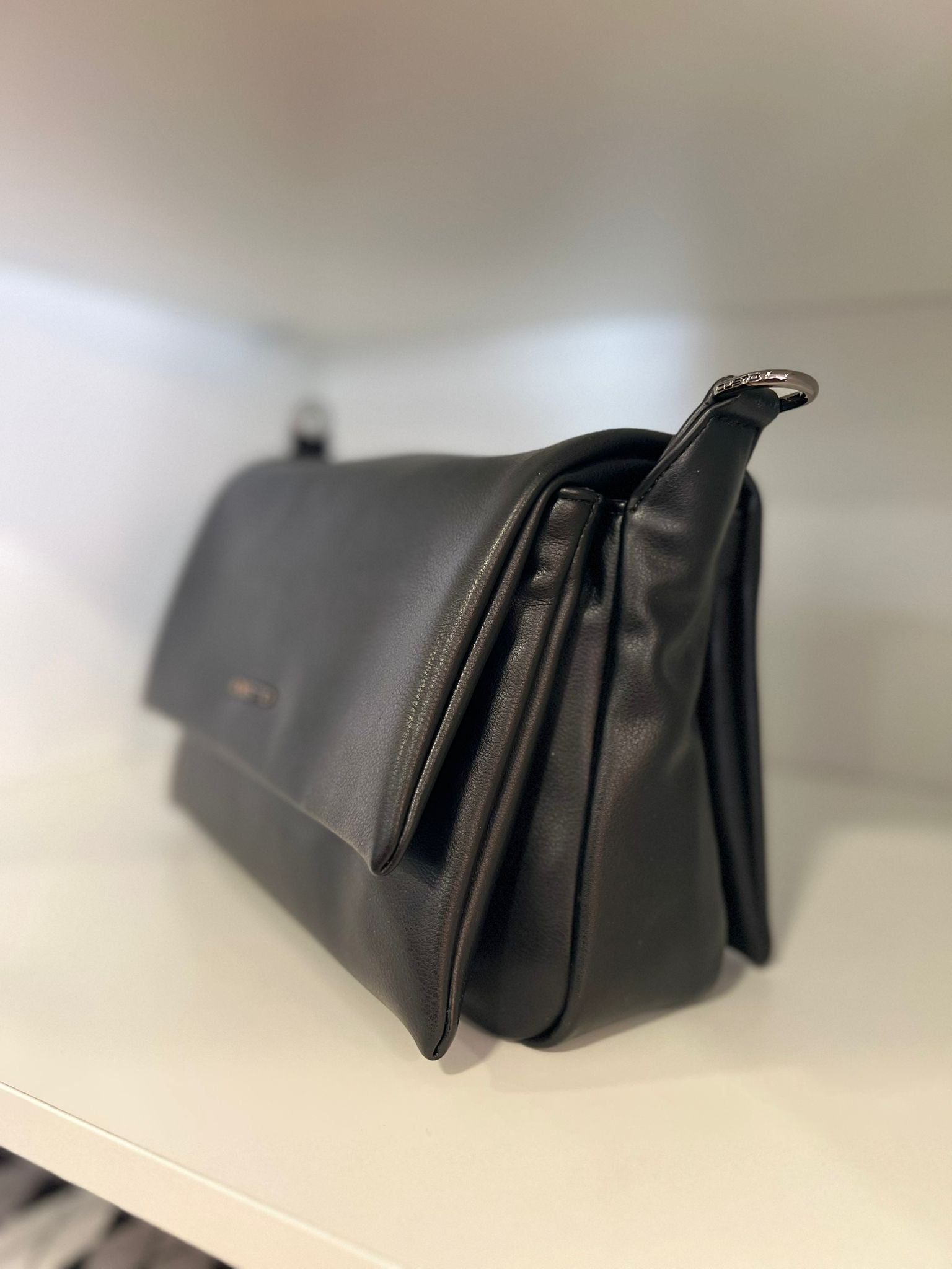 Mala média em preto com duas alças: uma curta para usar ao ombro e uma corrente prateada que permite um visual mais comprido e sofisticado.