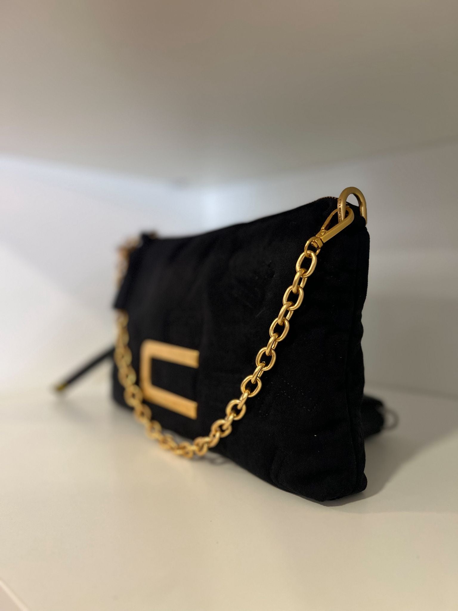 Confeccionada em veludo preto macio, apresenta um design moderno com detalhes em dourado que adicionam um toque de luxo.