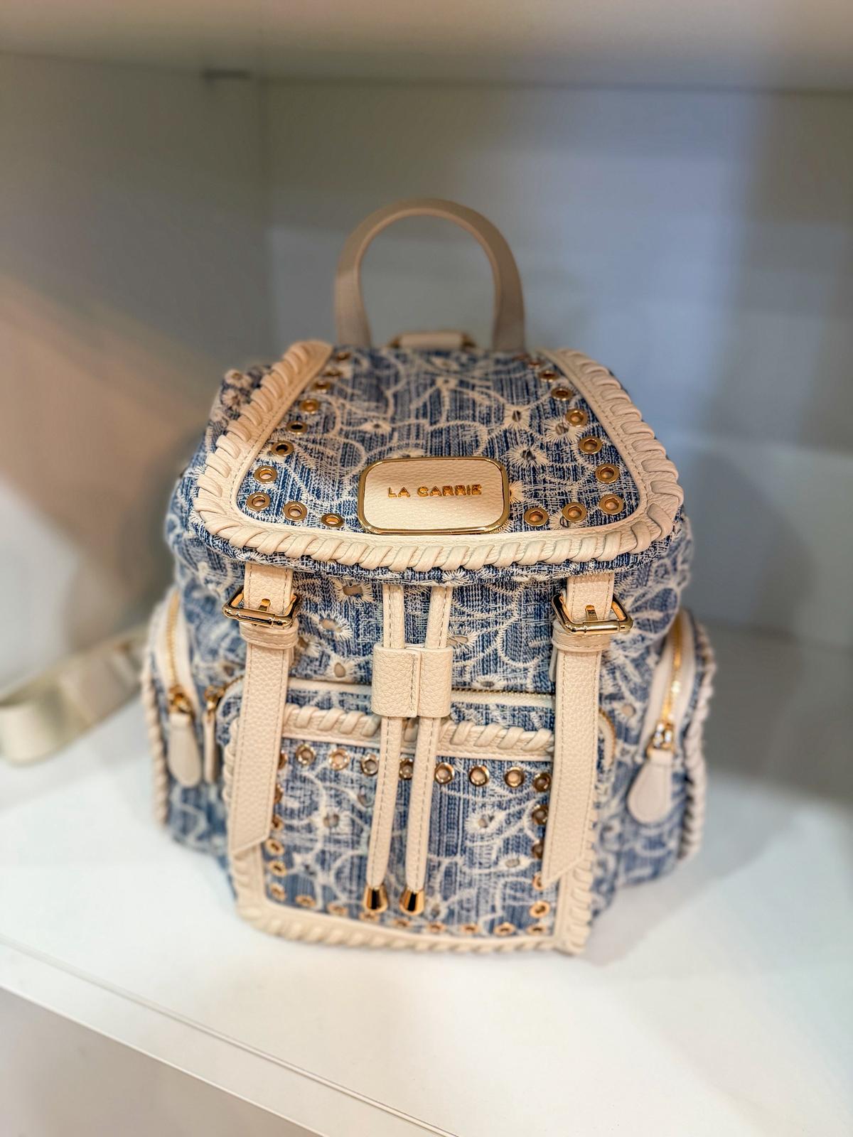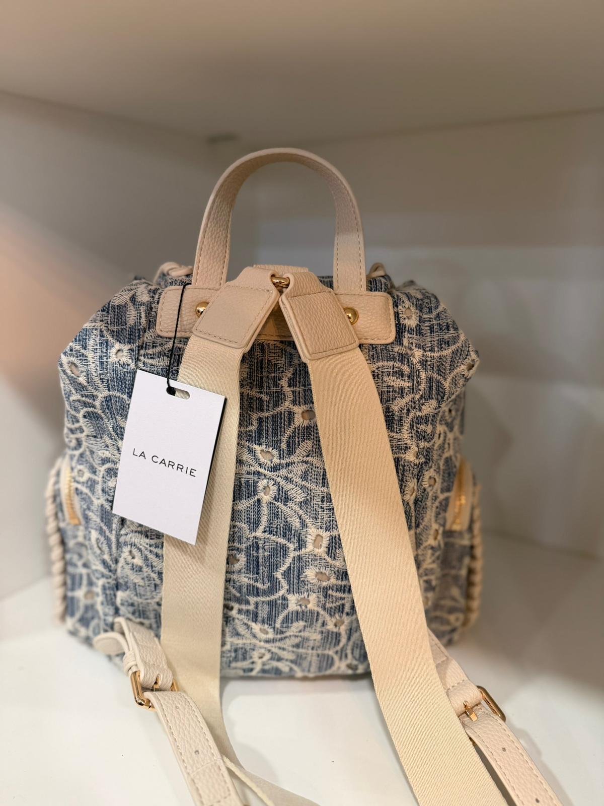 A Mochila La Carrie alia sofisticação, funcionalidade e um design contemporâneo. Confeccionada em tecido denim trabalhado com padrão floral, destaca-se pelos acabamentos em tom bege, pelas aplicações metálicas douradas e pelos detalhes entrançados que lhe conferem um toque artesanal e exclusivo.