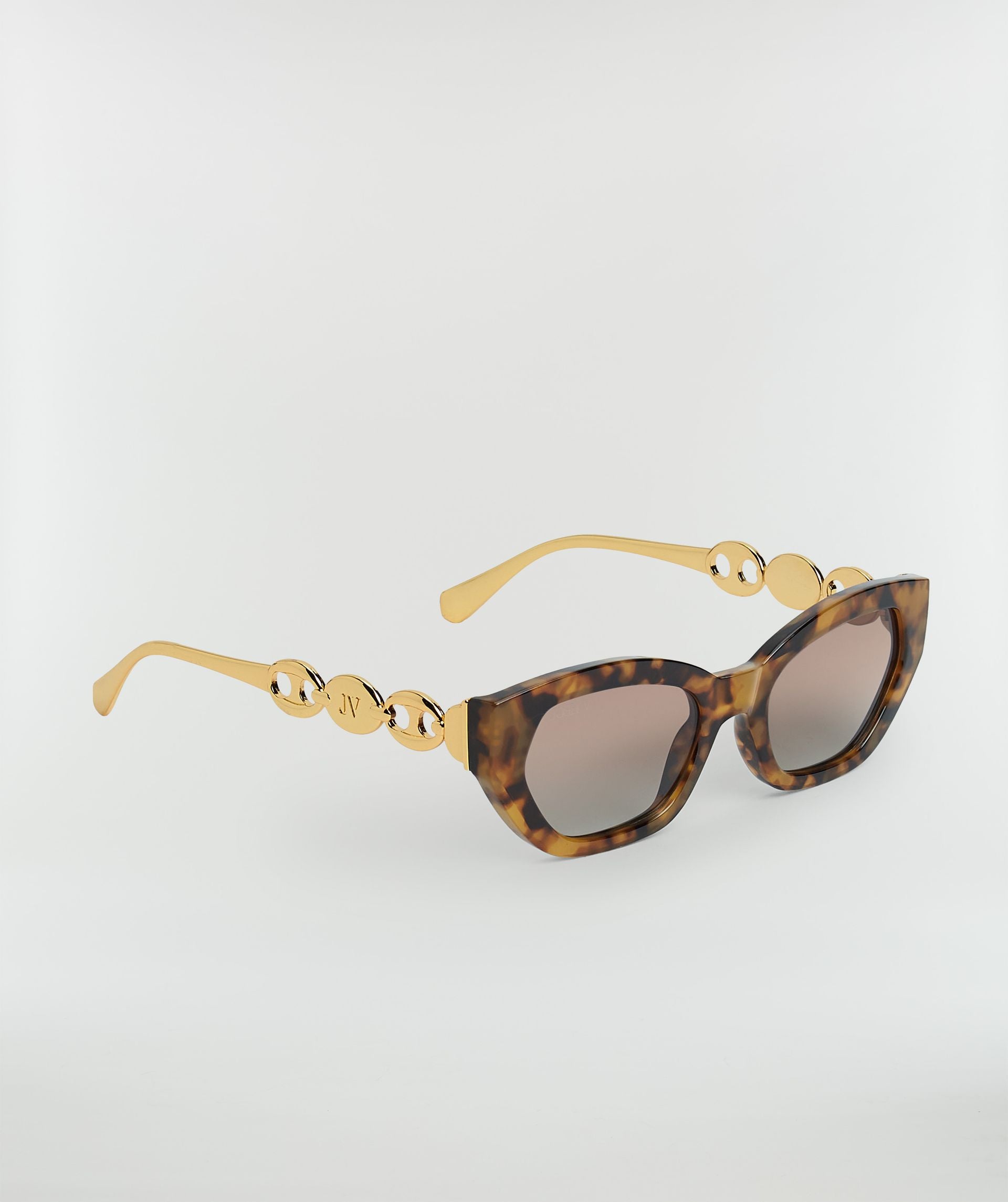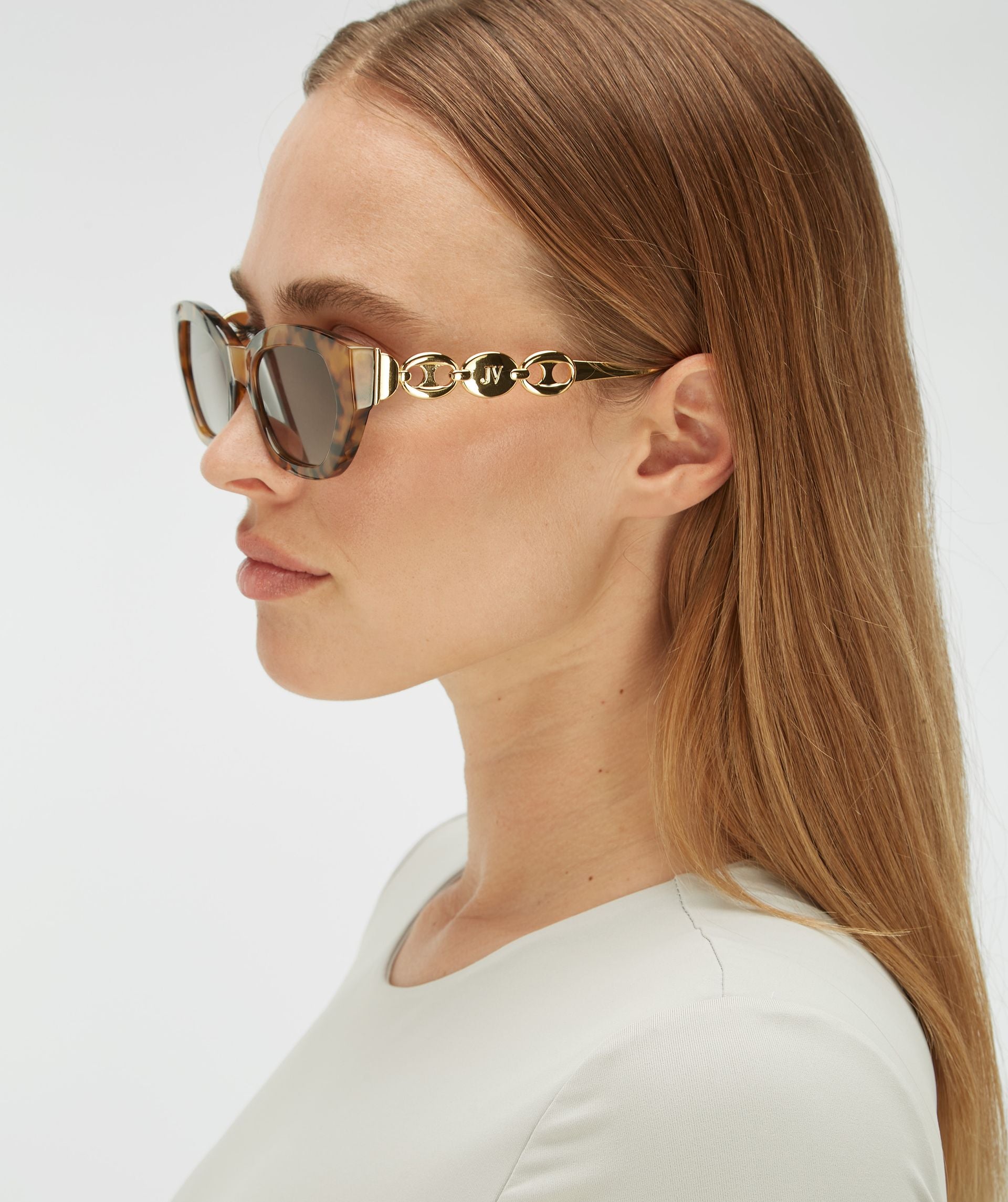 Os óculos de sol JOSH V Meire na cor Camel são óculos gatinho estilosos, perfeitos para uso interno e externo. A armação marrom apresenta hastes douradas exclusivas e lentes levemente polarizadas e inquebráveis. Essas lentes polarizadas protegem contra o brilho causado pelo reflexo da luz solar. Isso significa que você não terá mais reflexos incômodos do asfalto, da água, da neve, etc. Ideais para um dia de passeio de barco, direção ou esportes de inverno. Além disso, as lentes oferecem 100% de proteção UVA e UVB e são produzidas de acordo com as normas CE. Os óculos de sol vêm com um prático estojo de couro sintético.