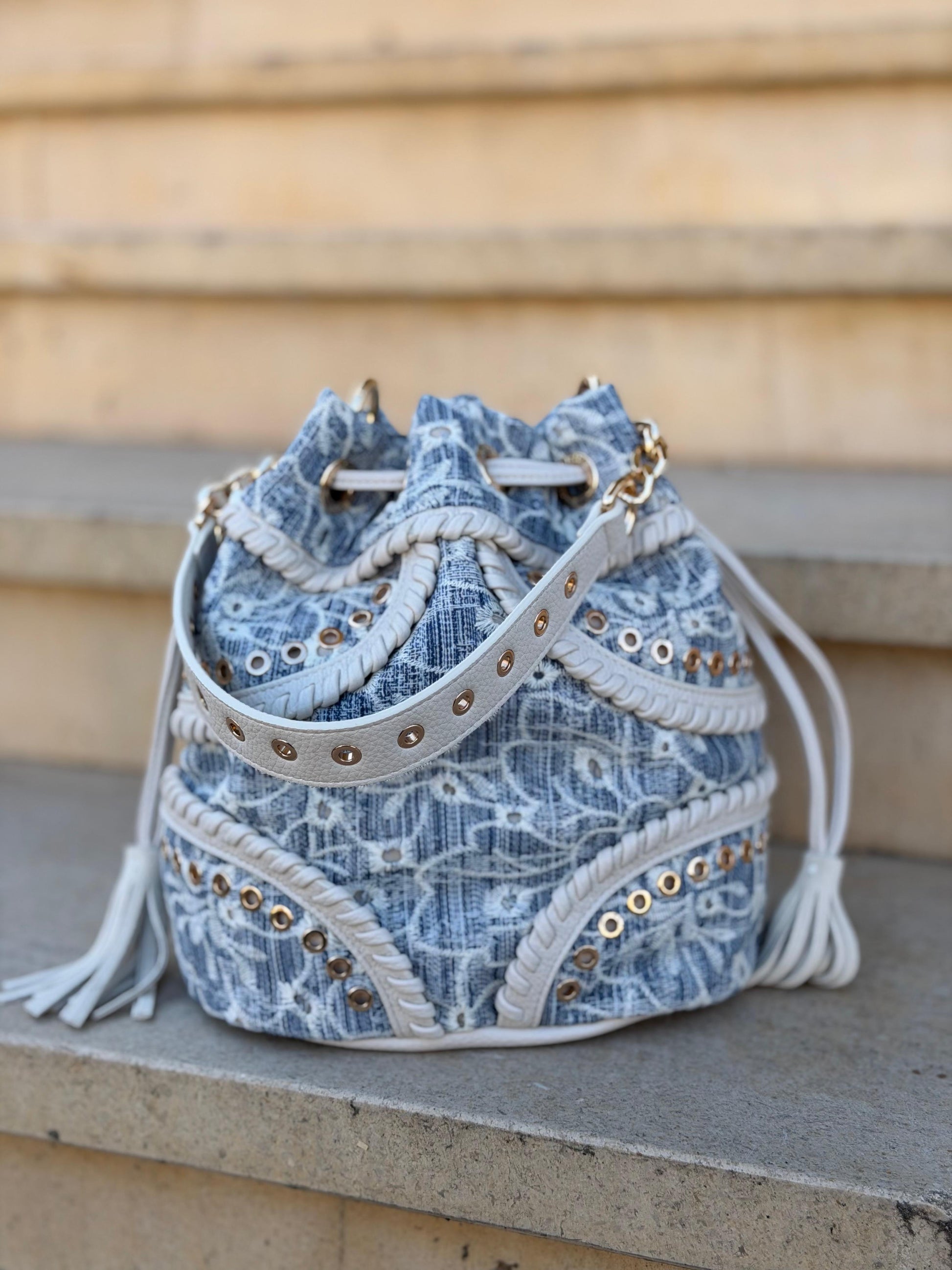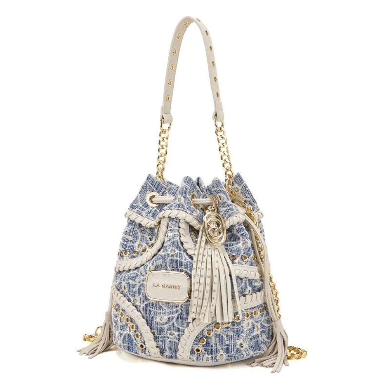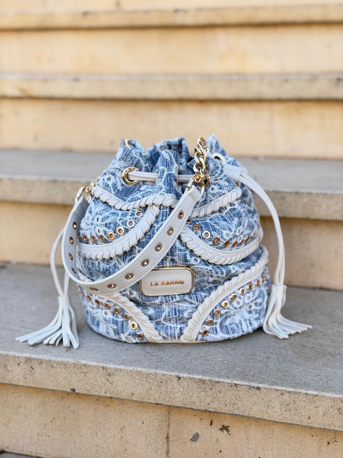 Bolsa em formato saco, com design sofisticado e acabamento cuidado. Confeccionada em tecido texturizado em tons de azul, combina detalhes em material sintético bege com aplicações metálicas douradas, que elevam o visual e conferem um toque premium.