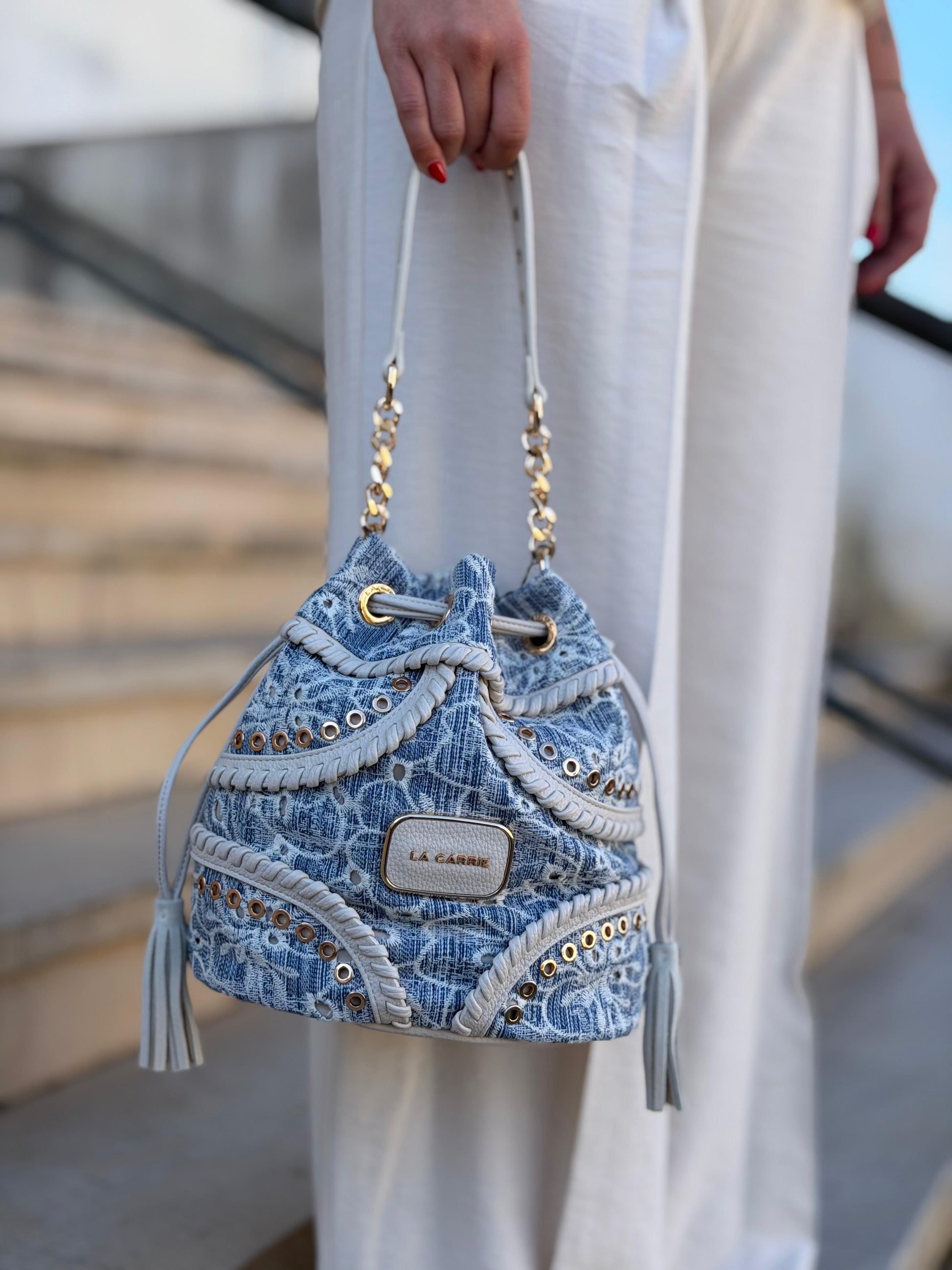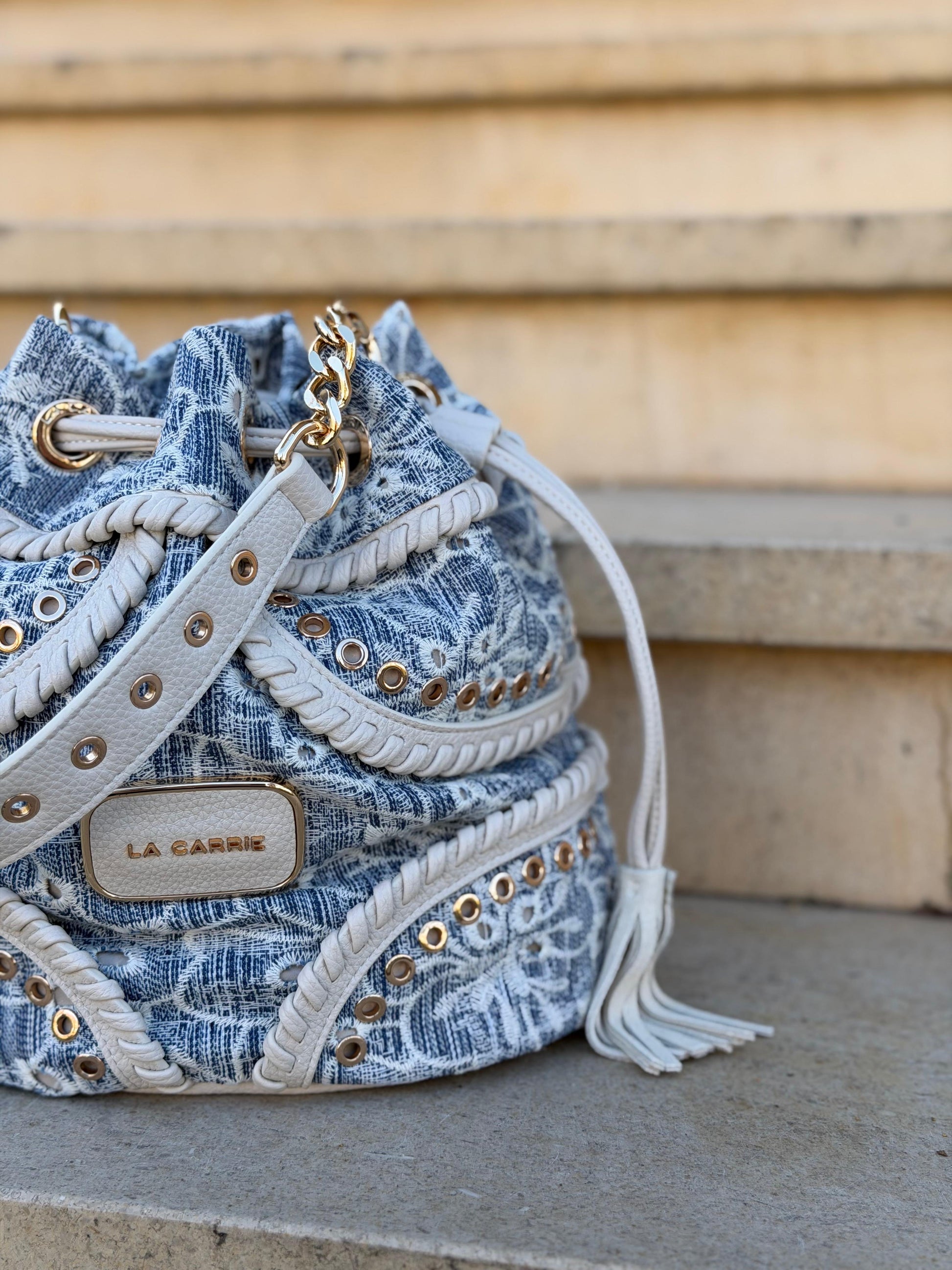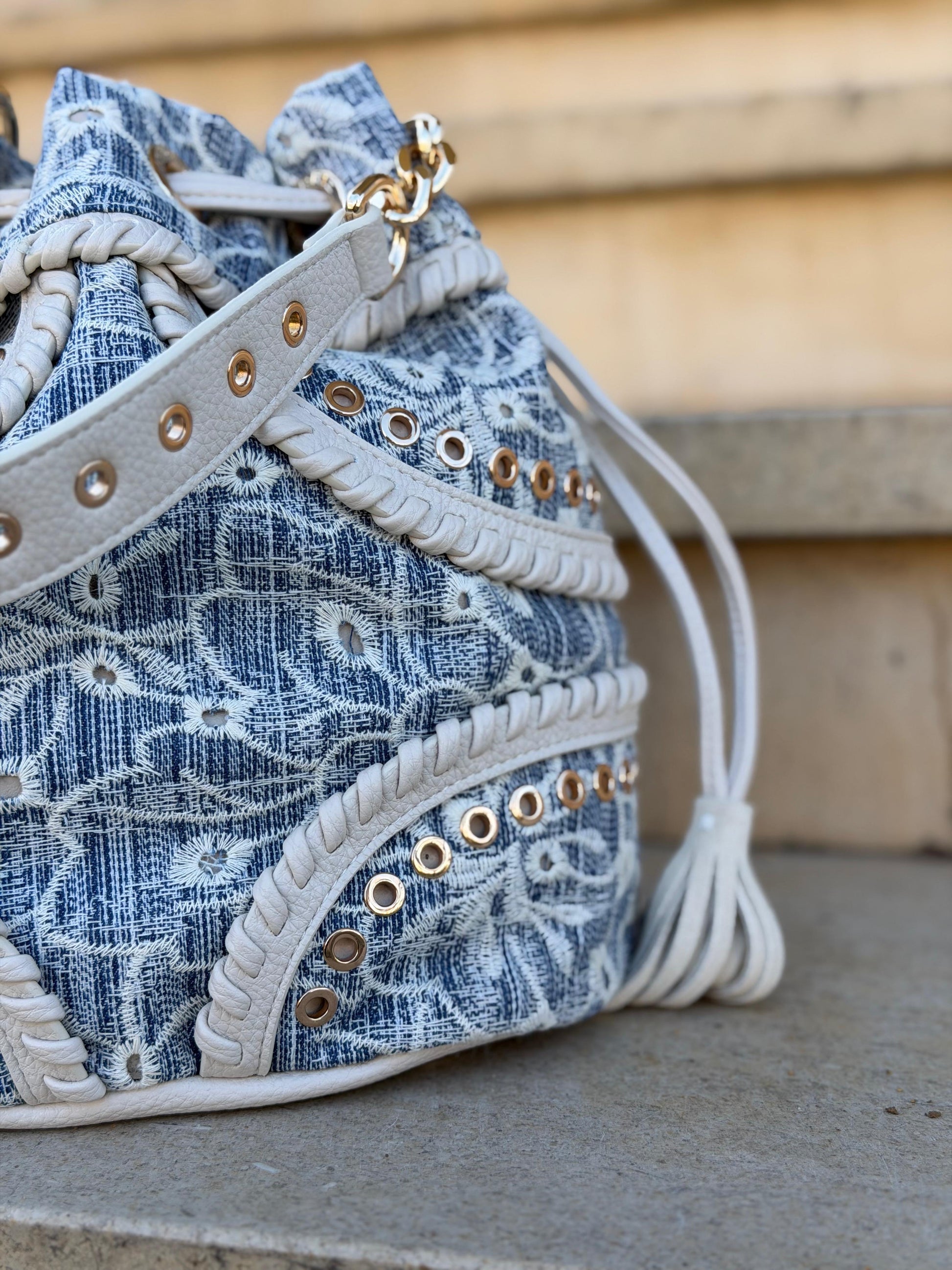 Bolsa em formato saco, com design sofisticado e acabamento cuidado. Confeccionada em tecido texturizado em tons de azul, combina detalhes em material sintético bege com aplicações metálicas douradas, que elevam o visual e conferem um toque premium.