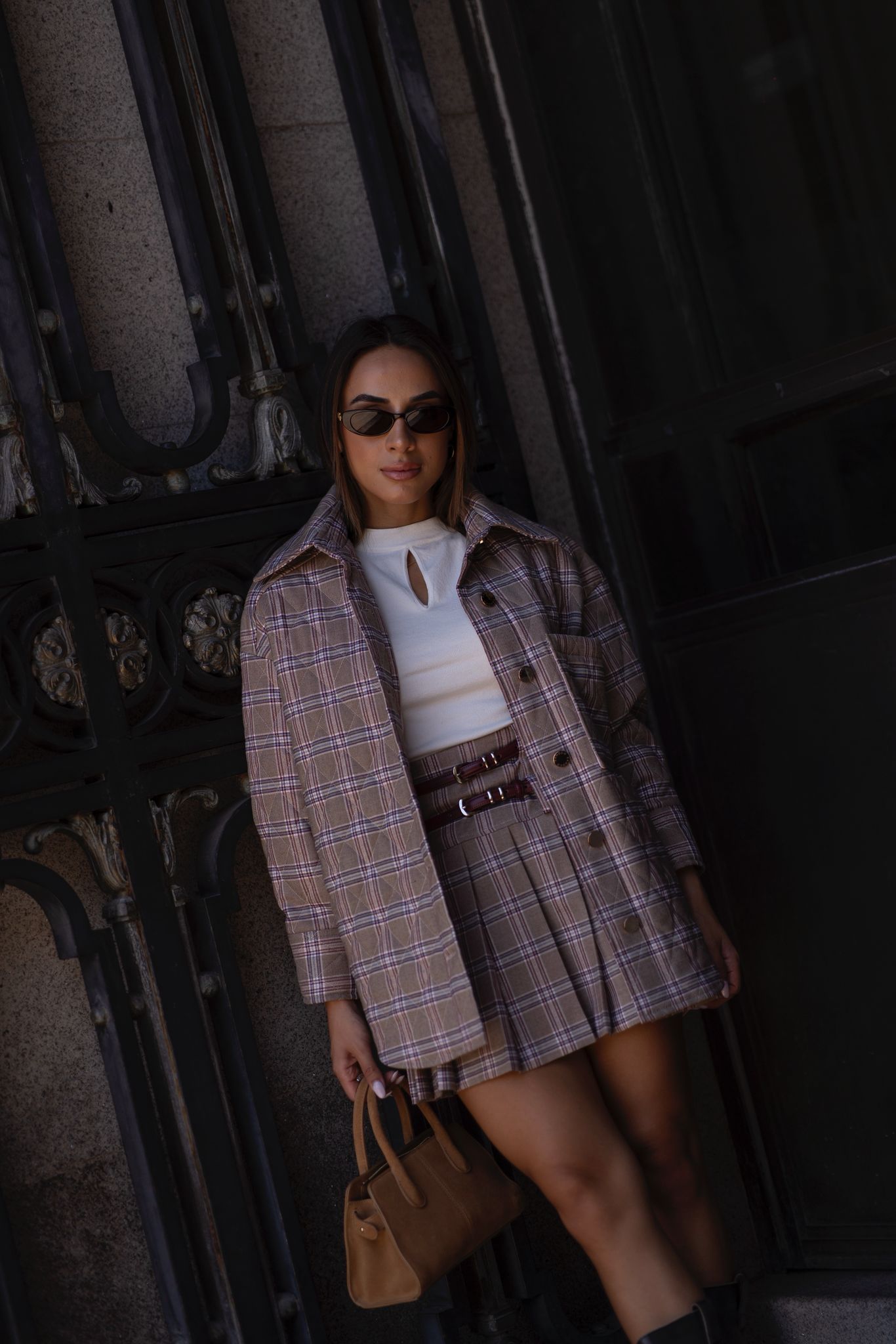 Saia curta em padrão xadrez camel e lilás, com detalhe de cinto duplo na cintura para um toque moderno e elegante. O corte estruturado e o fecho lateral invisível garantem um caimento perfeito e confortável. Combina na perfeição com o casaco coordenado ou com malhas e camisas neutras.
