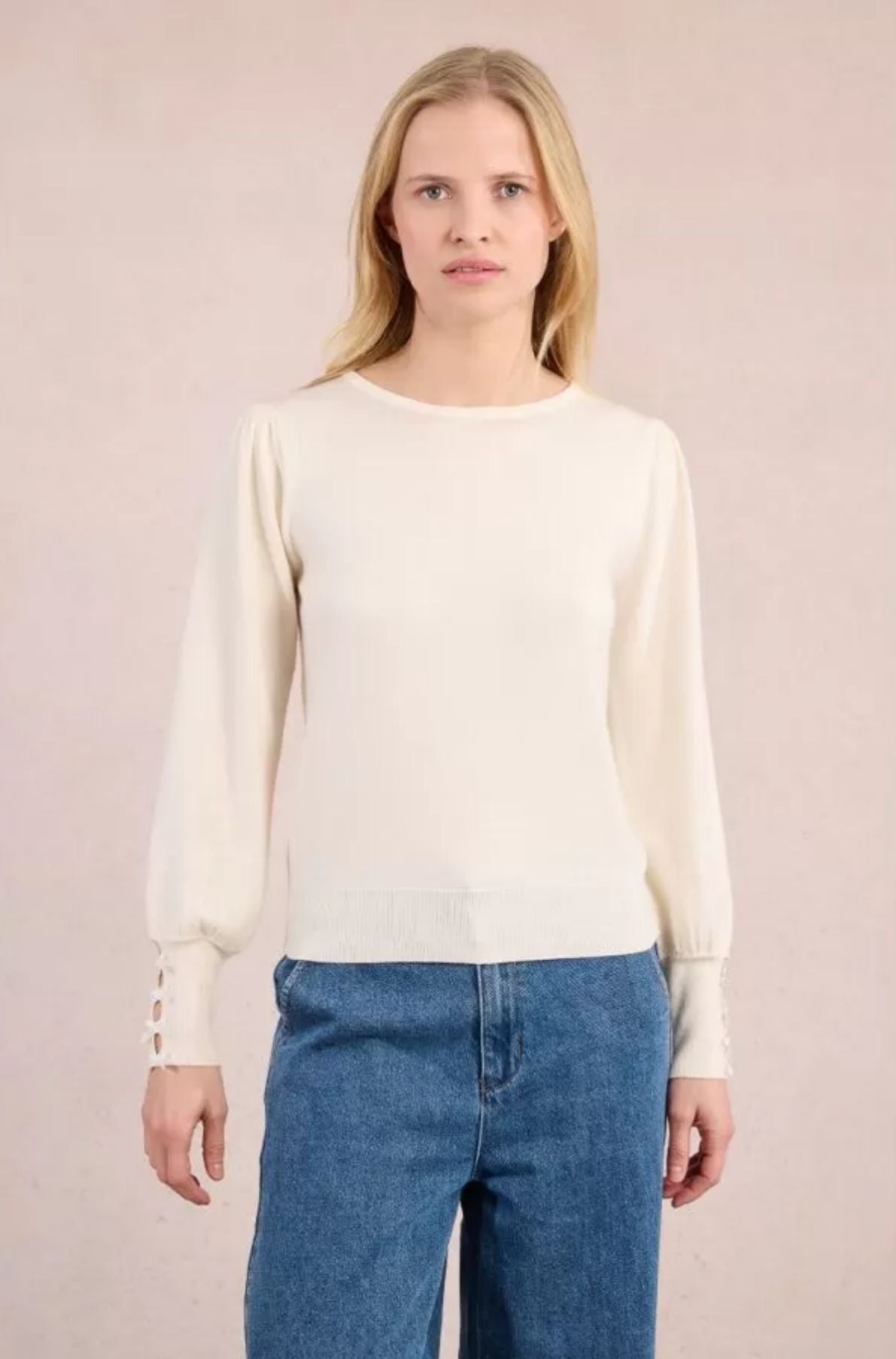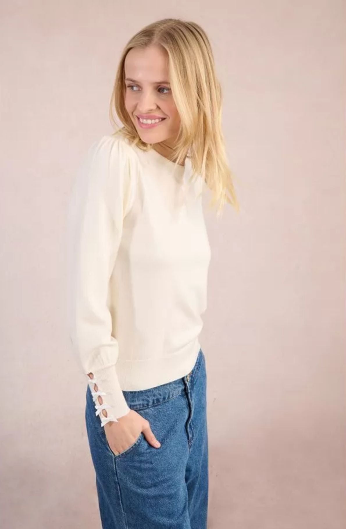 Punhos largos e ajustados, laços de cetim decorativos nas laterais