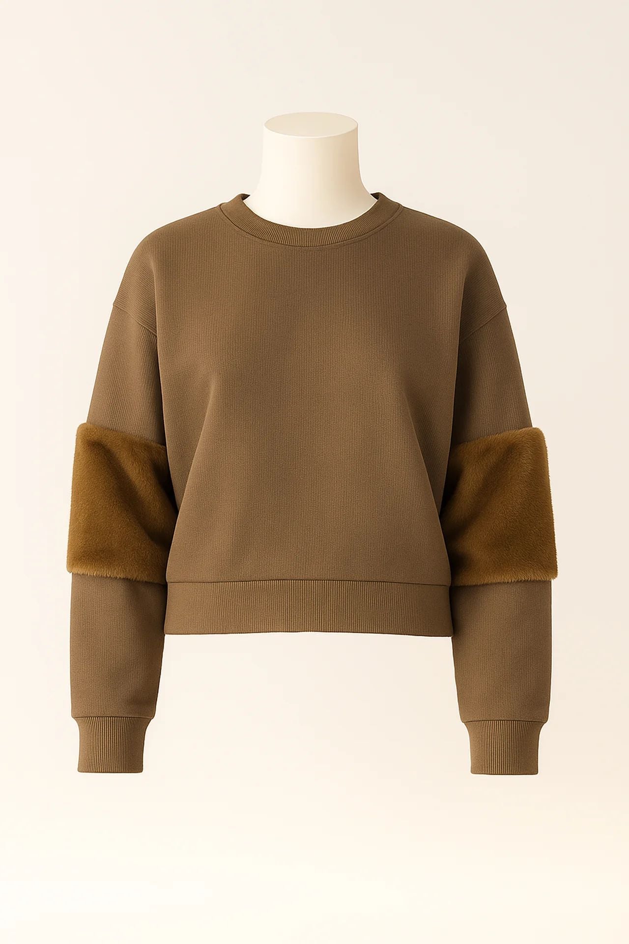 Sweat de malha compacta com encaixe descontraído nos ombros. Mangas com aplicação de pêlo sintético de textura suave, criando contraste visual e táctil. Bainha e punhos canelados para manter a forma.