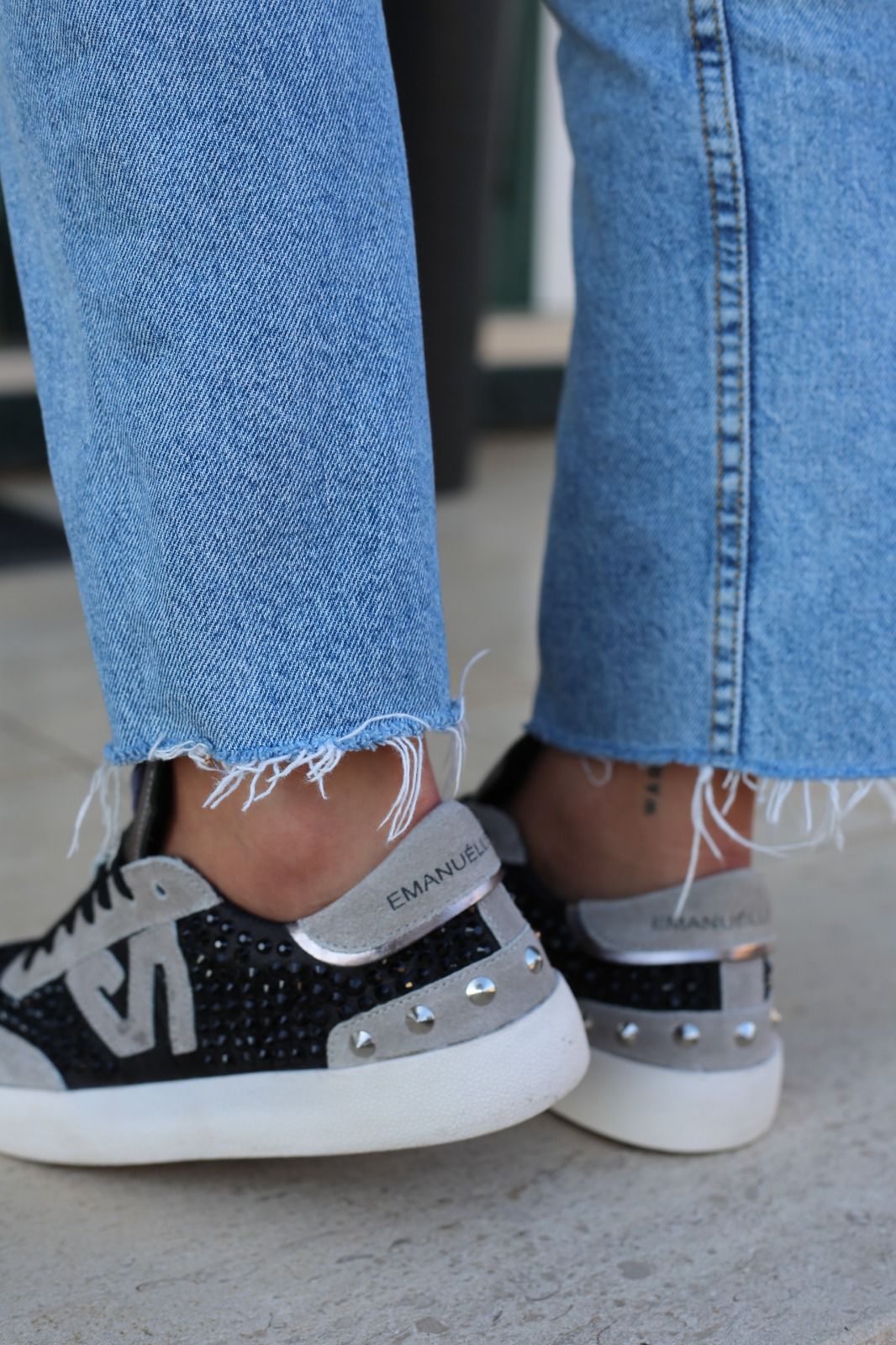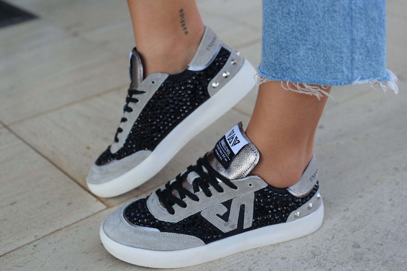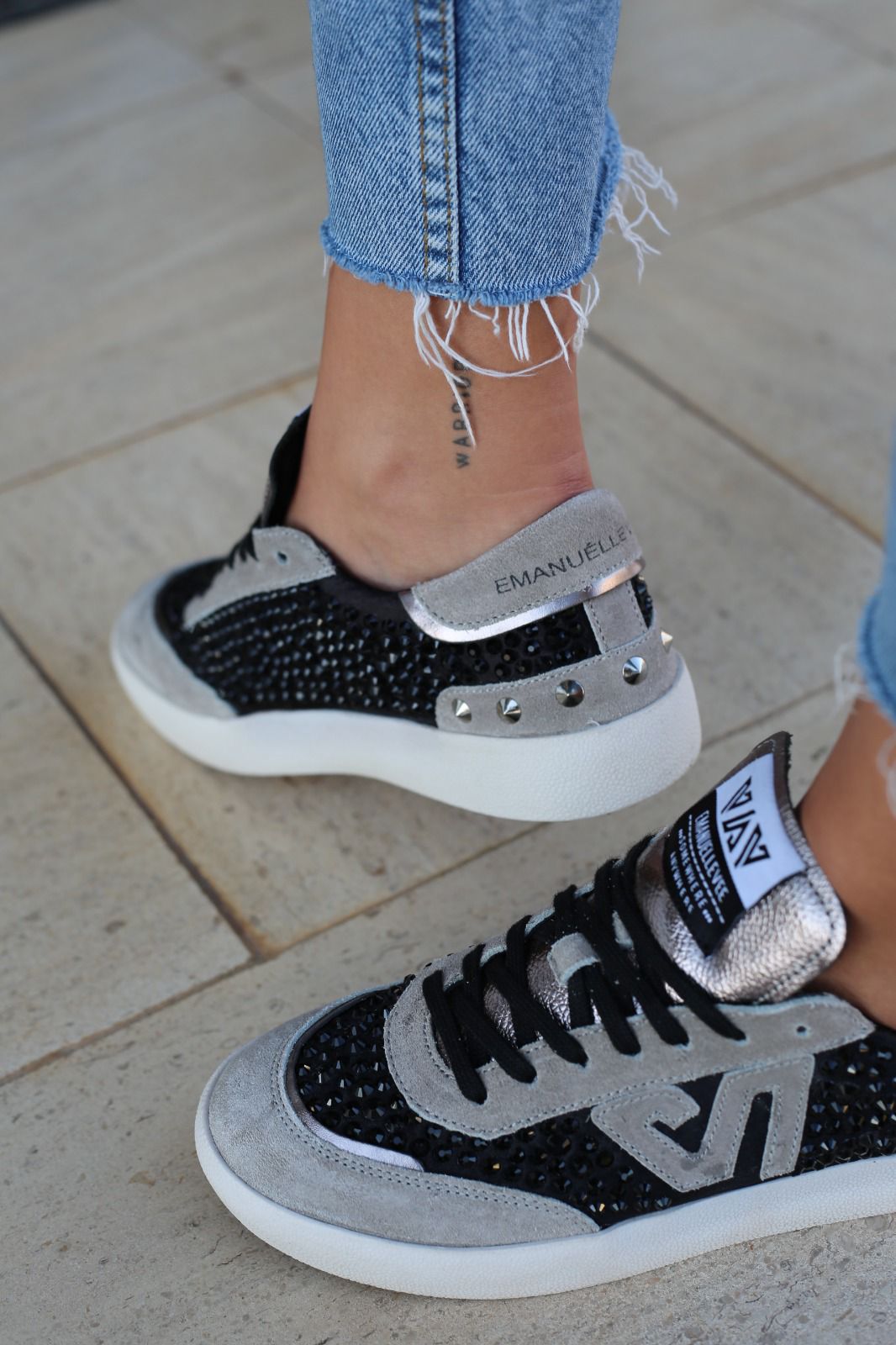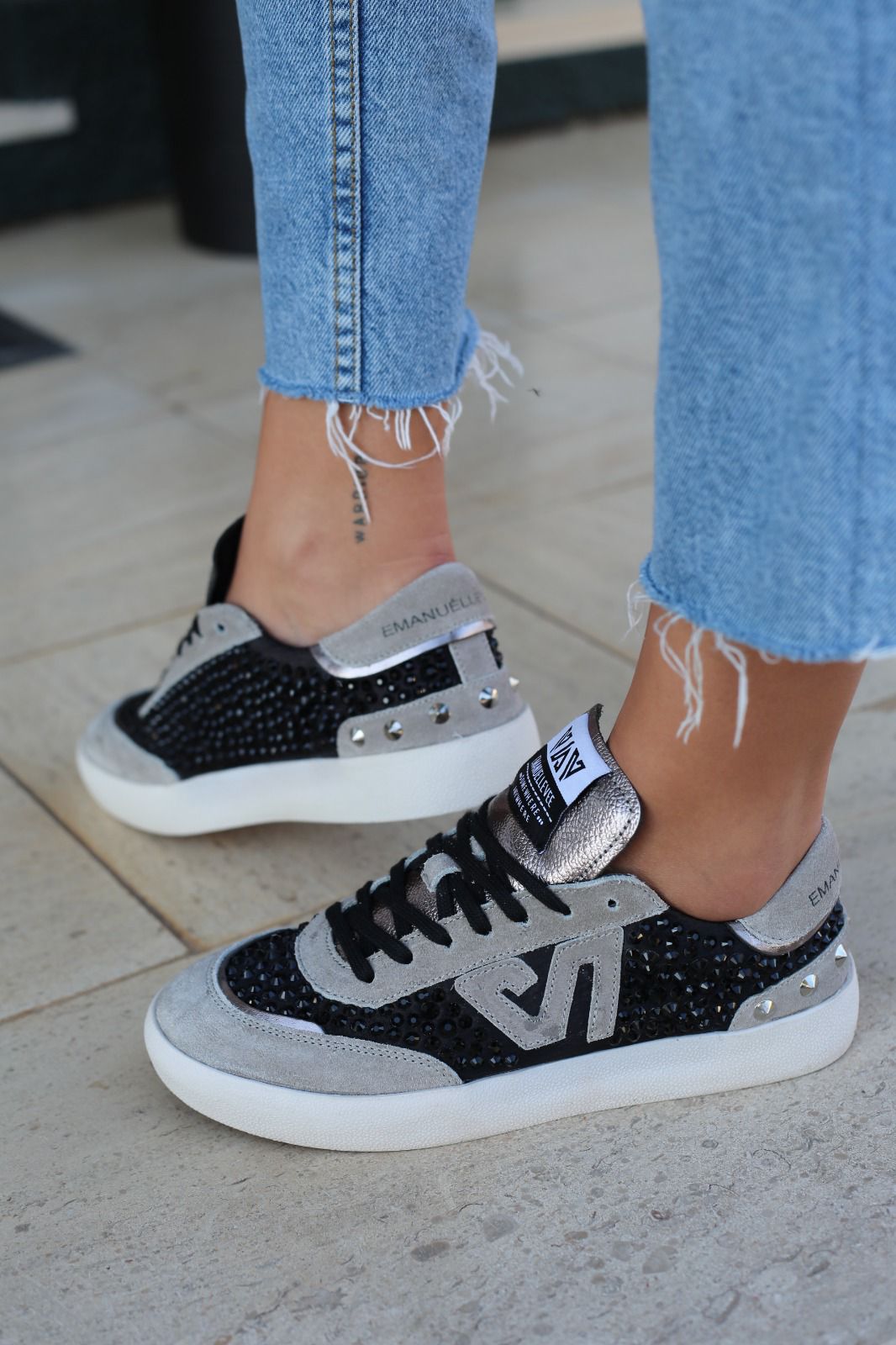 Com detalhes em camurça cinzenta, aplicação de cristais pretos e acabamentos metálicos prateados, estes ténis elevam qualquer produção casual com um toque de sofisticação.
