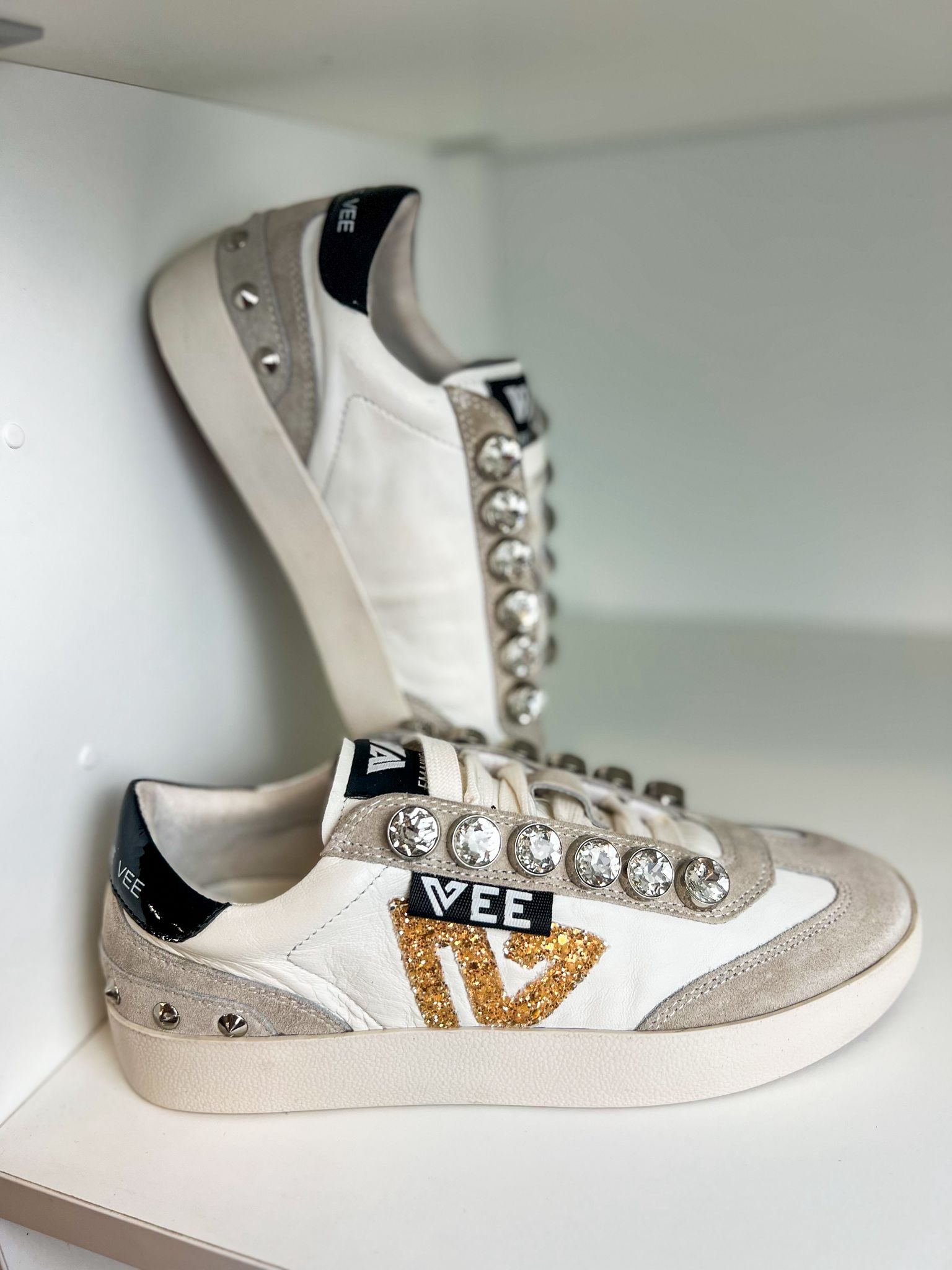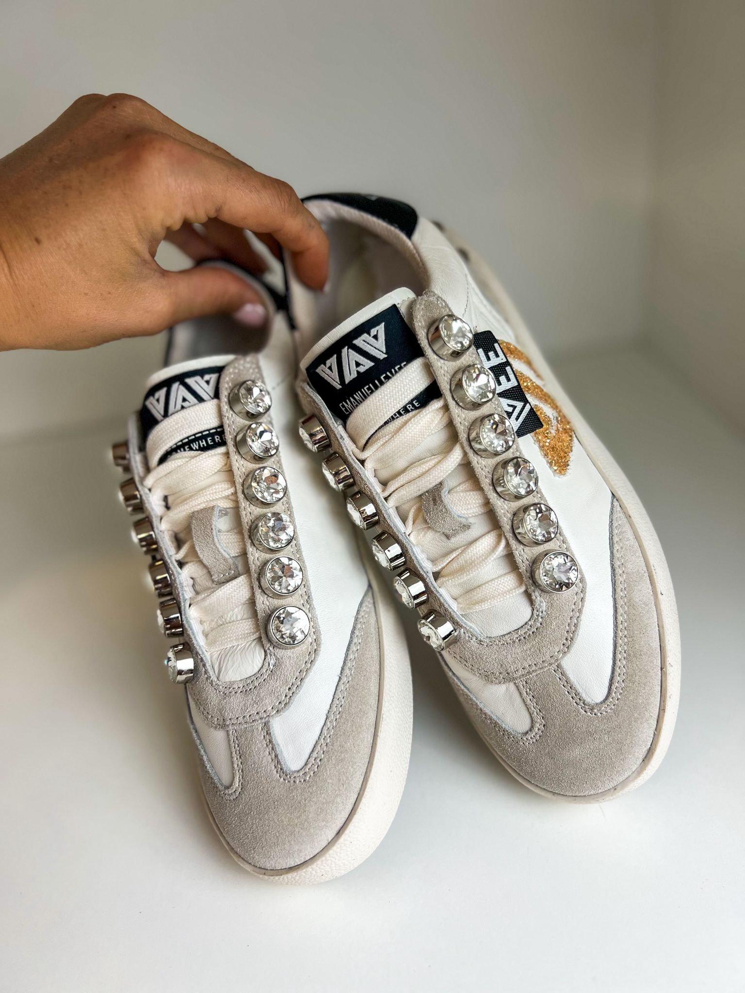 Os ténis perfeitos para quem procura conforto com um toque de luxo. Este modelo exclusivo da Emanuelle Vee destaca-se pelos cristais aplicados na zona dos atacadores e calcanhar, que garantem brilho e sofisticação em cada passo. O logo lateral em glitter dourado acrescenta personalidade e modernidade, tornando-os ideais para elevar qualquer look casual.