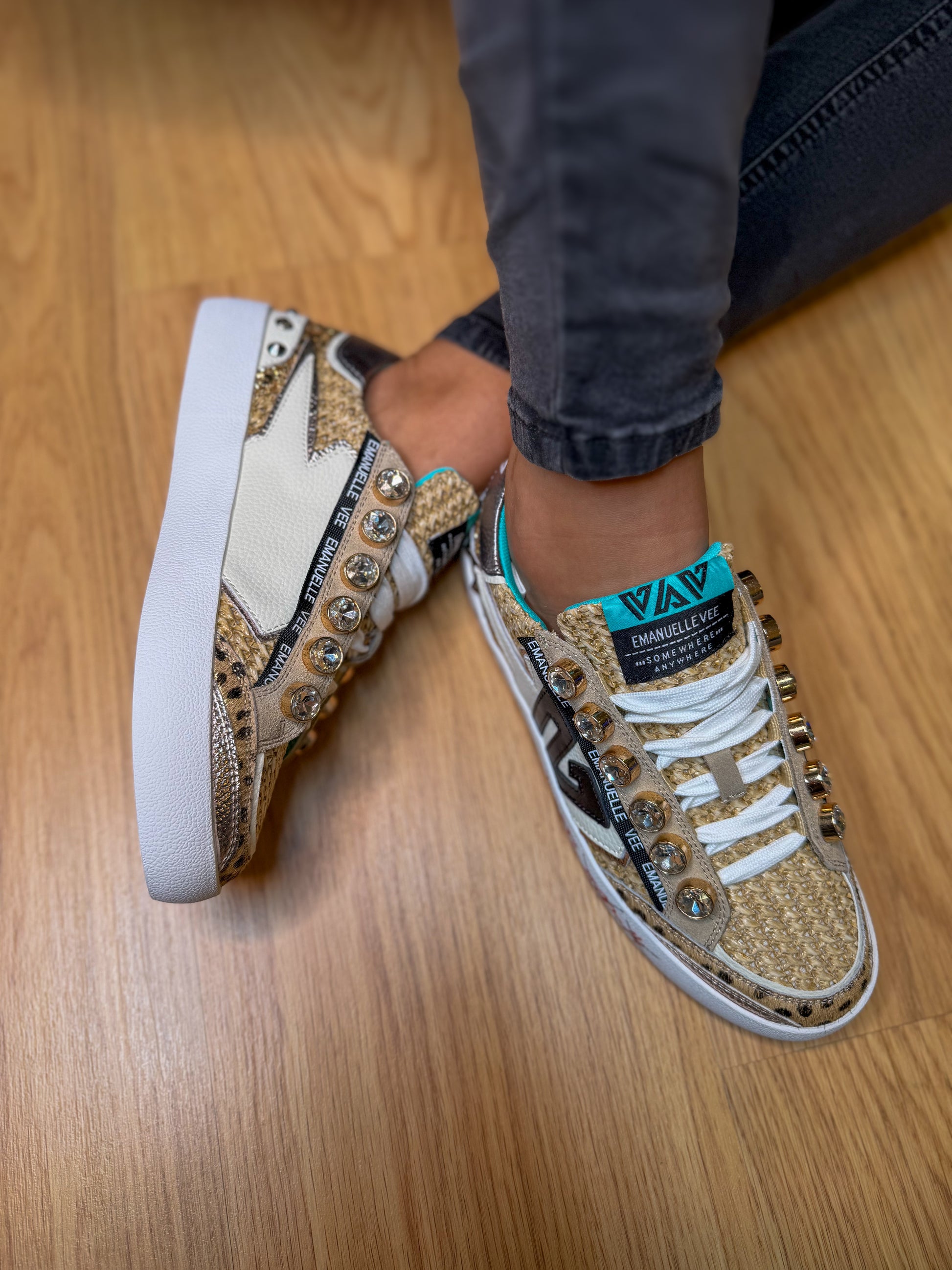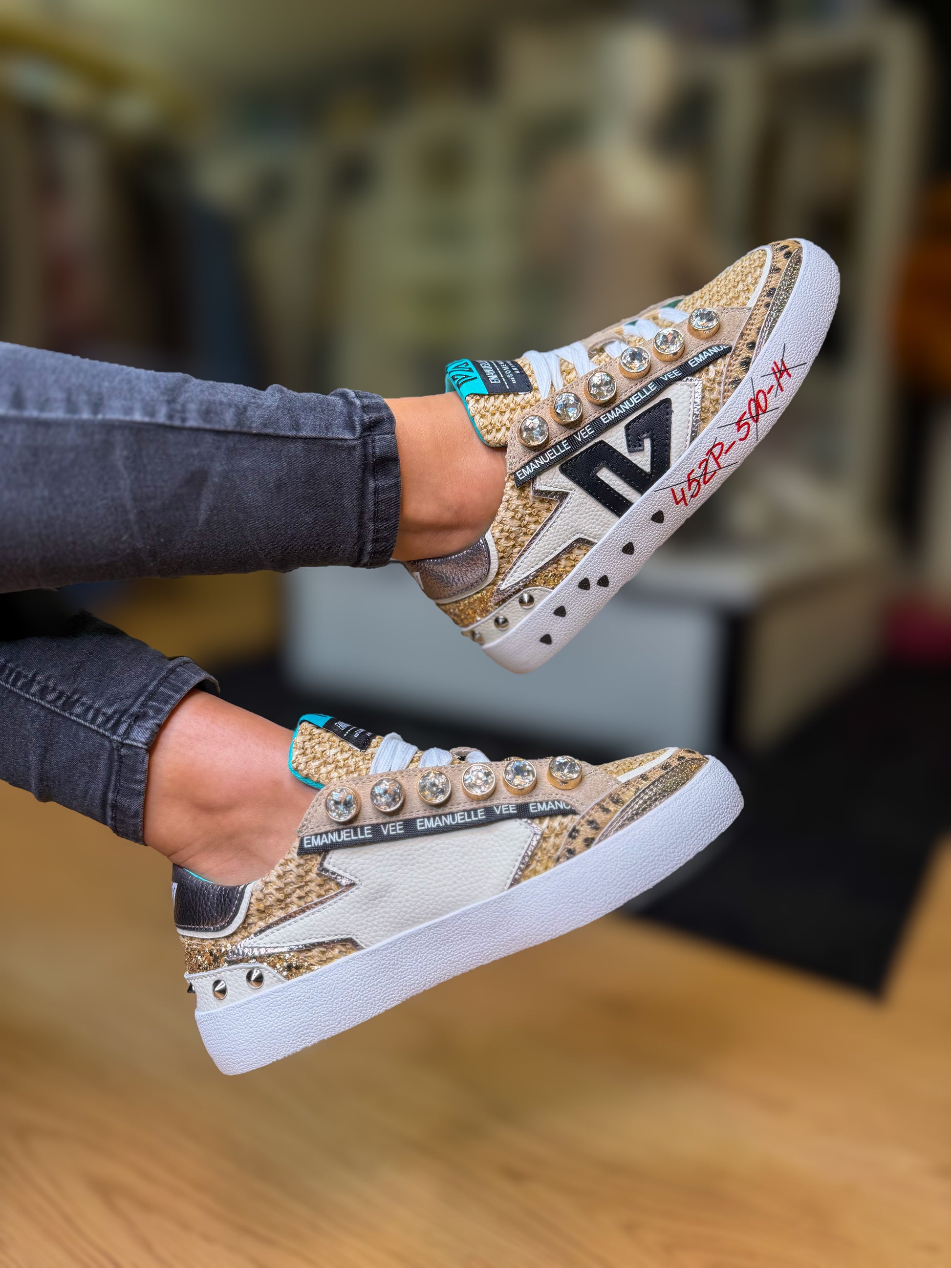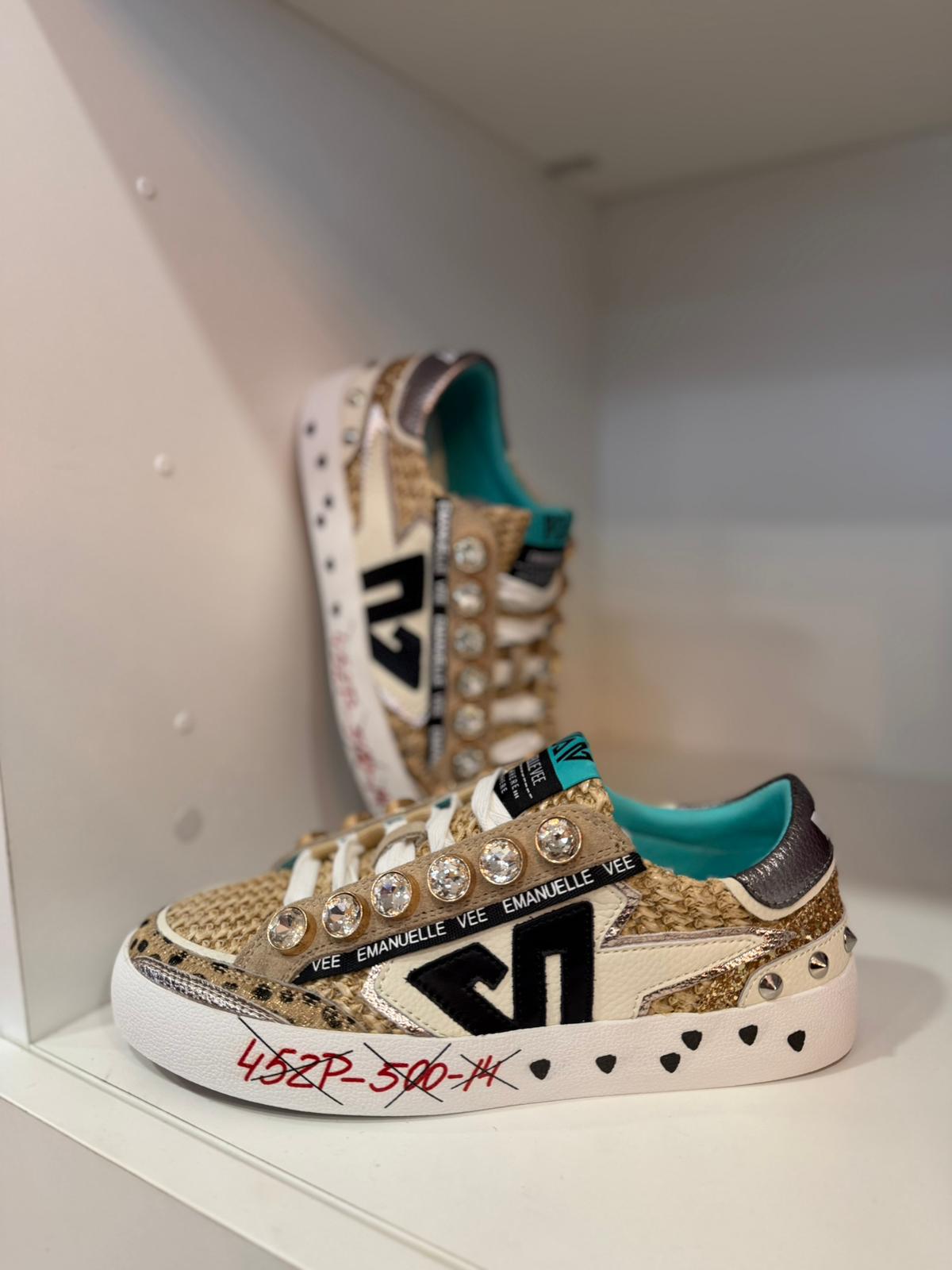 Confeccionados com texturas naturais, aplicações em brilho dourado e pedrarias decorativas, estes ténis destacam-se pelo seu carácter único e acabamento premium. A sola elevada garante conforto e estilo, enquanto os detalhes metálicos e personalizados conferem um toque irreverente e elegante.