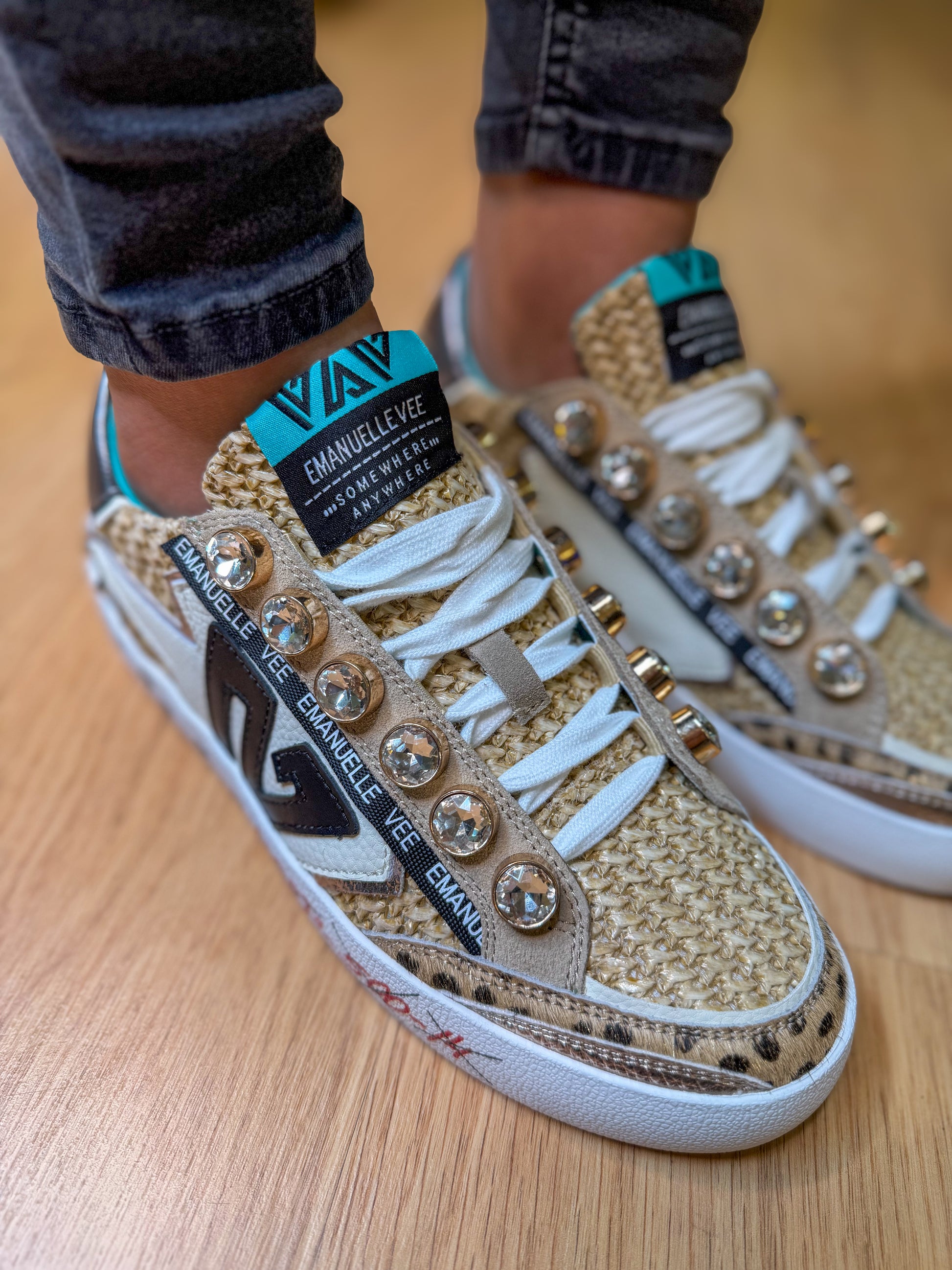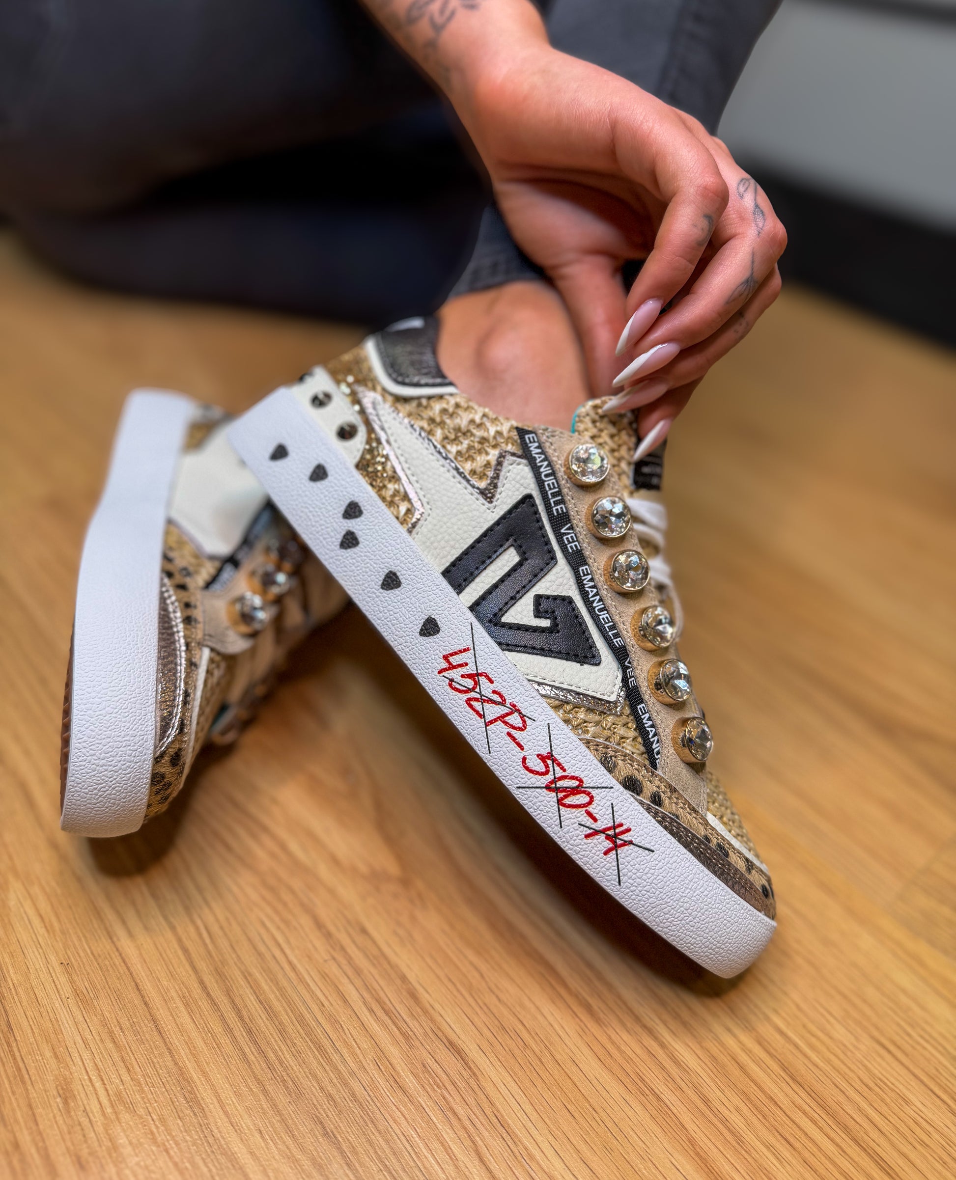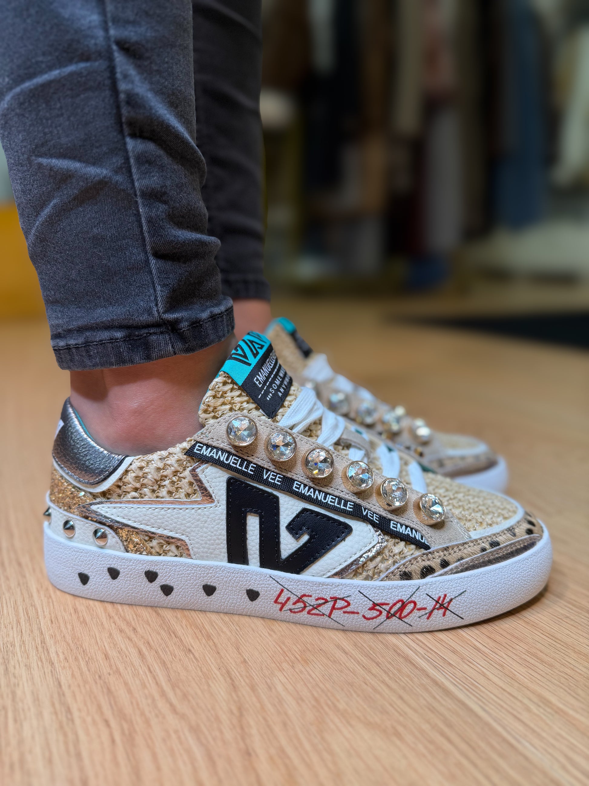 Confeccionados com texturas naturais, aplicações em brilho dourado e pedrarias decorativas, estes ténis destacam-se pelo seu carácter único e acabamento premium. A sola elevada garante conforto e estilo, enquanto os detalhes metálicos e personalizados conferem um toque irreverente e elegante.