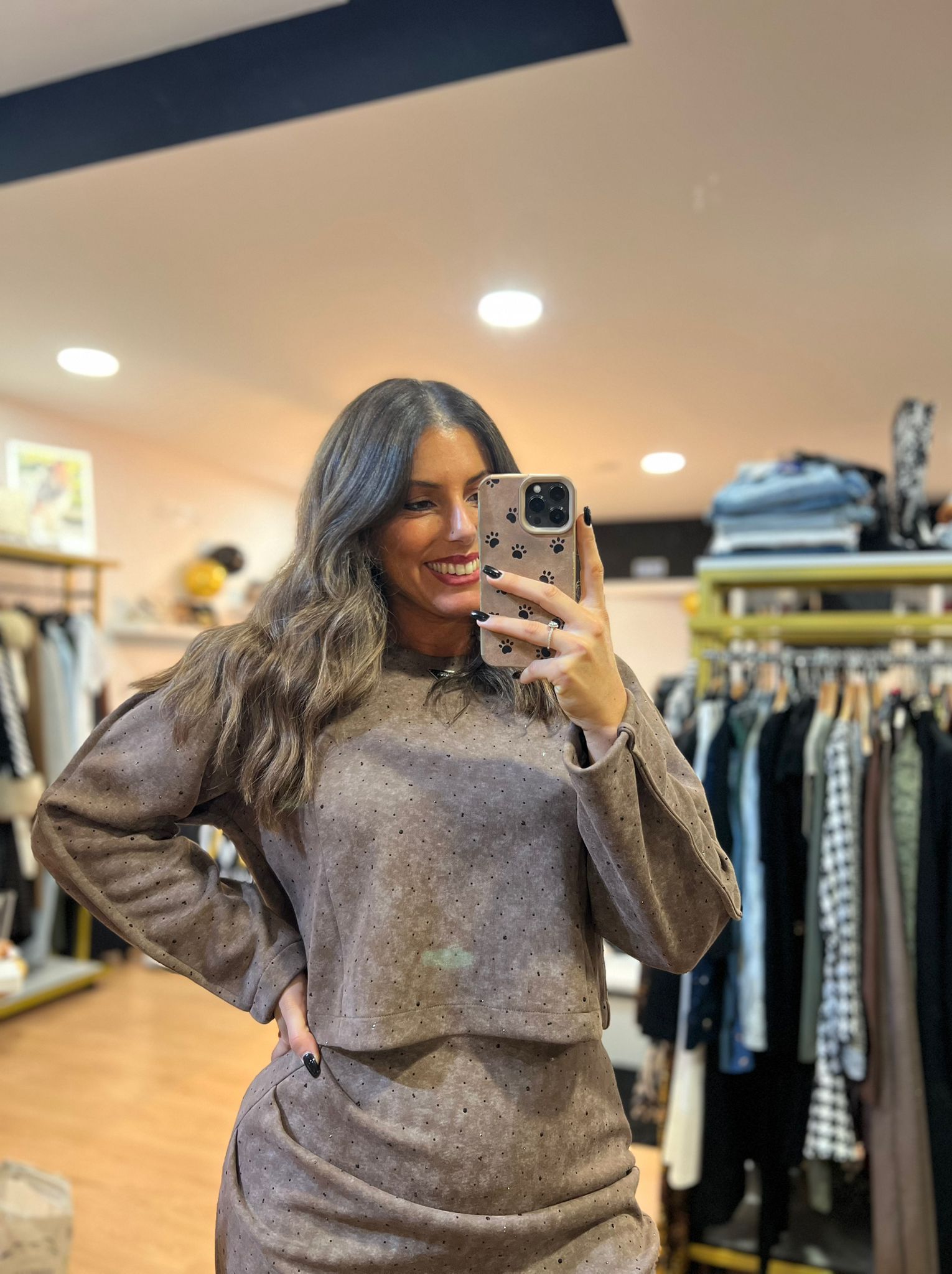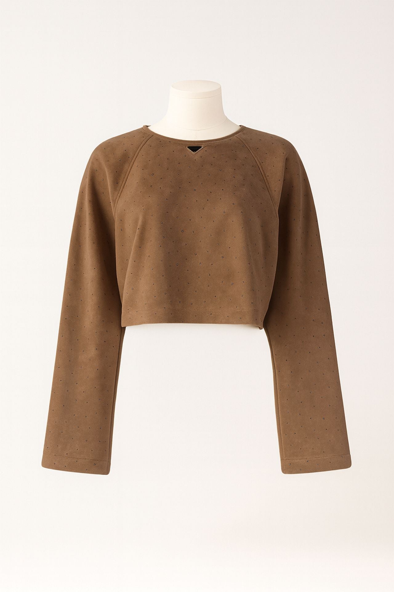 Top curto em tecido de acabamento pele de pêssego, caracterizado pelo toque aveludado e suave. As aplicações brilhantes criam um reflexo subtil e elegante sobre a superfície mate. Apresenta corte reto, mangas compridas e decote redondo.