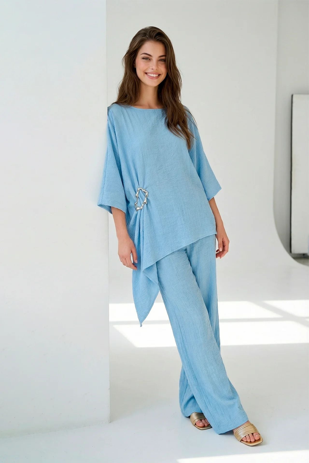 Túnica assimétrica com manga ampla, destaca-se pela fluidez do tecido e pela construção drapeada que envolve o corpo com naturalidade. A silhueta ampla é marcada por uma aplicação metálica de inspiração orgânica, colocada lateralmente, criando um efeito de franzido e movimento.