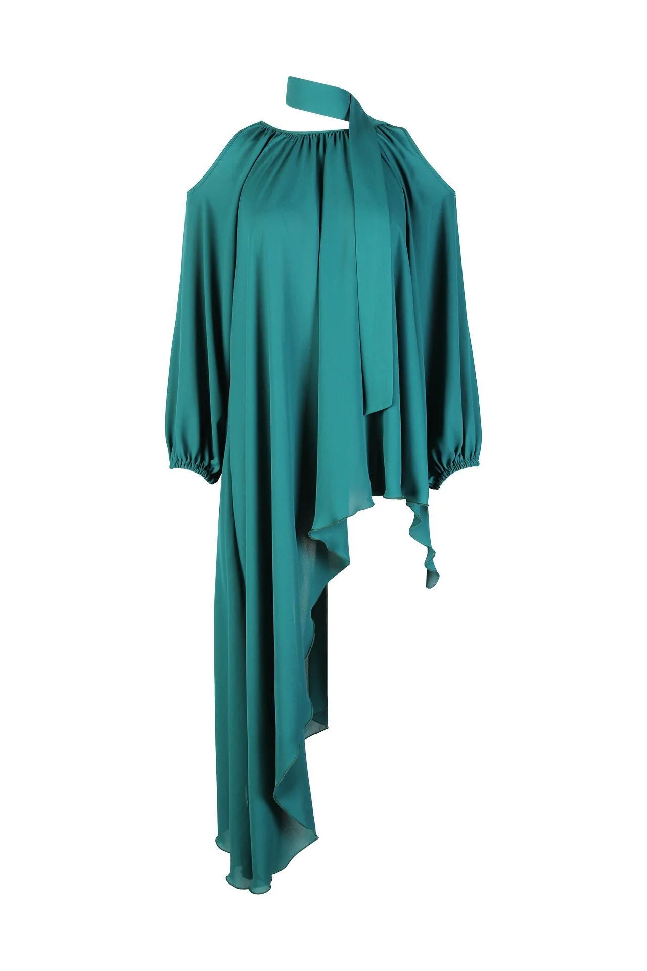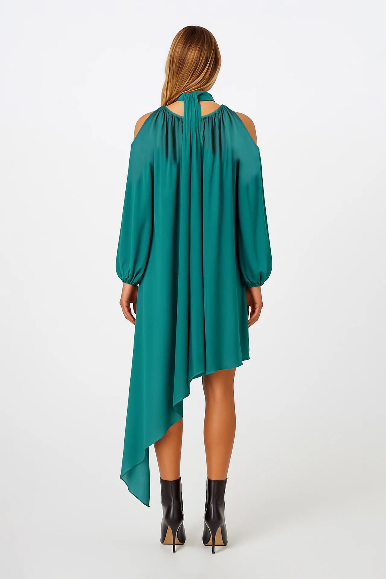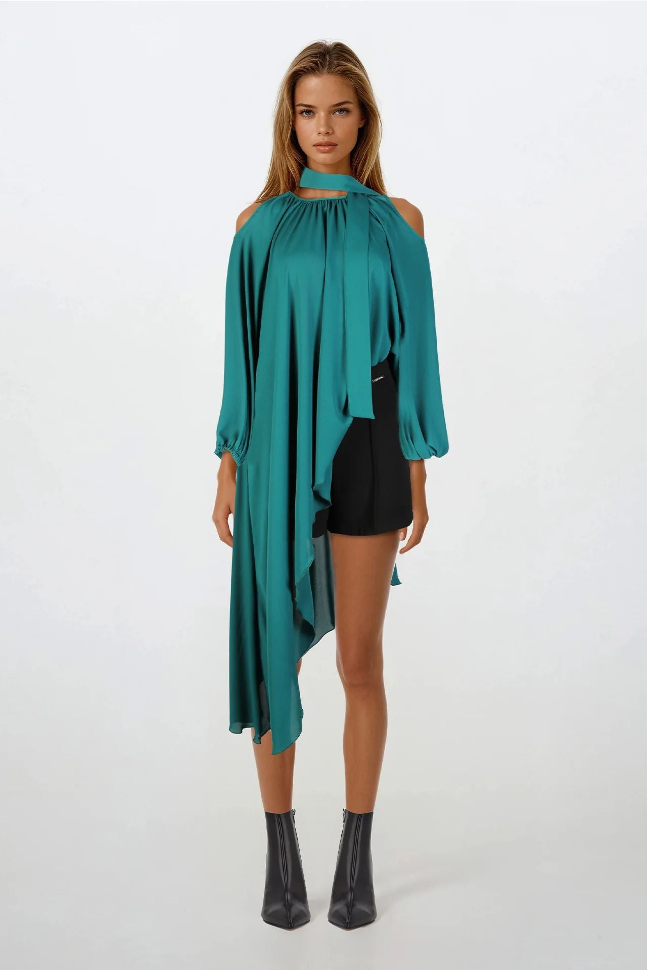 Túnica de corte assimétrico, confecionada em tecido acetinado de toque suave e brilho discreto. Com mangas compridas e decote redondo, esta peça destaca-se pelo detalhe do laço, que acrescenta um toque feminino e sofisticado.