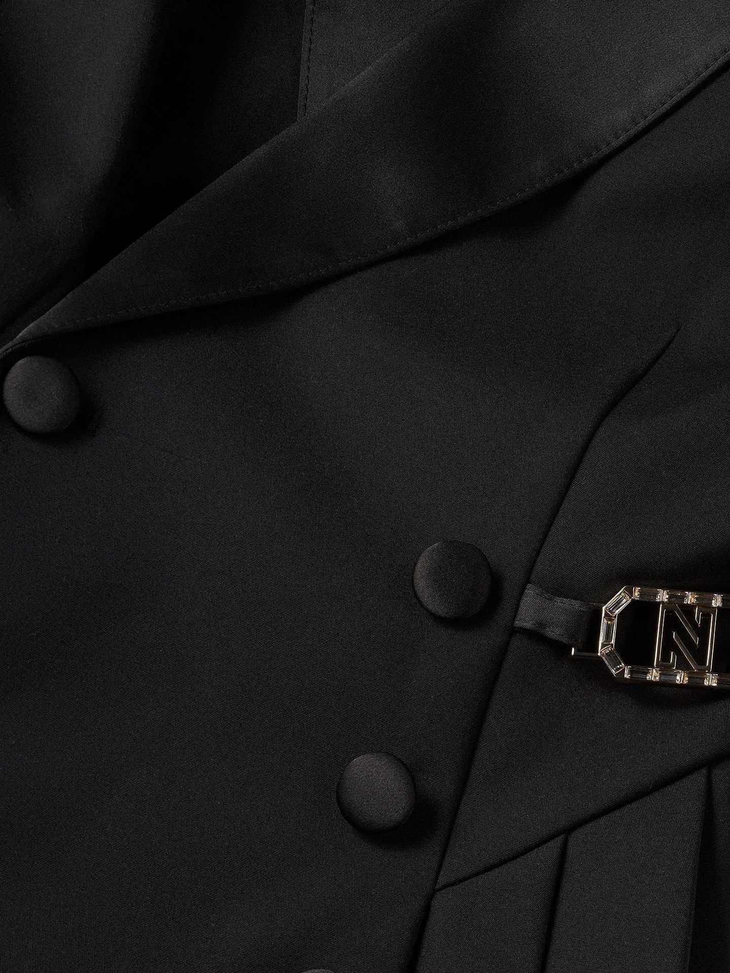 Vestido blazer de abotoamento duplo com gola de lapela em cetim, fivela com o logo NIKKIE e modelagem evasê.